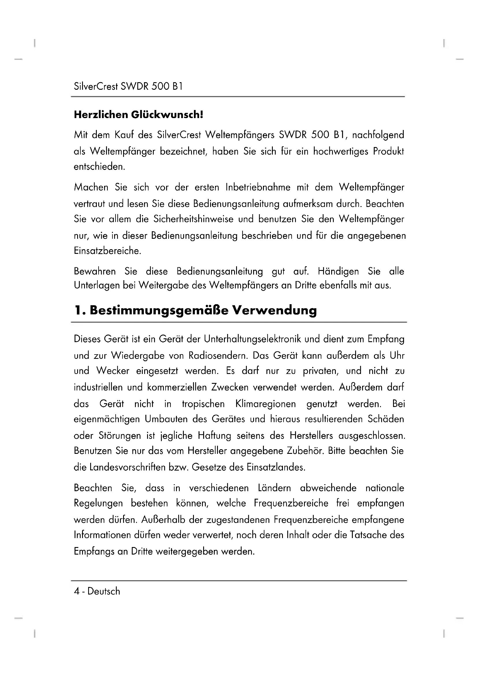 Dieses Gerät ist ein Gerät der Unterhaltungselektronik und dient zum Empfang und zur Wiedergabe von Radiosendern. Das Gerät kann außerdem als Uhr und Wecker eingesetzt werden. Es darf nur zu privaten, und nicht zu industriellen und kommerziellen Zwecken verwendet werden. Außerdem darf das Gerät nicht in tropischen Klimaregionen genutzt werden. Bei eigenmächtigen Umbauten des Gerätes und hieraus resultierenden Schäden oder Störungen ist jegliche Haftung seitens des Herstellers ausgeschlossen. Benutzen Sie nur das vom Hersteller angegebene Zubehör. Bitte beachten Sie die Landesvorschriften bzw. Gesetze des Einsatzlandes. Beachten Sie, dass in verschiedenen Ländern abweichende nationale Regelungen bestehen können, welche Frequenzbereiche frei empfangen werden dürfen. Außerhalb der zugestandenen Frequenzbereiche empfangene Informationen dürfen weder verwertet, noch deren Inhalt oder die Tatsache des Empfangs an Dritte weitergegeben werden.SilverCrest SWDR 500 B1 Deutsch - 5
