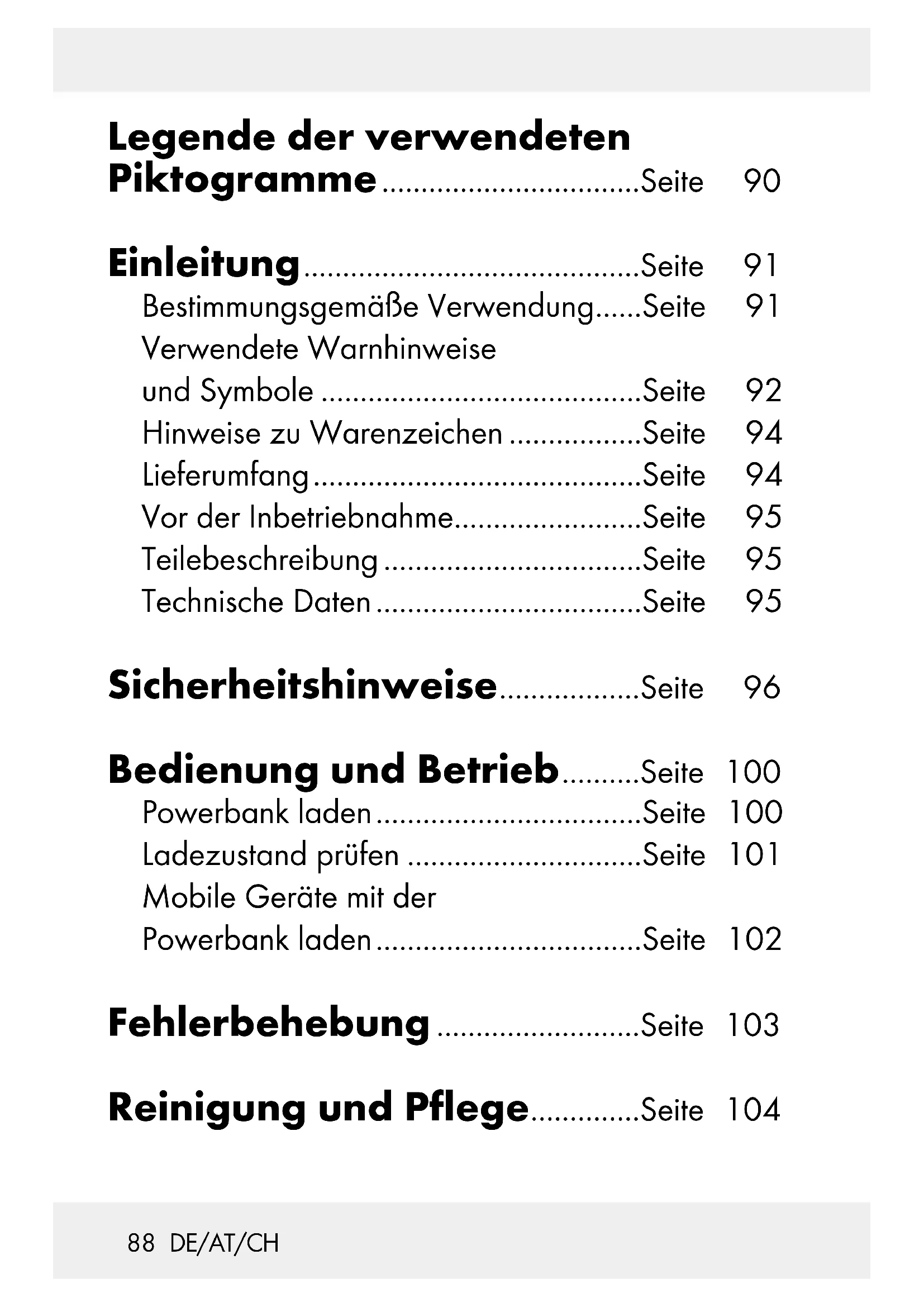 reagiert nicht auf Tastendruck oder wenn ein Gerät an- geschlossen wird, obwohl der Akku geladen ist. Die Stromaufnahme des angeschlossenen Gerätes ist zu hoch. Dadurch wurde die interne Überstromsicherung ausgelöst. Bitte trennen Sie das zu ladende Gerät vom Strom und suchen Sie eine andere Powerbank zum Aufladen. Reinigung und Pflege Es befinden sich keine zu wartenden Teile im Inneren. Eindringende Feuchtigkeit kann zu einer Beschädi- gung des Produkts führen. Stellen Sie sicher, dass bei der Reinigung keine Feuchtigkeit in das Produkt eindringt, um eine irreparable Beschädigung des Produktes zu vermeiden.105 DE/AT/CH Verwenden Sie keine ätzenden, scheuernden oder lösungsmittelhaltigen Reinigungsmittel. Diese können die Oberflächen des Produkts angreifen. Reinigen Sie das Produkt ausschließlich mit einem leicht feuchten Tuch und einem milden Spülmittel. Achten Sie darauf, dass sämtliche Steckerkon- takte frei von Schmutz und Fremdkörpern sind. Lagerung bei Nichtgebrauch Lagern Sie das Produkt an einem trockenen und staubfreien Ort ohne direkte Sonnenein- strahlung. Bei längerer Lagerung sollte de r integrierte Akku voll geladen werden, um die Lebensdauer zu verlängern. Laden Sie den integrierten Akku bei längerer Nichtbenutzung regelmäßig nach. Dies ist zur Schonung des Akkus erforderlich.106 DE/AT/CH Entsorgung Die Verpackung besteht aus umweltfreundlich en Ma- terialien, die Sie über die örtlichen Recyclingstellen entsorgen können. Möglichkeiten zur Entsorgung des ausgedienten Produkts erfahren Sie bei Ihrer Gemeinde oder Stadtverwaltung. Das nebenstehende Symbol einer durch- gestrichenen Mülltonne auf Rädern zeigt an, dass dieses Gerät der Richtlinie 2012/19/EU unterliegt. Diese Richtlinie besagt, dass Sie dieses Gerät am Ende seiner Nutzungszeit nicht mit dem nor malen Haushaltsmüll entsorgen dür- fen, sonde rn in speziell eingerichteten Sammelstellen, Wert stoffhöfen oder Entsorgungsbetrieben abgeb