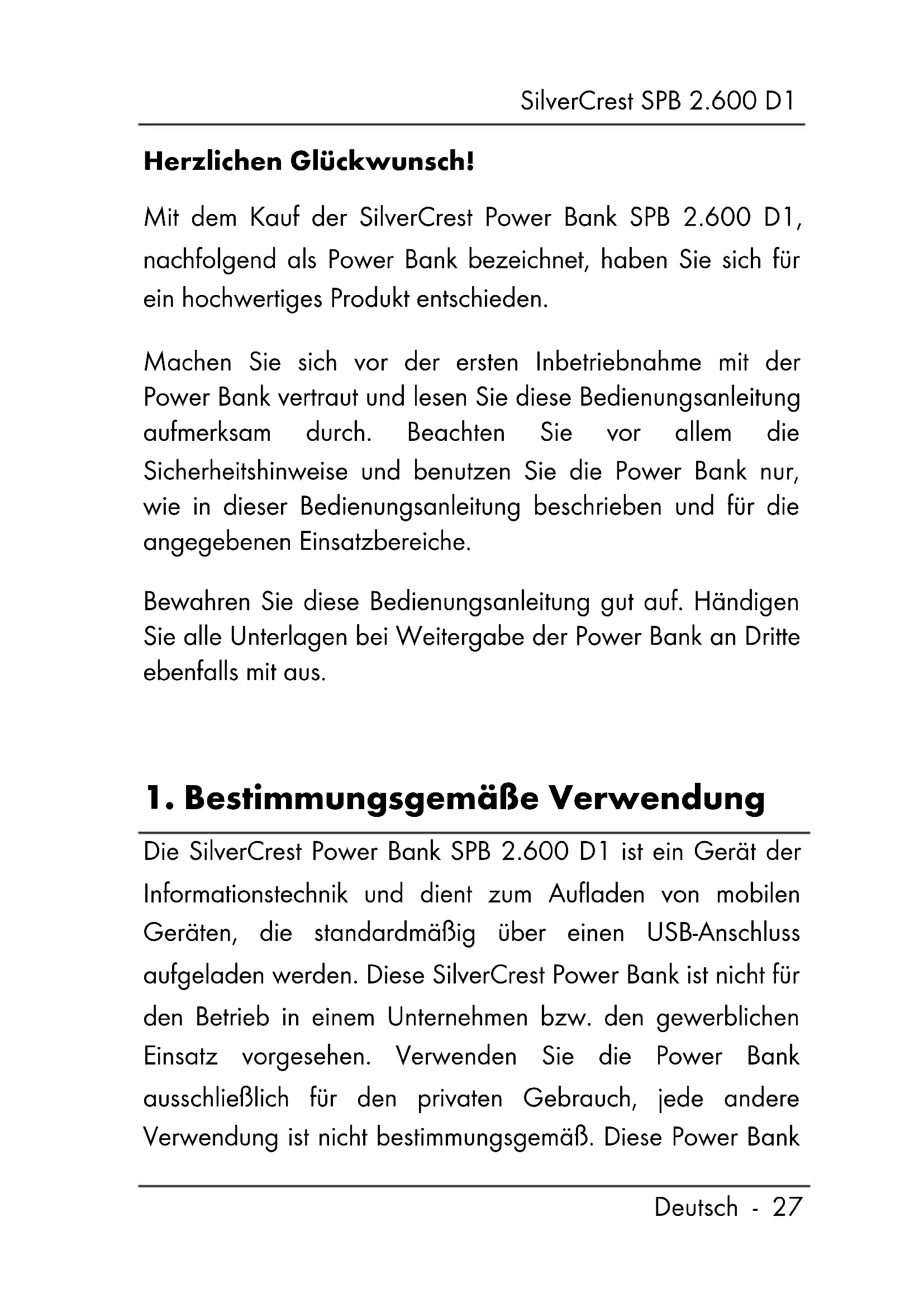 Serviceabwicklung .......................................... 43SilverCrest SPB 2.600 D1 Deutsch - 27 Herzlichen Glückwunsch! Mit dem Kauf der SilverCrest Power Bank SPB 2.600 D1, nachfolgend als Power Bank bezeichnet, haben Sie sich für ein hochwertiges Produkt entschieden. Machen Sie sich vor der ersten Inbetriebnahme mit der Power Bank vertraut und lesen Sie diese Bedienungsanleitung aufmerksam durch. Beachten Sie vor allem die Sicherheitshinweise und benutzen Sie die Power Bank nur, wie in dieser Bedienungsanleitung beschrieben und für die angegebenen Einsatzbereiche. Bewahren Sie diese Bedienungsanleitung gut auf. Händigen Sie alle Unterlagen bei Weitergabe der Power Bank an Dritte ebenfalls mit aus.