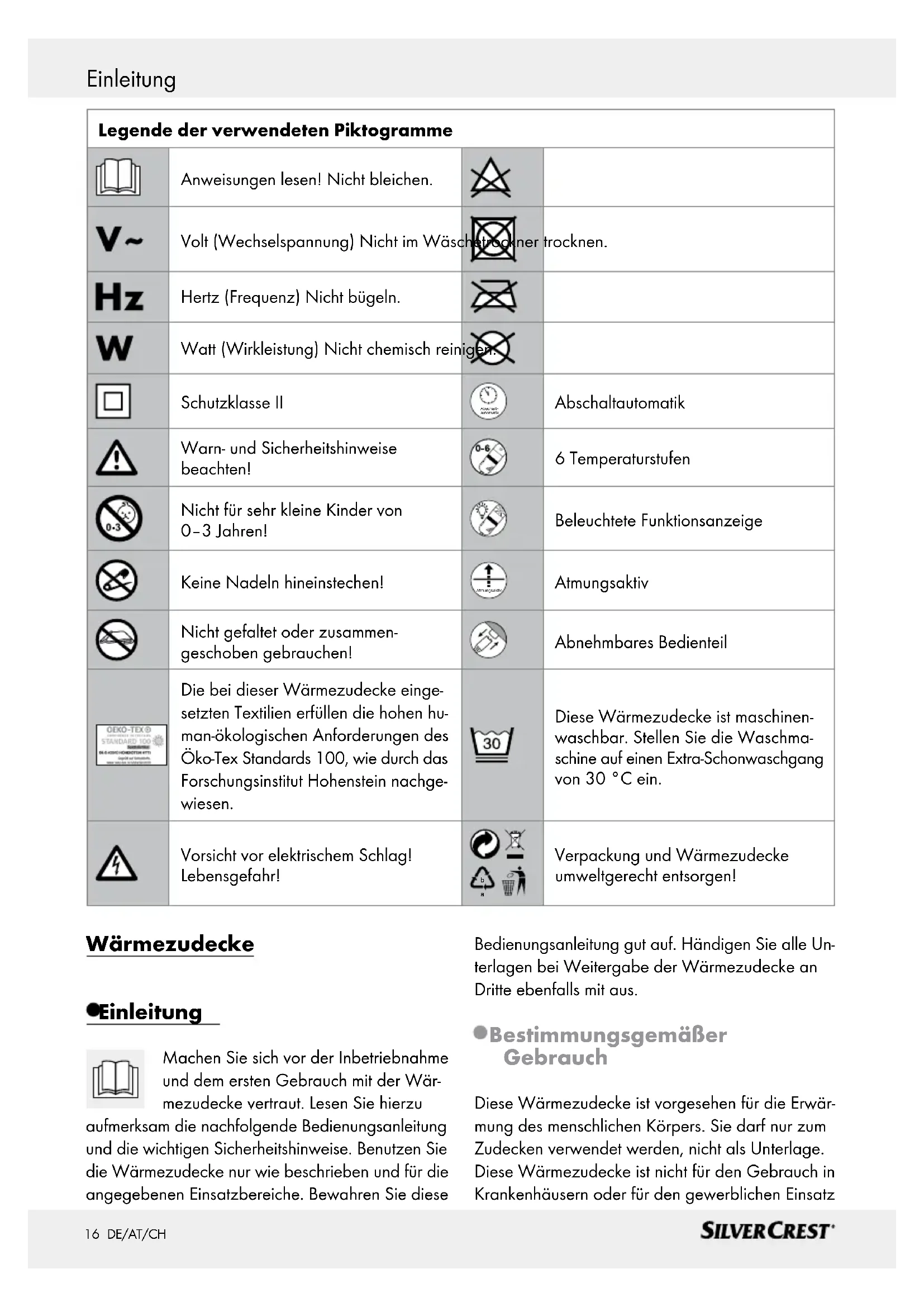 Verpackung und Wärmezudecke umweltgerecht entsorgen! Wärmezudecke Einleitung Machen Sie sich vor der Inbetriebnahme und dem ersten Gebrauch mit der Wär- mezudecke vertraut. Lesen Sie hierzu aufmerksam die nachfolgende Bedienungsanleitung und die wichtigen Sicherheitshinweise. Benutzen Sie die Wärmezudecke nur wie beschrieben und für die angegebenen Einsatzbereiche. Bewahren Sie diese Bedienungsanleitung gut auf. Händigen Sie alle Un- terlagen bei Weitergabe der Wärmezudecke an Dritte ebenfalls mit aus. Bestimmungsgemäßer Gebrauch Diese Wärmezudecke ist vorgesehen für die Erwär- mung des menschlichen Körpers. Sie darf nur zum Zudecken verwendet werden, nicht als Unterlage. Diese Wärmezudecke ist nicht für den Gebrauch in Krankenhäusern oder für den gewerblichen Einsatz17 DE/AT/CH Einleitung / Wichtige Sicherheitshinweise bestimmt. Es dürfen insbesondere keine Säuglinge, Kleinkinder, wärmeunempfindliche oder hilflose Per- sonen und keine Tiere erwärmt werden. Eine an- dere Verwendung als zuvor beschrieben oder eine Veränderung der Wärmezudecke ist nicht zulässig und kann zu Verletzungen und / oder Beschädigun- gen der Wärmezudecke führen. Für Schäden, deren Ursachen in bestimmungswidrigen Anwendungen liegen, übernimmt der Hersteller keine Haftung. Teilebeschreibung