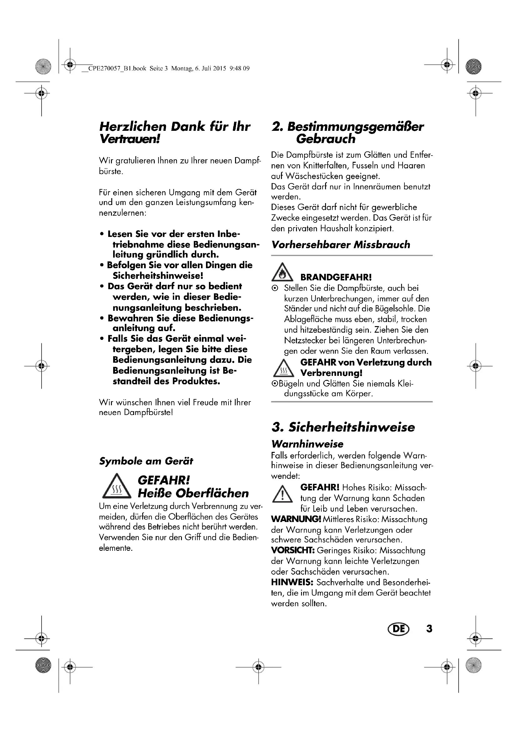 - Falls Sie das Gerät einmal wei- tergeben, legen Sie bitte diese Bedienungsanleitung dazu. Die Bedienungsanleitung ist Be- standteil des Produktes. Wir wünschen Ihnen viel Freude mit Ihrer neuen Dampfbürste! Symbole am Gerät GEFAHR! Heiße Oberflächen Um eine Verletzung durch Verbrennung zu ver- meiden, dürfen die Oberflächen des Gerätes während des Betriebes nicht berührt werden. Verwenden Sie nur den Griff und die Bedien- elemente.