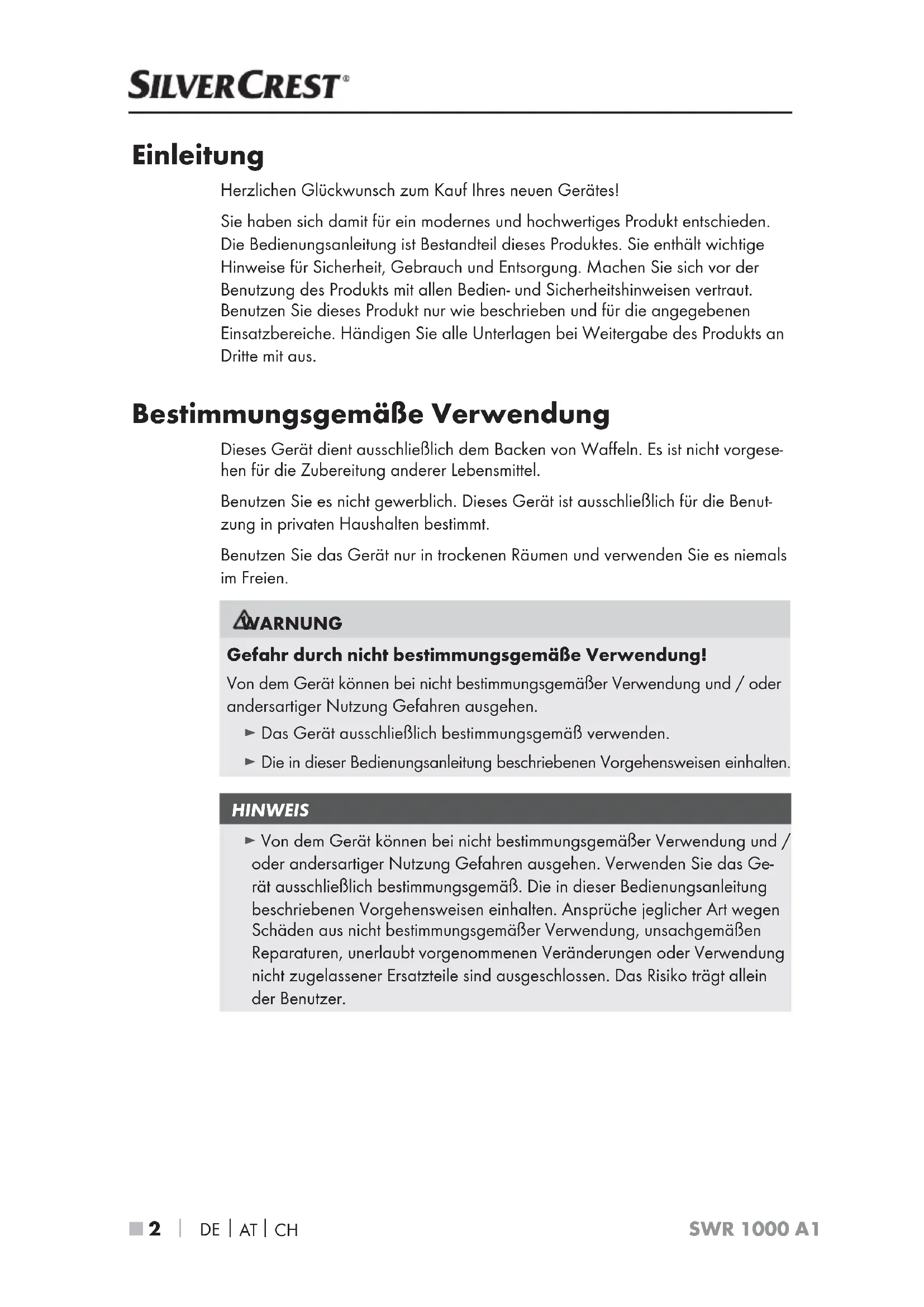 SWR 1000 A1 Einleitung Herzlichen Glückwunsch zum Kauf Ihres neuen Gerätes! Sie haben sich damit für ein modernes und hochwertiges Produkt entschieden. Die Bedienungsanleitung ist Bestandteil dieses Produktes. Sie enthält wichtige Hinweise für Sicherheit, Gebrauch und Entsorgung. Machen Sie sich vor der Benutzung des Produkts mit allen Bedien- und Sicherheitshinweisen vertraut. Benutzen Sie dieses Produkt nur wie beschrieben und für die angegebenen Einsatzbereiche. Händigen Sie alle Unterlagen bei Weitergabe des Produkts an Dritte mit aus. Bestimmungsgemäße Verwendung Dieses Gerät dient ausschließlich dem Backen von Waffeln. Es ist nicht vorgese- hen für die Zubereitung anderer Lebensmittel. Benutzen Sie es nicht gewerblich. Dieses Gerät ist ausschließlich für die Benut- zung in privaten Haushalten bestimmt. Benutzen Sie das Gerät nur in trockenen Räumen und verwenden Sie es niemals im Freien. WARNUNG Gefahr durch nicht bestimmungsgemäße Verwendung! Von dem Gerät können bei nicht bestimmungsgemäßer Verwendung und / oder andersartiger Nutzung Gefahren ausgehen. ► Das Gerät ausschließlich bestimmungsgemäß verwenden. ► Die in dieser Bedienungsanleitung beschriebenen Vorgehensweisen einhalten. HINWEIS ► Von dem Gerät können bei nicht bestimmungsgemäßer Verwendung und / oder andersartiger Nutzung Gefahren ausgehen. Verwenden Sie das Ge- rät ausschließlich bestimmungsgemäß. Die in dieser Bedienungsanleitung beschriebenen Vorgehensweisen einhalten. Ansprüche jeglicher Art wegen Schäden aus nicht bestimmungsgemäßer Verwendung, unsachgemäßen Reparaturen, unerlaubt vorgenommenen Veränderungen oder Verwendung nicht zugelassener Ersatzteile sind ausgeschlossen. Das Risiko trägt allein der Benutzer.DE