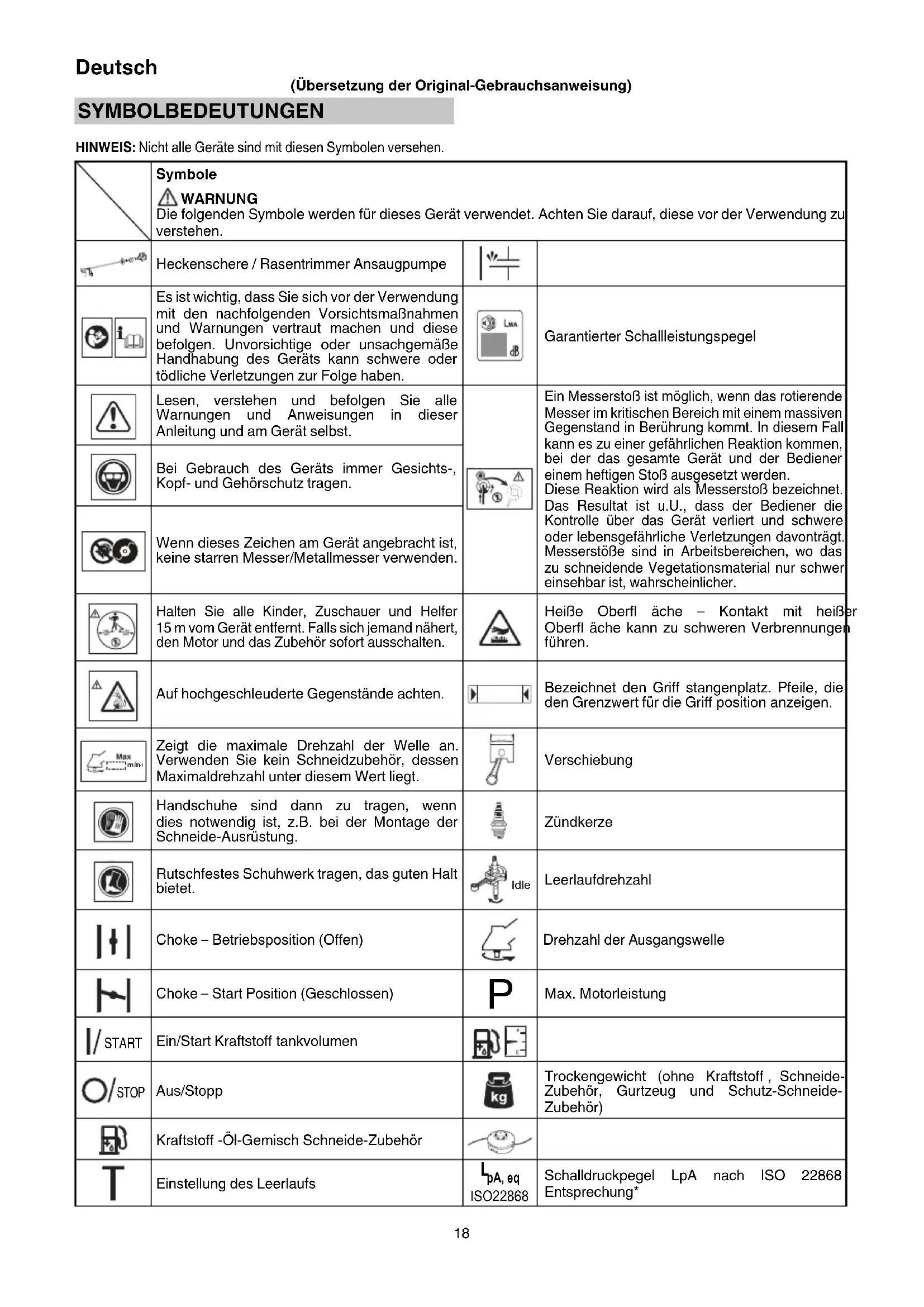 (Übersetzung der Original-Gebrauchsanweisung) SYMBOLBEDEUTUNGEN HINWEIS: Nicht alle Geräte sind mit diesen Symbolen versehen. Symbole WARNUNG Die folgenden Symbole werden für dieses Gerät verwendet. Achten Sie darauf, diese vor der Verwendung zu verstehen. Heckenschere / Rasentrimmer Ansaugpumpe Es ist wichtig, dass Sie sich vor der Verwendung mit den nachfolgenden Vorsichtsmaßnahmen und Warnungen vertraut machen und diese befolgen. Unvorsichtige oder unsachgemäße Handhabung des Geräts kann schwere oder tödliche Verletzungen zur Folge haben. Garantierter Schallleistungspegel Lesen, verstehen und befolgen Sie alle Warnungen und Anweisungen in dieser Anleitung und am Gerät selbst. Ein Messerstoß ist möglich, wenn das rotierende Messer im kritischen Bereich mit einem massiven Gegenstand in Berührung kommt. In diesem Fall kann es zu einer gefährlichen Reaktion kommen, bei der das gesamte Gerät und der Bediener einem heftigen Stoß ausgesetzt werden. Diese Reaktion wird als Messerstoß bezeichnet. Das Resultat ist u.U., dass der Bediener die Kontrolle über das Gerät verliert und schwere oder lebensgefährliche Verletzungen davonträgt. Messerstöße sind in Arbeitsbereichen, wo das zu schneidende Vegetationsmaterial nur schwer einsehbar ist, wahrscheinlicher. Bei Gebrauch des Geräts immer Gesichts-, Kopf- und Gehörschutz tragen. Wenn dieses Zeichen am Gerät angebracht ist, keine starren Messer/Metallmesser verwenden. Halten Sie alle Kinder, Zuschauer und Helfer 15 m vom Gerät entfernt. Falls sich jemand nähert, den Motor und das Zubehör sofort ausschalten. Heiße Oberfl äche – Kontakt mit heißer Oberfl äche kann zu schweren Verbrennungen führen. Auf hochgeschleuderte Gegenstände achten. Bezeichnet den Griff stangenplatz. Pfeile, die den Grenzwert für die Griff position anzeigen. min