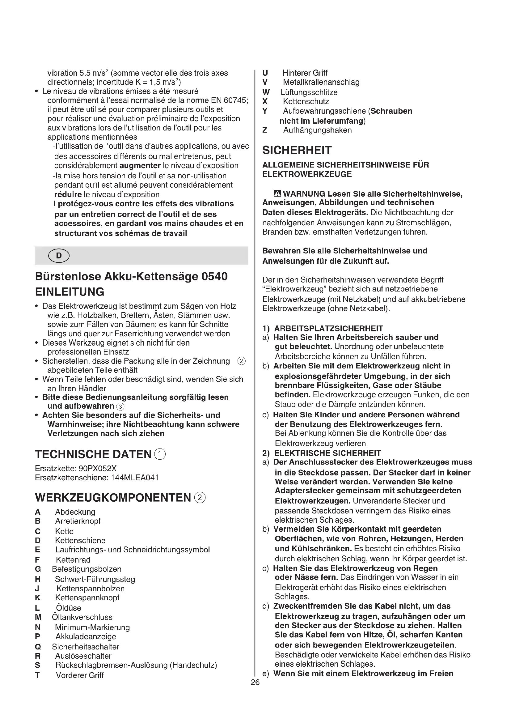 L’outil ne fonctionne pas - déclenchement du frein de recul -> tirer le26 U Hinterer Gri V Metallkrallenanschlag W Lüftungsschlitze X Kettenschutz Y Aufbewahrungsschiene (Schrauben nicht im Lieferumfang) Z Aufhängungshaken SICHERHEIT