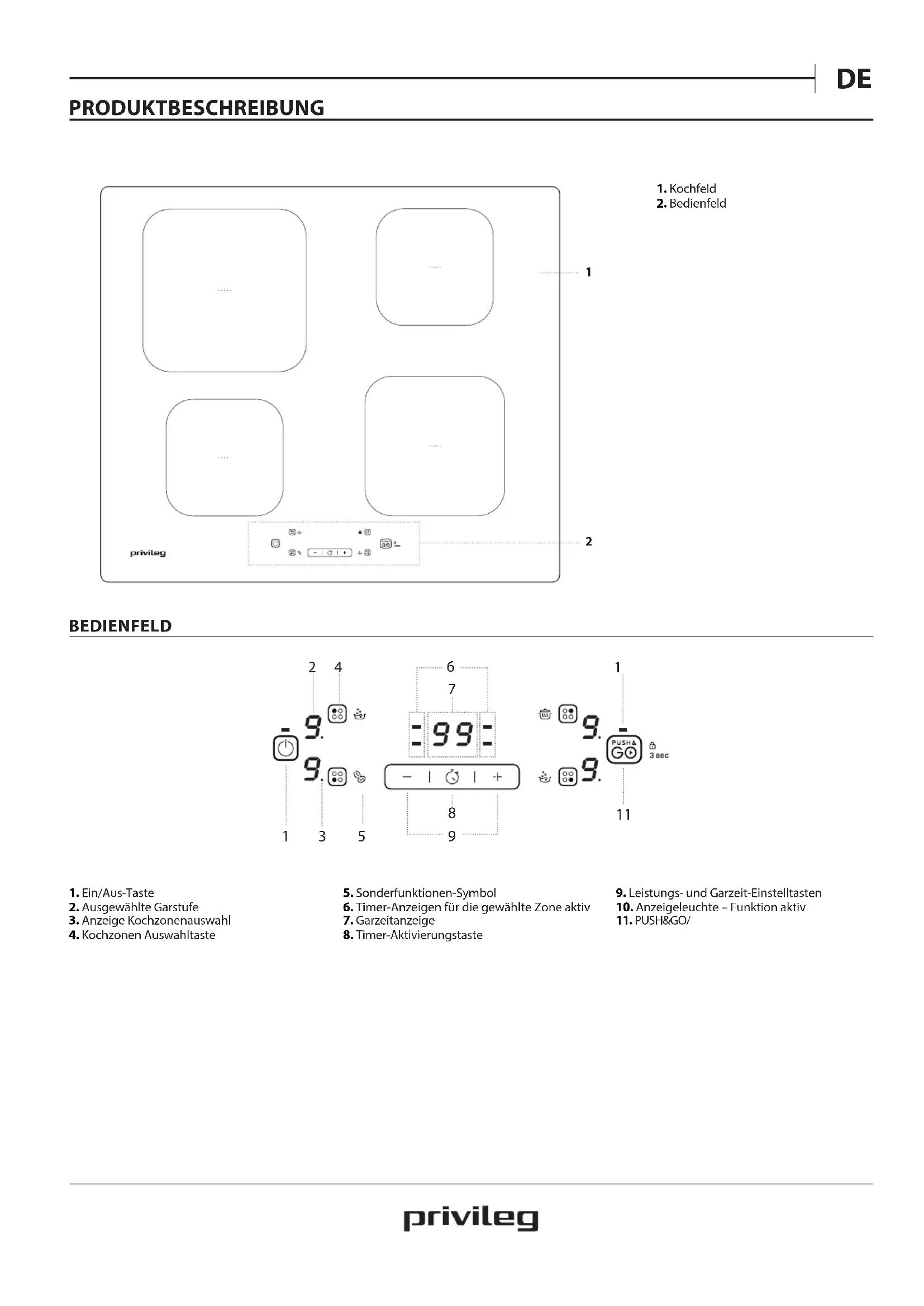 Laden Sie die vollständige Bedienungsanleitung auf http://docs.privileg.eu herunter oder rufen Sie die Telefonnummer, die im Garantieheft angegeben ist, an. Diese Sicherheitsanweisungen vor dem Gebrauch durchlesen. Diese Anweisungen zum Nachschlagen leicht zugänglich aufbewahren. In diesen Anweisungen sowie auf dem Gerät selbst werden wichtige Sicherheitshinweise angegeben, die durchgelesen und stets beachtet werden müssen. Der Hersteller übernimmt keine Haftung für die Nichtbeachtung dieser Sicherheitshinweise, für unsachgemäße Verwendung des Geräts oder falsche Bedienungseinstellung. WARNUNG: Wenn die Kochfeldoberäche rissig ist, das Gerät nicht verwenden - Stromschlaggefahr. WARNUNG: Brandgefahr: Lagern Sie nichts auf der Kochoberäche. VORSICHT: Das Garverfahren muss überwacht werden. Ein kurzes Garverfahren muss kontinuierlich überwacht werden. WARNUNG: Unbeaufsichtigtes Garen mit Fett oder Öl auf einem Kochfeld kann gefährlich sein - Brandgefahr. NIEMALS versuchen, das Feuer mit Wasser zu löschen: Stattdessen das Gerät ausschalten und dann die Flamme zum Beispiel mit einem Deckel oder einer Löschdecke abdecken. Benutzen Sie die Kochmulde nicht als Arbeitsäche oder Ablage. Kleidung oder andere brennbare Materialien vom Gerät fernhalten, bis alle Komponenten vollständig abgekühlt sind - Brandgefahr. Metallgegenstände wie Messer, Gabeln, Löel und Deckel sollten nicht auf die Kochfeldoberäche gelegt werden, da sie heiß werden können. Babys und Kleinkinder (0-3 Jahre) müssen vom Gerät fern gehalten werden. Jüngere Kinder (3-8 Jahre) müssen vom Gerät fern gehalten werden, es sei denn, sie werden ständig beaufsichtigt. Dieses Gerät darf von Kindern ab 8 Jahren sowie Personen mit herabgesetzten physischen, sensorischen oder geistigen Fähigkeiten und Mangel an Erfahrung und Kenntnissen nur unter Aufsicht oder nach ausreichender Einweisung durch eine für ihre Sicherheit verantwortliche Person verwendet werden. Kinder dürfen nicht mit dem Gerät spielen. Die Reinigung und Pege des Geräts darf von Kindern nicht ohne Aufsicht durchgeführt werden. Schalten Sie das Kochfeld nach der Benutzung mit den Bedienelementen aus und verlassen Sie sich nicht allein auf die Topferkennung. WARNUNG: Das Gerät und die zugänglichen Teile werden bei der Benutzung heiß. Berühren Sie die Heizelemente nicht. Kinder unter 8 Jahren dürfen sich dem Gerät nur unter Aufsicht nähern. Das Gargut darf nicht länger als eine Stunde vor oder nach der Zubereitung im oder auf dem Produkt bleiben.