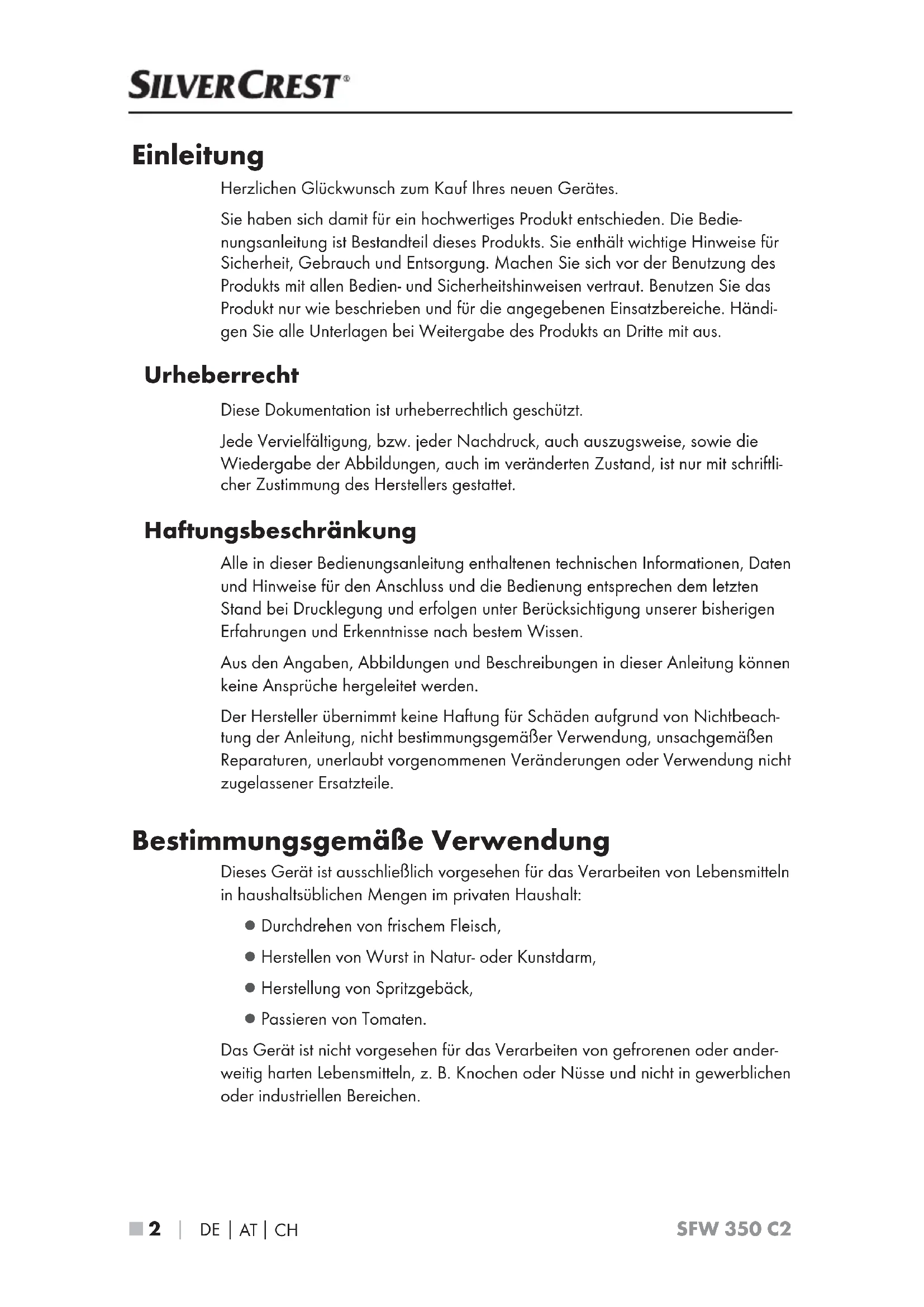 SFW 350 C2 Einleitung Herzlichen Glückwunsch zum Kauf Ihres neuen Gerätes. Sie haben sich damit für ein hochwertiges Produkt entschieden. Die Bedie- nungsanleitung ist Bestandteil dieses Produkts. Sie enthält wichtige Hinweise für Sicherheit, Gebrauch und Entsorgung. Machen Sie sich vor der Benutzung des Produkts mit allen Bedien- und Sicherheitshinweisen vertraut. Benutzen Sie das Produkt nur wie beschrieben und für die angegebenen Einsatzbereiche. Händi- gen Sie alle Unterlagen bei Weitergabe des Produkts an Dritte mit aus. Urheberrecht Diese Dokumentation ist urheberrechtlich geschützt. Jede Vervielfältigung, bzw. jeder Nachdruck, auch auszugsweise, sowie die Wiedergabe der Abbildungen, auch im veränderten Zustand, ist nur mit schriftli- cher Zustimmung des Herstellers gestattet. Haftungsbeschränkung Alle in dieser Bedienungsanleitung enthaltenen technischen Informationen, Daten und Hinweise für den Anschluss und die Bedienung entsprechen dem letzten Stand bei Drucklegung und erfolgen unter Berücksichtigung unserer bisherigen Erfahrungen und Erkenntnisse nach bestem Wissen. Aus den Angaben, Abbildungen und Beschreibungen in dieser Anleitung können keine Ansprüche hergeleitet werden. Der Hersteller übernimmt keine Haftung für Schäden aufgrund von Nichtbeach- tung der Anleitung, nicht bestimmungsgemäßer Verwendung, unsachgemäßen Reparaturen, unerlaubt vorgenommenen Veränderungen oder Verwendung nicht zugelassener Ersatzteile. Bestimmungsgemäße Verwendung Dieses Gerät ist ausschließlich vorgesehen für das Verarbeiten von Lebensmitteln in haushaltsüblichen Mengen im privaten Haushalt: ▯ Durchdrehen von frischem Fleisch, ▯ Herstellen von Wurst in Natur- oder Kunstdarm, ▯ Herstellung von Spritzgebäck, ▯ Passieren von Tomaten. Das Gerät ist nicht vorgesehen für das Verarbeiten von gefrorenen oder ander- weitig harten Lebensmitteln, z. B. Knochen oder Nüsse und nicht in gewerblichen oder industriellen Bereichen.DE