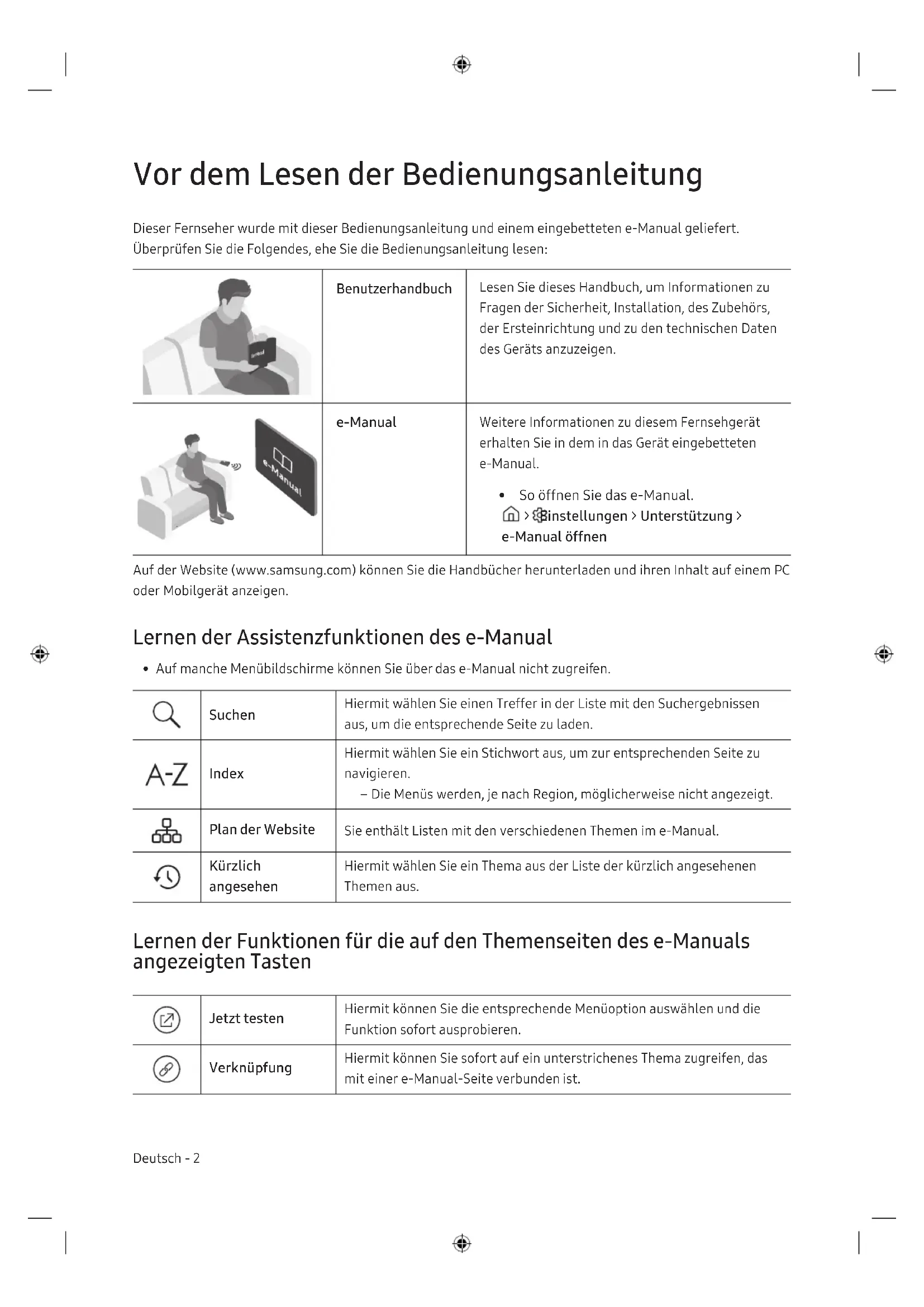 - So öffnen Sie das e-Manual. > Einstellungen > Unterstützung > e-Manual öffnen Auf der Website (www.samsung.com) können Sie die Handbücher herunterladen und ihren Inhalt auf einem PC oder Mobilgerät anzeigen. Lernen der Assistenzfunktionen des e-Manual