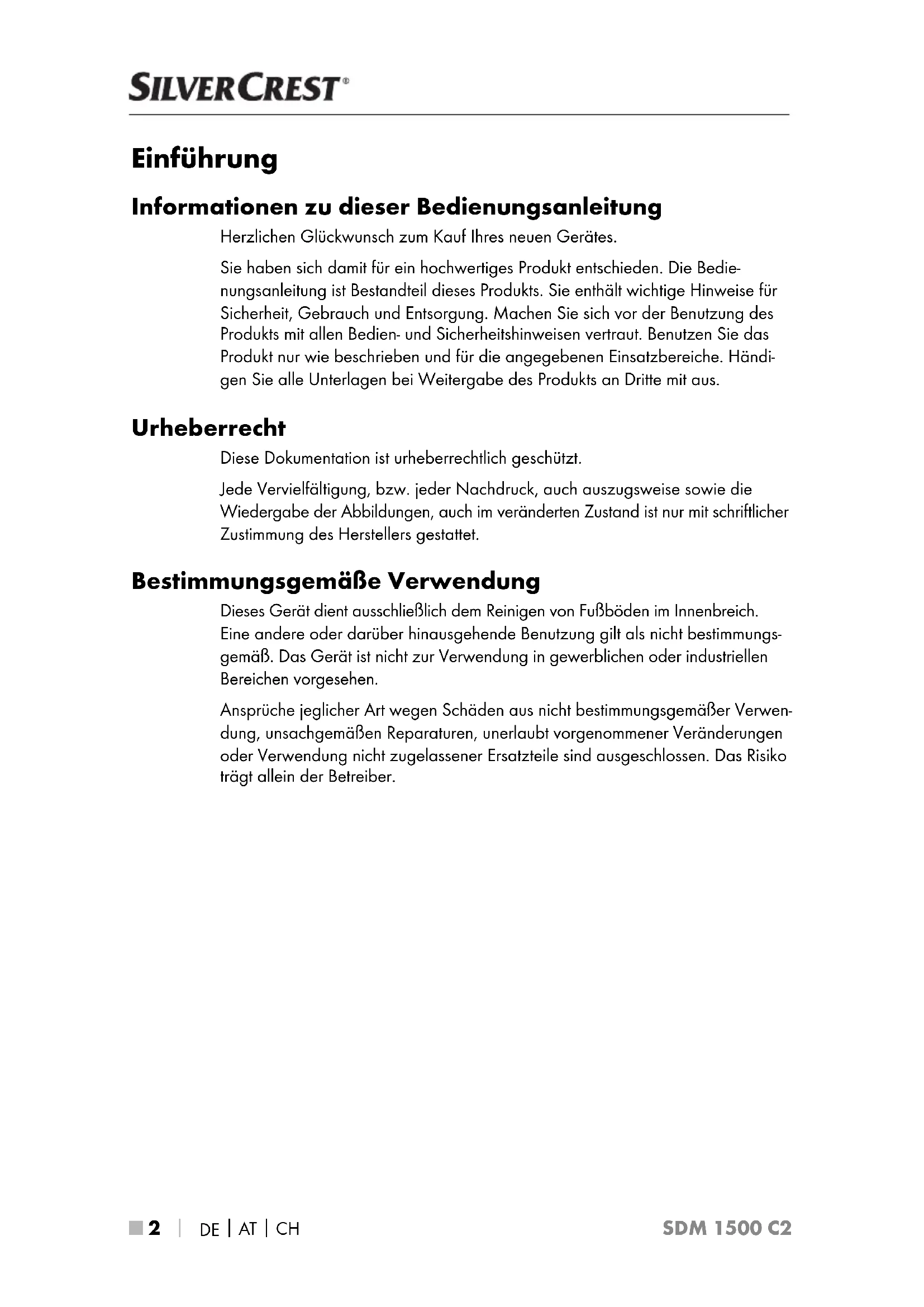 SDM 1500 C2 Einführung Informationen zu dieser Bedienungsanleitung Herzlichen Glückwunsch zum Kauf Ihres neuen Gerätes. Sie haben sich damit für ein hochwertiges Produkt entschieden. Die Bedie- nungsanleitung ist Bestandteil dieses Produkts. Sie enthält wichtige Hinweise für Sicherheit, Gebrauch und Entsorgung. Machen Sie sich vor der Benutzung des Produkts mit allen Bedien- und Sicherheitshinweisen vertraut. Benutzen Sie das Produkt nur wie beschrieben und für die angegebenen Einsatzbereiche. Händi- gen Sie alle Unterlagen bei Weitergabe des Produkts an Dritte mit aus. Urheberrecht Diese Dokumentation ist urheberrechtlich geschützt. Jede Vervielfältigung, bzw. jeder Nachdruck, auch auszugsweise sowie die Wiedergabe der Abbildungen, auch im veränderten Zustand ist nur mit schriftlicher Zustimmung des Herstellers gestattet. Bestimmungsgemäße Verwendung Dieses Gerät dient ausschließlich dem Reinigen von Fußböden im Innenbreich. Eine andere oder darüber hinausgehende Benutzung gilt als nicht bestimmungs- gemäß. Das Gerät ist nicht zur Verwendung in gewerblichen oder industriellen Bereichen vorgesehen. Ansprüche jeglicher Art wegen Schäden aus nicht bestimmungsgemäßer Verwen- dung, unsachgemäßen Reparaturen, unerlaubt vorgenommener Veränderungen oder Verwendung nicht zugelassener Ersatzteile sind ausgeschlossen. Das Risiko trägt allein der Betreiber.DE