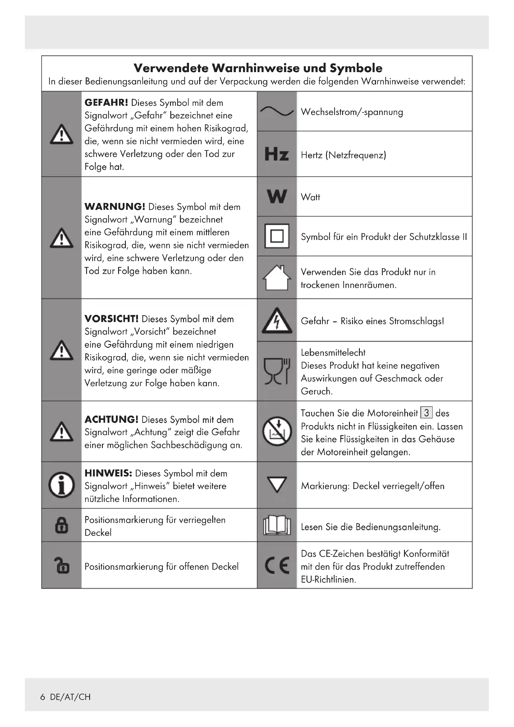 135 DE/AT/CH Verwendete Warnhinweise und Symbole............................ Seite 6 Einleitung ................................................................. Seite 7 Bestimmungsgemäßer Gebrauch................................................ Seite 7 Lieferumfang................................................................ Seite 7 Teilebeschreibung ........................................................... Seite 7 Technische Daten ............................................................ Seite 7 Sicherheitshinweise ..................................................... Seite 7 Vor dem ersten Gebrauch .............................................. Seite 11 Vor dem Gebrauch ...................................................... Seite 11 Bedienung ................................................................ Seite 12 Reinigung und Pflege ................................................... Seite 13 Lagerung ................................................................. Seite 13 Entsorgung ............................................................... Seite 13 Garantie .................................................................. Seite 14 Abwicklung im Garantiefall .................................................... Seite 14 Service .................................................................... Seite 14 V2.06 DE/AT/CH Verwendete Warnhinweise und Symbole In dieser Bedienungsanleitung und auf der Verpackung werden die folgenden Warnhinweise verwendet: GEFAHR! Dieses Symbol mit dem Signalwort „Gefahr“ bezeichnet eine Gefährdung mit einem hohen Risikograd, die, wenn sie nicht vermieden wird, eine schwere Verletzung oder den Tod zur Folge hat. Wechselstrom/-spannung Hertz (Netzfrequenz) WARNUNG! Dieses Symbol mit dem Signalwort „Warnung“ bezeichnet eine Gefährdung mit einem mittleren Risikograd, die, wenn sie nicht vermieden wird, eine schwere Verletzung oder den Tod zur Folge haben kann. Watt Symbol für ein Produkt der Schutzklasse II Verwenden Sie das Produkt nur in trockenen Innenräumen. VORSICHT! Dieses Symbol mit dem Signalwort „Vorsicht“ bezeichnet eine Gefährdung mit einem niedrigen Risikograd, die, wenn sie nicht vermieden wird, eine geringe oder mäßige Verletzung zur Folge haben kann. Gefahr – Risiko eines Stromschlags! Lebensmittelecht Dieses Produkt hat keine negativen Auswirkungen auf Geschmack oder Geruch. ACHTUNG! Dieses Symbol mit dem Signalwort „Achtung“ zeigt die Gefahr einer möglichen Sachbeschädigung an. Tauchen Sie die Motoreinheit [3] des Produkts nicht in Flüssigkeiten ein. Lassen Sie keine Flüssigkeiten in das Gehäuse der Motoreinheit gelangen. HINWEIS: Dieses Symbol mit dem Signalwort „Hinweis“ bietet weitere nützliche Informationen. Markierung: Deckel verriegelt/offen Positionsmarkierung für verriegelten Deckel Lesen Sie die Bedienungsanleitung. Positionsmarkierung für offenen Deckel Das CE-Zeichen bestätigt Konformität mit den für das Produkt zutreffenden EU-Richtlinien.7 DE/AT/CH