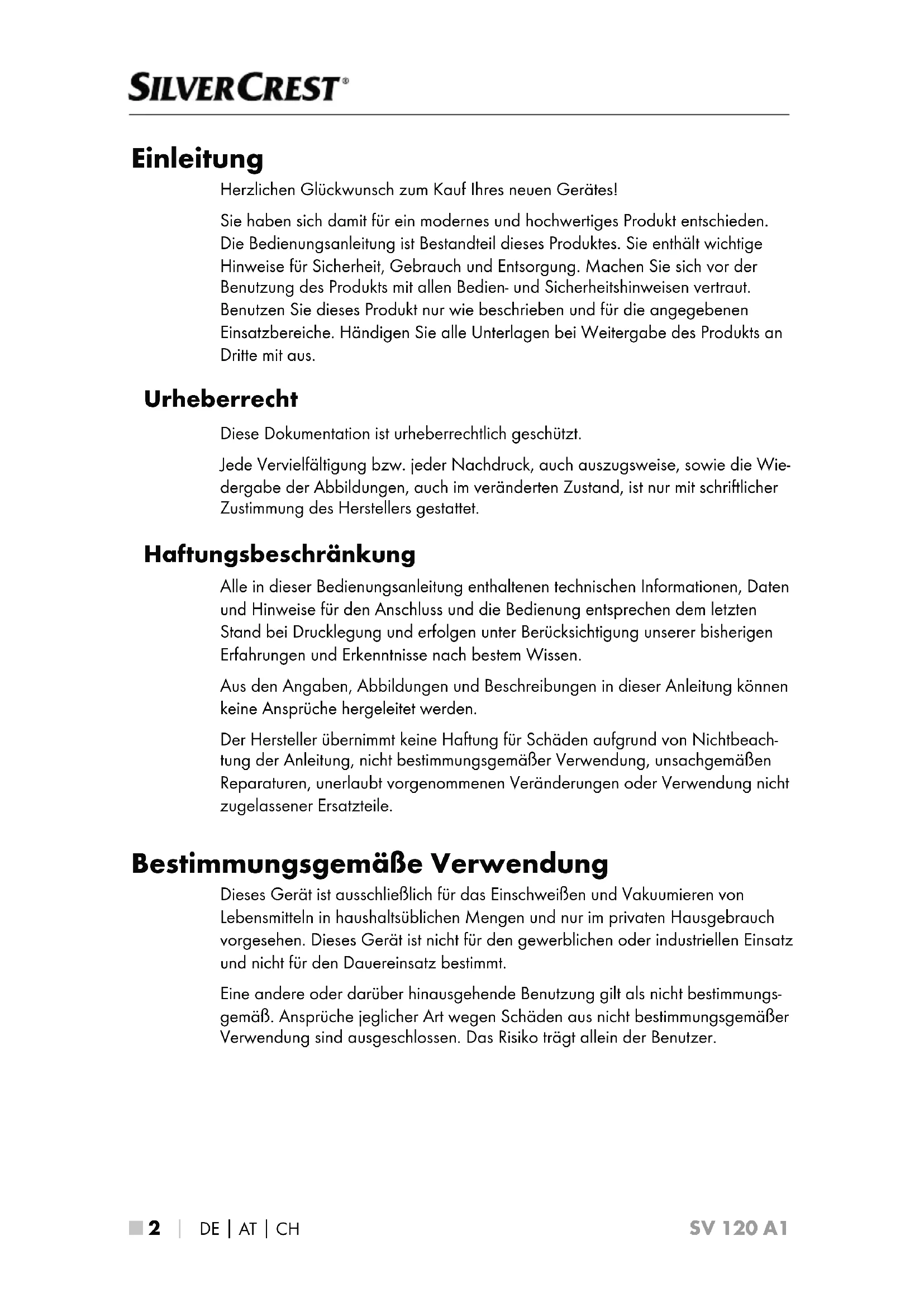 SV 120 A1 Einleitung Herzlichen Glückwunsch zum Kauf Ihres neuen Gerätes! Sie haben sich damit für ein modernes und hochwertiges Produkt entschieden. Die Bedienungsanleitung ist Bestandteil dieses Produktes. Sie enthält wichtige Hinweise für Sicherheit, Gebrauch und Entsorgung. Machen Sie sich vor der Benutzung des Produkts mit allen Bedien- und Sicherheitshinweisen vertraut. Benutzen Sie dieses Produkt nur wie beschrieben und für die angegebenen Einsatzbereiche. Händigen Sie alle Unterlagen bei Weitergabe des Produkts an Dritte mit aus. Urheberrecht Diese Dokumentation ist urheberrechtlich geschützt. Jede Vervielfältigung bzw. jeder Nachdruck, auch auszugsweise, sowie die Wie- dergabe der Abbildungen, auch im veränderten Zustand, ist nur mit schriftlicher Zustimmung des Herstellers gestattet. Haftungsbeschränkung Alle in dieser Bedienungsanleitung enthaltenen technischen Informationen, Daten und Hinweise für den Anschluss und die Bedienung entsprechen dem letzten Stand bei Drucklegung und erfolgen unter Berücksichtigung unserer bisherigen Erfahrungen und Erkenntnisse nach bestem Wissen. Aus den Angaben, Abbildungen und Beschreibungen in dieser Anleitung können keine Ansprüche hergeleitet werden. Der Hersteller übernimmt keine Haftung für Schäden aufgrund von Nichtbeach- tung der Anleitung, nicht bestimmungsgemäßer Verwendung, unsachgemäßen Reparaturen, unerlaubt vorgenommenen Veränderungen oder Verwendung nicht zugelassener Ersatzteile. Bestimmungsgemäße Verwendung Dieses Gerät ist ausschließlich für das Einschweißen und Vakuumieren von Lebensmitteln in haushaltsüblichen Mengen und nur im privaten Hausgebrauch vorgesehen. Dieses Gerät ist nicht für den gewerblichen oder industriellen Einsatz und nicht für den Dauereinsatz bestimmt. Eine andere oder darüber hinausgehende Benutzung gilt als nicht bestimmungs- gemäß. Ansprüche jeglicher Art wegen Schäden aus nicht bestimmungsgemäßer Verwendung sind ausgeschlossen. Das Risiko trägt allein der Benutzer.DE