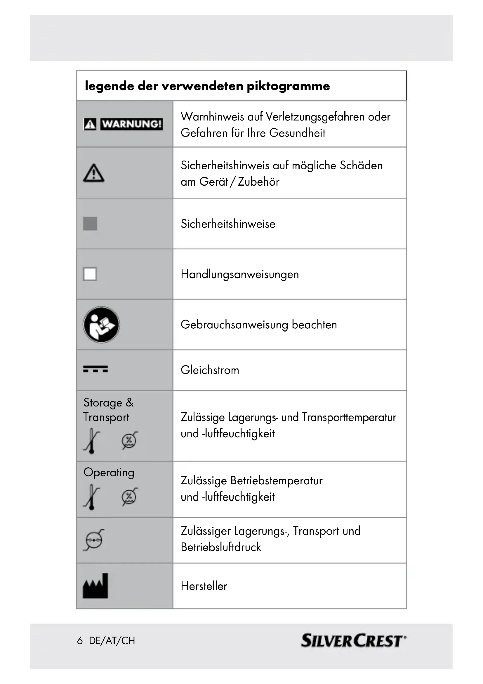 übertragen .............Seite 24 Messwerte beurteilen..................................................Seite 25 Einstufung der Messergebnisse ......................................Seite 26 Messwerte speichern, abrufen und löschen ......Seite 28 Reinigung und Pflege ..................................................Seite 29 Lagerung ........................................................................... Seite 30 Problembehebung ........................................................Seite 31 Entsorgung .......................................................................Seite 32 Garantie / Service .......................................................... Seite 336 DE/AT/CH legende der verwendeten piktogramme Warnhinweis auf Verletzungsgefahren oder Gefahren für Ihre Gesundheit Sicherheitshinweis auf mögliche Schäden am Gerät / Zubehör Sicherheitshinweise Handlungsanweisungen Gebrauchsanweisung beachten Gleichstrom Storage & Transport Zulässige Lagerungs- und Transporttemperatur und -luftfeuchtigkeit Operating Zulässige Betriebstemperatur und -luftfeuchtigkeit Zulässiger Lagerungs-, Transport und Betriebsluftdruck Hersteller7 DE/AT/CH Anwendungsteil Typ BF Seriennummer