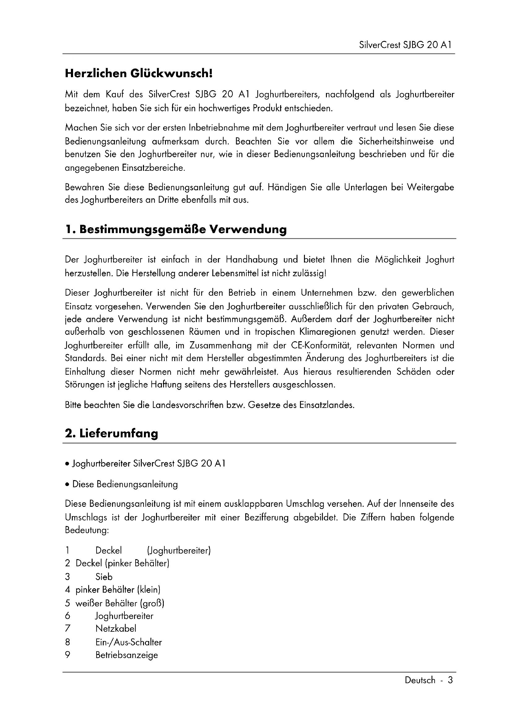 Joghurtbereiter SilverCrest SJBG 20 A1 Diese Bedienungsanleitung Diese Bedienungsanleitung ist mit einem ausklappbaren Umschlag versehen. Auf der Innenseite des Umschlags ist der Joghurtbereiter mit einer Bezifferung abgebildet. Die Ziffern haben folgende Bedeutung: 1 Deckel (Joghurtbereiter) 2 Deckel (pinker Behälter) 3 Sieb 4 pinker Behälter (klein) 5 weißer Behälter (groß) 6 Joghurtbereiter 7 Netzkabel 8 Ein-/Aus-Schalter 9 BetriebsanzeigeSilverCrest SJBG 20 A1