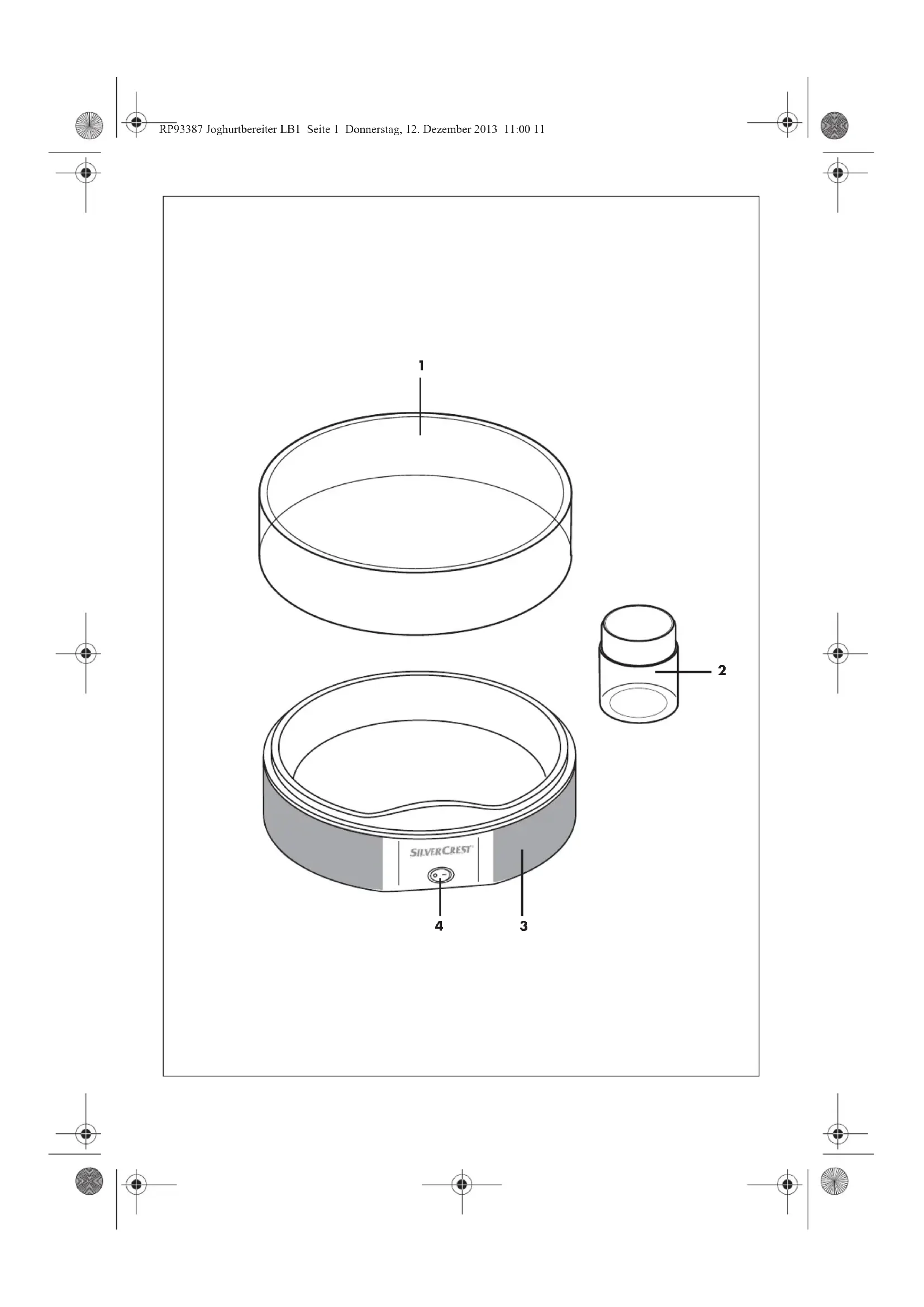1 Deckel 2 Joghurtgläser 3 Unterteil 4 Ein-/Ausschalter mit Kontroll-Lampe
