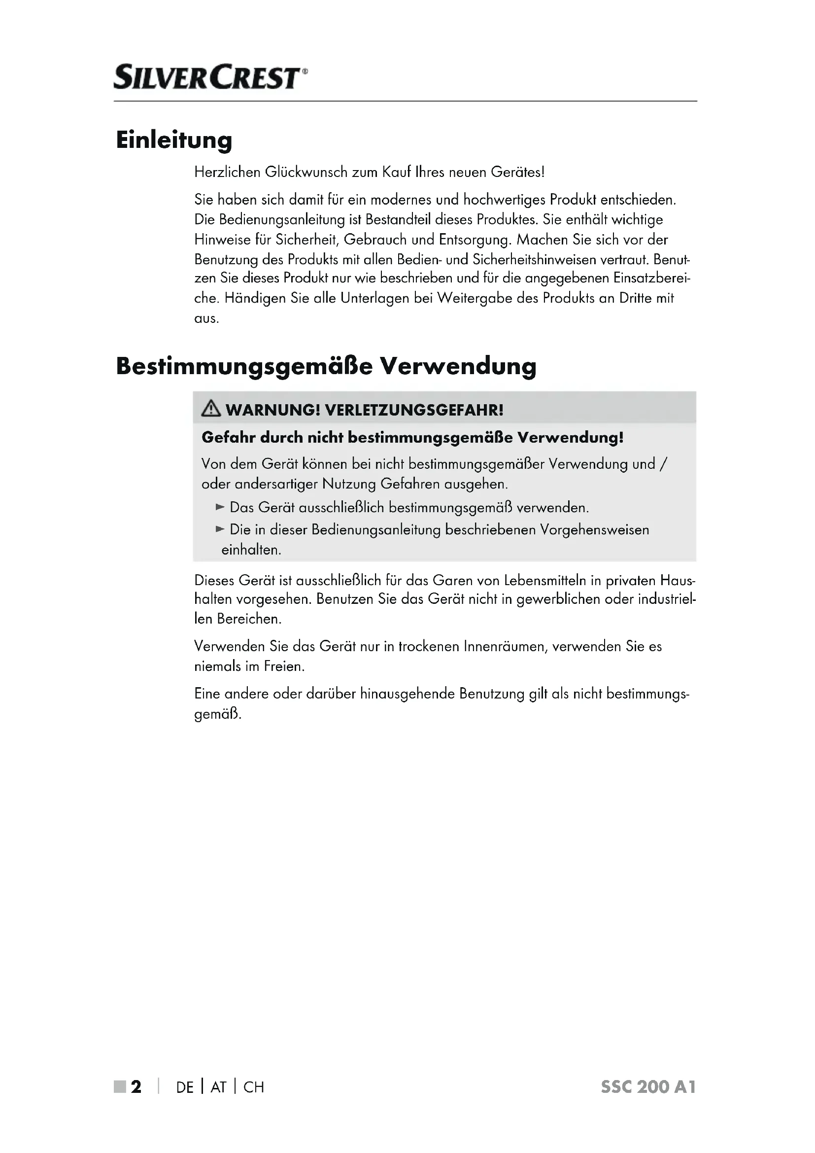 SSC 200 A1 Einleitung Herzlichen Glückwunsch zum Kauf Ihres neuen Gerätes! Sie haben sich damit für ein modernes und hochwertiges Produkt entschieden. Die Bedienungsanleitung ist Bestandteil dieses Produktes. Sie enthält wichtige Hinweise für Sicherheit, Gebrauch und Entsorgung. Machen Sie sich vor der Benutzung des Produkts mit allen Bedien- und Sicherheitshinweisen vertraut. Benut- zen Sie dieses Produkt nur wie beschrieben und für die angegebenen Einsatzberei- che. Händigen Sie alle Unterlagen bei Weitergabe des Produkts an Dritte mit aus. Bestimmungsgemäße Verwendung WARNUNG! VERLETZUNGSGEFAHR! Gefahr durch nicht bestimmungsgemäße Verwendung! Von dem Gerät können bei nicht bestimmungsgemäßer Verwendung und / oder andersartiger Nutzung Gefahren ausgehen. ► Das Gerät ausschließlich bestimmungsgemäß verwenden. ► Die in dieser Bedienungsanleitung beschriebenen Vorgehensweisen einhalten. Dieses Gerät ist ausschließlich für das Garen von Lebensmitteln in privaten Haus- halten vorgesehen. Benutzen Sie das Gerät nicht in gewerblichen oder industriel- len Bereichen. Verwenden Sie das Gerät nur in trockenen Innenräumen, verwenden Sie es niemals im Freien. Eine andere oder darüber hinausgehende Benutzung gilt als nicht bestimmungs- gemäß. IB_336973_SSC200A1_LB8.indb 2 07.07.2020 10:45:51DE