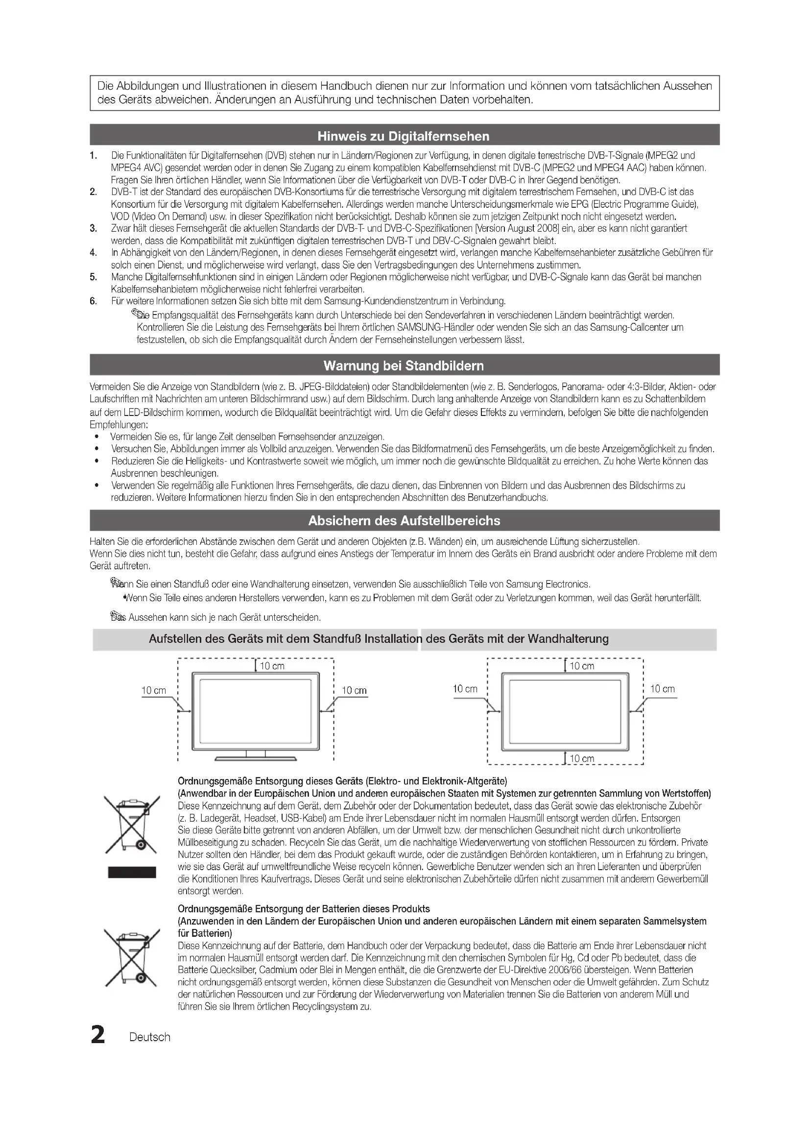Das Aussehen kann sich je nach Gerät unterscheiden. Aufstellen des Geräts mit dem Standfuß Installation des Geräts mit der Wandhalterung Ordnungsgemäße Entsorgung dieses Geräts (Elektro- und Elektronik-Altgeräte) (Anwendbar in der Europäischen Union und anderen europäischen Staaten mit Systemen zur getrennten Sammlung von Wertstoffen) Diese Kennzeichnung auf dem Gerät, dem Zubehör oder der Dokumentation bedeutet, dass das Gerät sowie das elektronische Zubehör (z.B. Ladegerät, Headset, USB-Kabel) am Ende ihrer Lebensdauer nicht im normalen Hausmüll entsorgt werden dürfen. Entsorgen Sie diese Geräte bitte getrennt von anderen Abfällen, um der Umwelt bzw. der menschlichen Gesundheit nicht durch unkontrollierte Müllbeseitigung zu schaden. Recyceln Sie das Gerät, um die nachhaltige Wiederverwertung von stofflichen Ressourcen zu fördern. Private Nutzer sollten den Händler, bei dem das Produkt gekauft wurde, oder die zuständigen Behörden kontaktieren, um in Erfahrung zu bringen, wie sie das Gerät auf umweltfreundliche Weise recyceln können. Gewerbliche Benutzer wenden sich an ihren Lieferanten und überprüfen die Konditionen Ihres Kaufvertrags. Dieses Gerät und seine elektronischen Zubehörteile dürfen nicht zusammen mit anderem Gewerbemüll entsorgt werden. Ordnungsgemäße Entsorgung der Batterien dieses Produkts (Anzuwenden in den Ländern der Europäischen Union und anderen europäischen Ländern mit einem separaten Sammelsystem für Batterien) Diese Kennzeichnung auf der Batterie, dem Handbuch oder der Verpackung bedeutet, dass die Batterie am Ende ihrer Lebensdauer nicht im normalen Hausmüll entsorgt werden darf. Die Kennzeichnung mit den chemischen Symbolen für Hg, Cd oder Pb bedeutet, dass die Batterie Quecksilber, Cadmium oder Blei in Mengen enthält, die die Grenzwerte der EU-Direktive 2006/66 übersteigen. Wenn Batterien nicht ordnungsgemäß entsorgt werden, können diese Substanzen die Gesundheit von Menschen oder die Umwelt gefährden. Zum Schutz der natürlichen Ressourcen und zur Förderung der Wiederverwertung von Materialien trennen Sie die Batterien von anderem Müll und führen Sie sie Ihrem örtlichen Recyclingsystem zu. 10 cm 10 cm 10 cm 10 cm 10 cm 10 cm 10 cm [UC6800]BN68-02842B-00L04.indb 2 2010-03-08 오후 8:52:503 DEUTSCH Deutsch Inhalt Erste Schritte