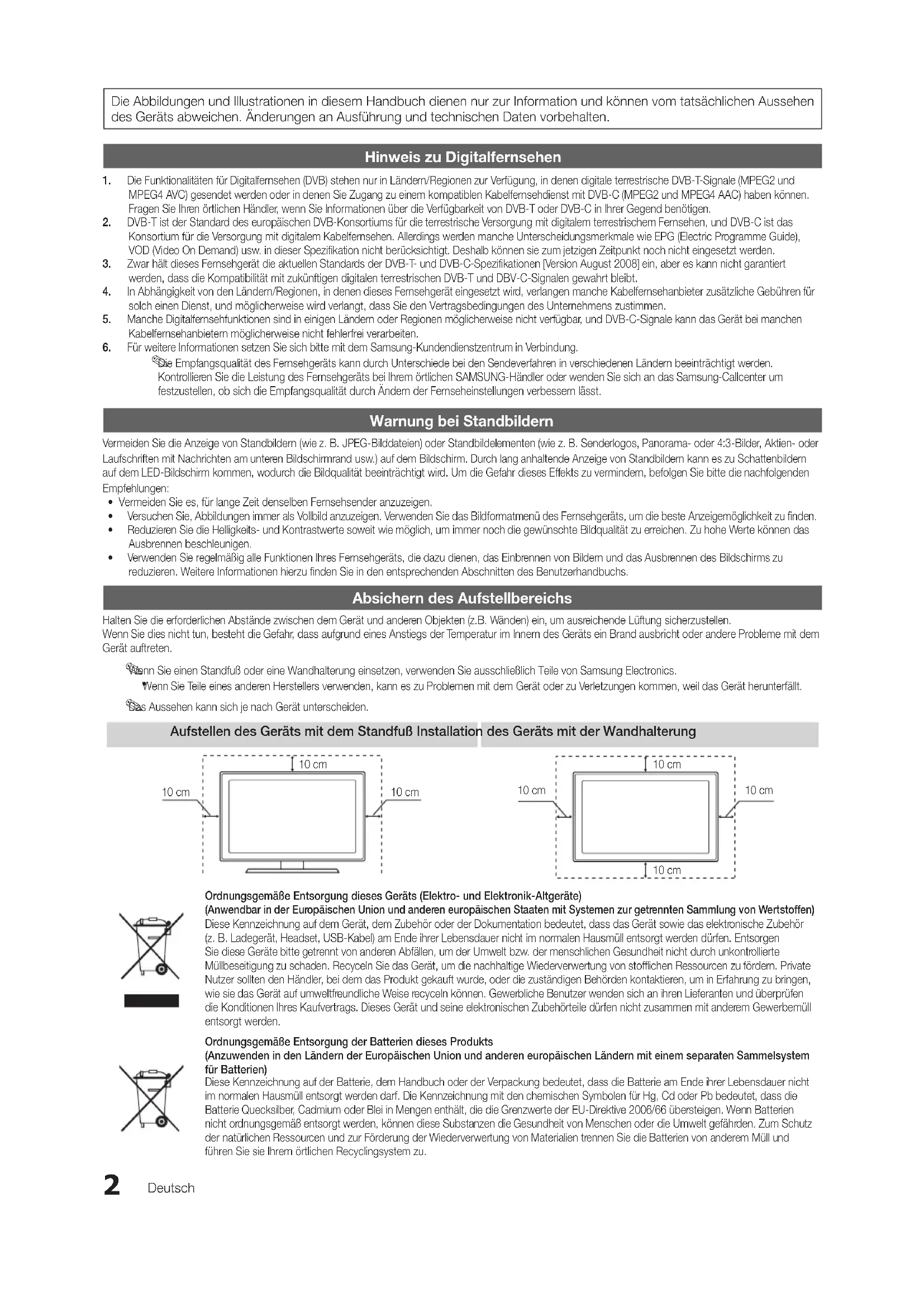 Veille 22 Verrouil. 16 Vidéos 37 Volume 5 Volume auto 21 [UC6700]BN68-02841B-00L04.indb 61 2010-03-04 오전 11:31:282 Deutsch Die Abbildungen und Illustrationen in diesem Handbuch dienen nur zur Information und können vom tatsächlichen Aussehen des Geräts abweichen. Änderungen an Ausführung und technischen Daten vorbehalten. Hinweis zu Digitalfernsehen 1. Die Funktionalitäten für Digitalfernsehen (DVB) stehen nur in Ländern/Regionen zur Verfügung, in denen digitale terrestrische DVB-T-Signale (MPEG2 und MPEG4 AVC) gesendet werden oder in denen Sie Zugang zu einem kompatiblen Kabelfernsehdienst mit DVB-C (MPEG2 und MPEG4 AAC) haben können. Fragen Sie Ihren örtlichen Händler, wenn Sie Informationen über die Verfügbarkeit von DVB-T oder DVB-C in Ihrer Gegend benötigen. 2. DVB-T ist der Standard des europäischen DVB-Konsortiums für die terrestrische Versorgung mit digitalem terrestrischem Fernsehen, und DVB-C ist das Konsortium für die Versorgung mit digitalem Kabelfernsehen. Allerdings werden manche Unterscheidungsmerkmale wie EPG (Electric Programme Guide), VOD (Video On Demand) usw. in dieser Spezifikation nicht berücksichtigt. Deshalb können sie zum jetzigen Zeitpunkt noch nicht eingesetzt werden. 3. Zwar hält dieses Fernsehgerät die aktuellen Standards der DVB-T- und DVB-C-Spezifikationen [Version August 2008] ein, aber es kann nicht garantiert werden, dass die Kompatibilität mit zukünftigen digitalen terrestrischen DVB-T und DBV-C-Signalen gewahrt bleibt. 4. In Abhängigkeit von den Ländern/Regionen, in denen dieses Fernsehgerät eingesetzt wird, verlangen manche Kabelfernsehanbieter zusätzliche Gebühren für solch einen Dienst, und möglicherweise wird verlangt, dass Sie den Vertragsbedingungen des Unternehmens zustimmen. 5. Manche Digitalfernsehfunktionen sind in einigen Ländern oder Regionen möglicherweise nicht verfügbar, und DVB-C-Signale kann das Gerät bei manchen Kabelfernsehanbietern möglicherweise nicht fehlerfrei verarbeiten.