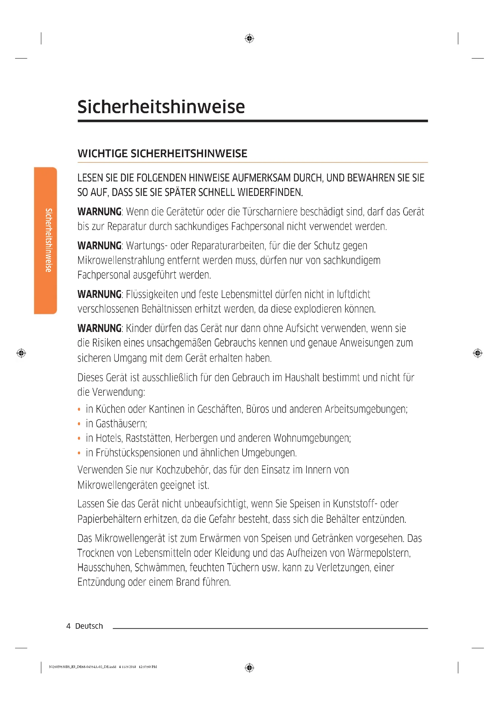 - in Frühstückspensionen und ähnlichen Umgebungen. Verwenden Sie nur Kochzubehör, das für den Einsatz im Innern von Mikrowellengeräten geeignet ist. Lassen Sie das Gerät nicht unbeaufsichtigt, wenn Sie Speisen in Kunststoff- oder Papierbehältern erhitzen, da die Gefahr besteht, dass sich die Behälter entzünden. Das Mikrowellengerät ist zum Erwärmen von Speisen und Getränken vorgesehen. Das Trocknen von Lebensmitteln oder Kleidung und das Aufheizen von Wärmepolstern, Hausschuhen, Schwämmen, feuchten Tüchern usw. kann zu Verletzungen, einer Entzündung oder einem Brand führen. NQ50J9530BS_EF_DE68-04354A-02_DE.indd 4 11/5/2018 12:57:50 PMDeutsch 5 Sicherheitshinweise Halten Sie die Gerätetür bei Rauchentwicklung im und am Gerät geschlossen, und schalten Sie das Gerät aus bzw. unterbrechen Sie die Stromversorgung. Beim Erhitzen von Getränken im Mikrowellengerät kann es zu verzögertem Sieden und damit verbundenem Spritzen kommen. Das Behältnis muss deshalb vorsichtig herausgenommen werden. Babynahrung in Flaschen und Gläsern muss vor dem Füttern gut geschüttelt bzw. durchgerührt und auf Temperaturverträglichkeit kontrolliert werden, um Verbrennungen zu vermeiden. Kochen Sie Eier nie in der Schale, und wärmen Sie hart gekochte Eier niemals in der Schale auf. Sie könnten anderenfalls explodieren, selbst nachdem das Erhitzen im Mikrowellengerät abgeschlossen ist. Wir empfehlen, das Gerät regelmäßig zu reinigen und dabei eventuelle Essensrückstände zu entfernen. Wenn das Gerät nicht sauber gehalten wird, kann die Oberäche beschädigt werden. Dies wirkt sich unter Umständen nachteilig auf die Lebensdauer des Geräts aus und verursacht möglicherweise Gefahren. Dieses Gerät ist nur als Einbaugerät zu verwenden. Das Gerät darf nicht im Innern eines Schranks aufgestellt werden. Verwenden Sie im Mikrowellenbetrieb niemals Behälter aus Metall, um Lebensmittel und Getränke zu erhitzen. Achten Sie beim Entnehmen von Behältern aus dem Gerät darauf, dass der Drehteller nicht verschoben wird. (Nur Drehtellermodelle) Das Gerät darf nicht mit einem Dampfreiniger gesäubert werden. Das Gerät darf nicht mit einem Hochdruckreiniger gesäubert werden. Das Gerät ist nicht zur Aufstellung in Straßenfahrzeugen, Wohnwagen und ähnlichen Fahrzeugen bestimmt und nicht für die Nutzung in Außenbereichen geeignet. NQ50J9530BS_EF_DE68-04354A-02_DE.indd 5 11/5/2018 12:57:51 PM6 Deutsch Sicherheitshinweise Sicherheitshinweise Dieses Gerät ist nicht zur Verwendung durch Personen (einschließlich Kindern) mit verringerten körperlichen, sensorischen oder mentalen Fähigkeiten oder einem Mangel an Erfahrung und Wissen bestimmt, sofern sie nicht von einer für ihre Sicherheit verantwortlichen Person im Umgang mit dem Gerät unterwiesen wurden und von dieser beaufsichtigt werden. Kinder müssen beaufsichtigt werden, um zu verhindern, dass sie mit dem Gerät spielen. Dieses Gerät darf von Kindern ab 8 Jahren und Personen mit verminderten körperlichen, sensorischen oder geistigen Fähigkeiten oder einem Mangel an Erfahrung und Wissen nur dann bedient werden, wenn sie unter Aufsicht stehen oder eine Unterweisung zum sicheren Umgang mit dem Gerät erhalten haben und die damit verbundenen Gefahren verstehen. Kinder dürfen nicht mit dem Gerät spielen. Kinder dürfen bei Reinigung und Wartung nur dann helfen, wenn sie dabei beaufsichtigt werden. Das Gerät muss so aufgestellt werden, dass es auch nach der Installation vom Netz getrennt werden kann. Dies kann erreicht werden, indem der Stecker stets zugänglich bleibt oder in die fest verlegte Leitung ein den Anschlussvorschriften entsprechender Schalter eingebaut wird. Die Trennvorrichtungen sind entsprechend den Anschlussvorschriften in die fest verlegte Leitung einzubauen. Falls das Netzkabel beschädigt ist, muss es vom Hersteller oder vom Kundendienst bzw. von einer entsprechend qualizierten Fachkraft ausgetauscht werden, um Gefährdungen auszuschließen. Bei der angegebenen Befestigungsart dürfen keine Klebemittel eingesetzt werden, da sie keinen ausreichenden Halt bieten. Dieses Gerät muss ordnungsgemäß ausgerichtet und in der richtigen Höhe aufgestellt werden, damit der Garraum und der Bedienbereich leicht zugänglich sind. Bevor Sie das Gerät zum ersten Mal verwenden, sollten Sie 10 Minuten lang etwas Wasser darin erhitzen. NQ50J9530BS_EF_DE68-04354A-02_DE.indd 6 11/5/2018 12:57:51 PMDeutsch 7 Sicherheitshinweise Wenn das Gerät ungewöhnliche Geräusche, Brandgeruch oder Rauch entwickelt, trennen Sie sofort die Stromversorgung und wenden Sie sich an Ihr nächstgelegenes Kundendienstzentrum. WARNUNG: Wenn das Gerät im Kombinationsmodus verwendet wird, entstehen hohe Temperaturen. Kinder dürfen das Gerät daher nur unter Aufsicht eines Erwachsenen bedienen. Das Gerät erhitzt sich im Betrieb. Es ist Vorsicht geboten, damit Sie die Heizelemente im Innern des Geräts nicht berühren. Wenn dieses Gerät über eine Reinigungsfunktion verfügt, können die Oberächen während der Reinigung heißer als üblich werden. Kinder müssen deshalb ferngehalten werden. Die Reinigungsfunktion ist modellabhängig. WARNUNG: Zugängliche Teile können sich im Betrieb erwärmen. Halten Sie Kinder deshalb fern. Benutzen Sie keine scharfen Scheuermittel oder Metallschaber, um den Glaseinsatz der Gerätetür zu reinigen. Sie könnten die Oberäche zerkratzen und damit das Glas zerbrechen lassen. Zur Reinigung des Geräts dürfen keine Dampfreiniger verwendet werden. WARNUNG: Stellen Sie sicher, dass das Gerät vor einem Austausch der Glühlampe vom Stromnetz getrennt wird, da sonst die Gefahr eines Stromschlags besteht. Um eine Überhitzung zu vermeiden, darf die Tür des Geräts nicht mit einer Zierblende versehen werden. WARNUNG: Das Gerät und seine zugänglichen Teile können während des Betriebs heiß werden. Es ist Vorsicht geboten, damit Sie die Heizelemente des Geräts nicht berühren. Wenn sie nicht unter ständiger Aufsicht 