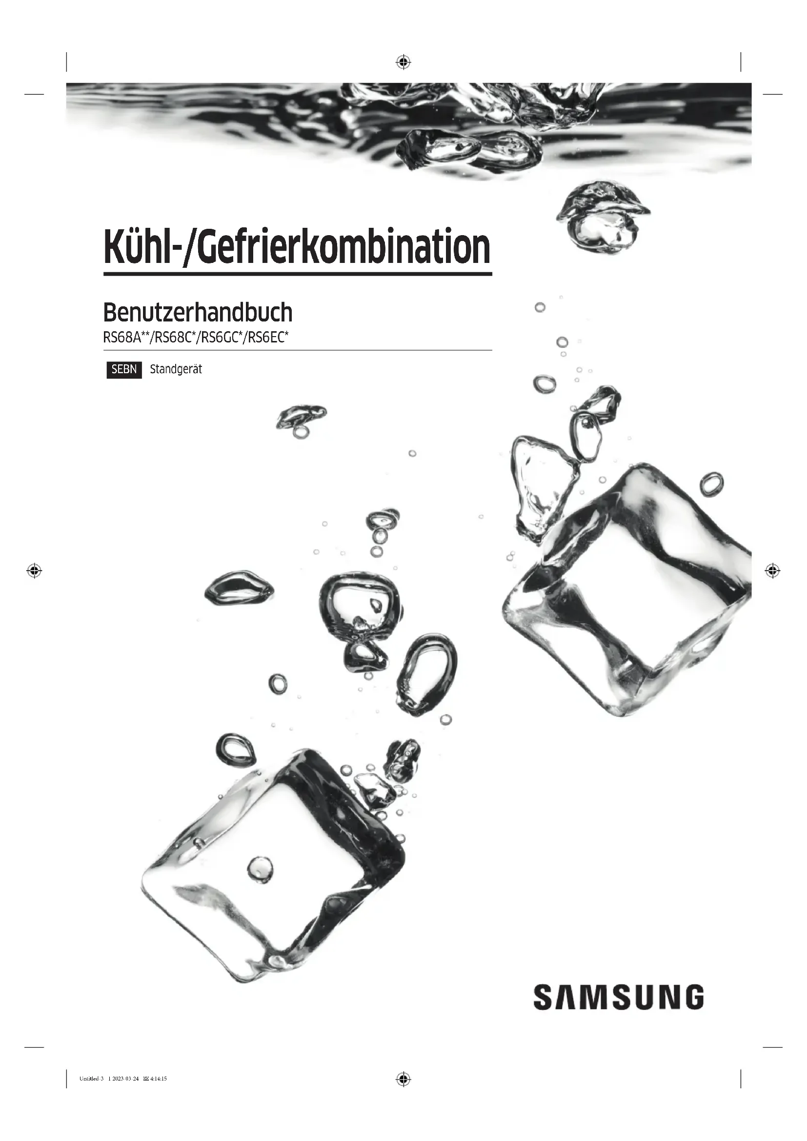 www.samsung.com/be/support (Dutch) www.samsung.com/be_fr/support (French) DA68-04374A-01 Untitled-4 84 2023-03-24 4:16:35Kühl-/Gefrierkombination Benutzerhandbuch RS68A**/RS68C*/RS6GC*/RS6EC* SEBN Standgerät Untitled-3 1 2023-03-24 4:14:15Deutsch2 Inhalt Inhalt Sicherheitsinformationen 4 Wichtige Informationen zu den Sicherheitshinweisen 4 Wichtige Symbole für Sicherheits- und Gefahrenhinweise: 6 Wichtige Vorsichtsmaßnahmen für Ihre Sicherheit 7 Wichtige Warnhinweise für Transport und Aufstellungsort 10 Wichtige Warnhinweise für das Aufstellen 11 Vorsichtshinweise für das Aufstellen 14 Wichtige Warnhinweise für die Verwendung 15 Vorsichtshinweise für die Verwendung 20 Vorsichtshinweise für die Reinigung 22 Wichtige Hinweise für die Entsorgung 25 Weitere Tipps zur ordnungsgemäßen Verwendung 26 Hinweise zur WEEE-Kennzeichnung 27 Aufstellen 28 Ihre Kühl-/Gefrierkombination auf einen Blick 28 Aufstellungshinweise in Verfahrensschritten 30 Ausbauen der Tür beim Transport 42 Bedienung 47 Funktionsbereich 47 Ein-/Ausschalten der Eismaschine 50 Zurücksetzen oder Verwerfen des Filtertauschalarms (nur entsprechend ausgestattete Modelle) 50 Aktivieren bzw. Deaktivieren des Wi-Fi-Netzwerks 51 SmartThings 52 Spenderbedienfeld (nur entsprechend ausgestattete Modelle) 55 Spezialfunktionen 56 Instandhaltung 64 Handhabung und Pege 64 Reinigung 66 Ersetzen von Teilen 67 Untitled-3 2 2023-03-24 4:14:15Deutsch 3 Inhalt Problembehebung 68 Allgemein 68 Hören Sie ungewöhnliche Geräusche aus dem Kühlschrank? 73 SmartThings 75 Open Source Announcement 77 Anhang 78 Sicherheitshinweise 78 Installationsanleitung 78 Angaben zur Temperaturh 79 Modellinformationen und Bestellung von Ersatzteilen 83 Untitled-3 3 2023-03-24 4:14:15Deutsch4 Sicherheitsinformationen Um sicherzustellen, dass Sie über die Eigenschaften und Funktionen Ihres neuen Geräts Bescheid wissen, müssen Sie diese Anleitung sorgfältig durchlesen, ehe Sie Ihre neue Kühl-/Gefrierkombination von Samsung in Betrieb nehmen. Wichtige Informationen zu den Sicherheitshinweisen