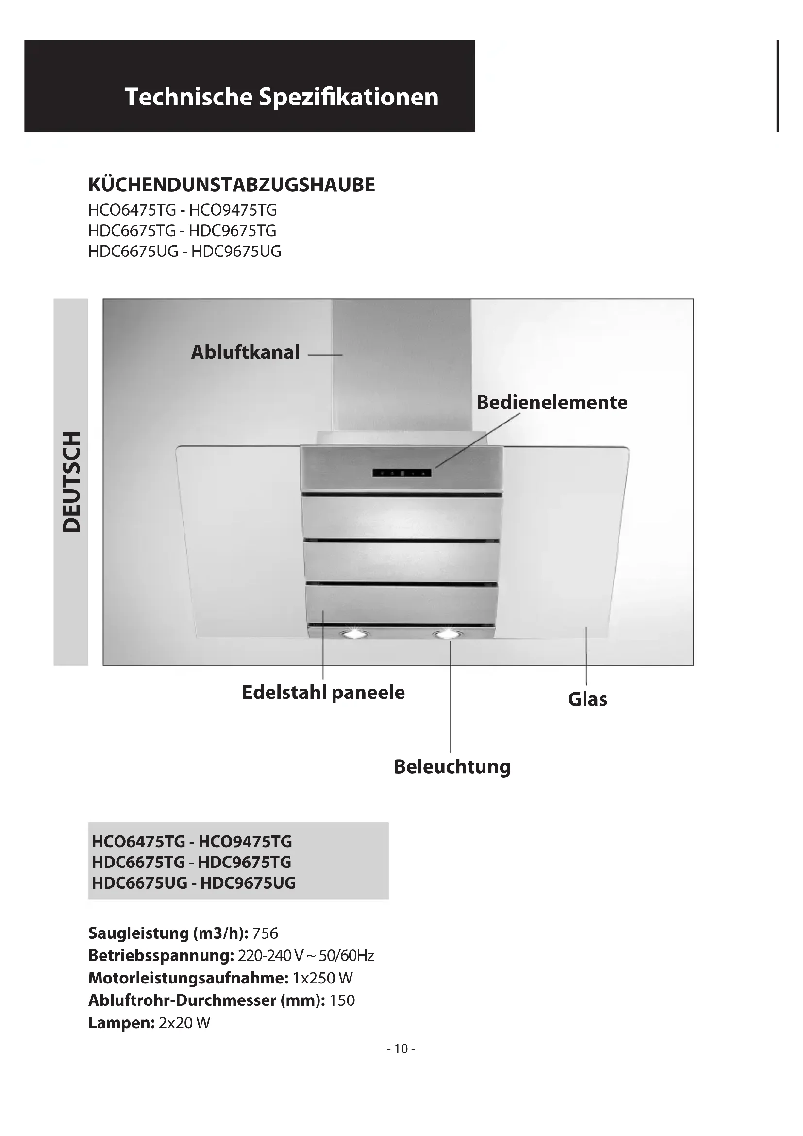 Technische Spezikationen KÜCHENDUNSTABZUGSHAUBE Saugleistung (m3/h): 756 Betriebsspannung: 220-240 V ~ 50/60Hz Motorleistungsaufnahme: 1x250 W Abluftrohr-Durchmesser (mm): 150 Lampen: 2x20 W Bedienelemente Edelstahl paneele Beleuchtung Abluftkanal Glas DEUTSCH- 11 - HDC6475TG HDC9475TG