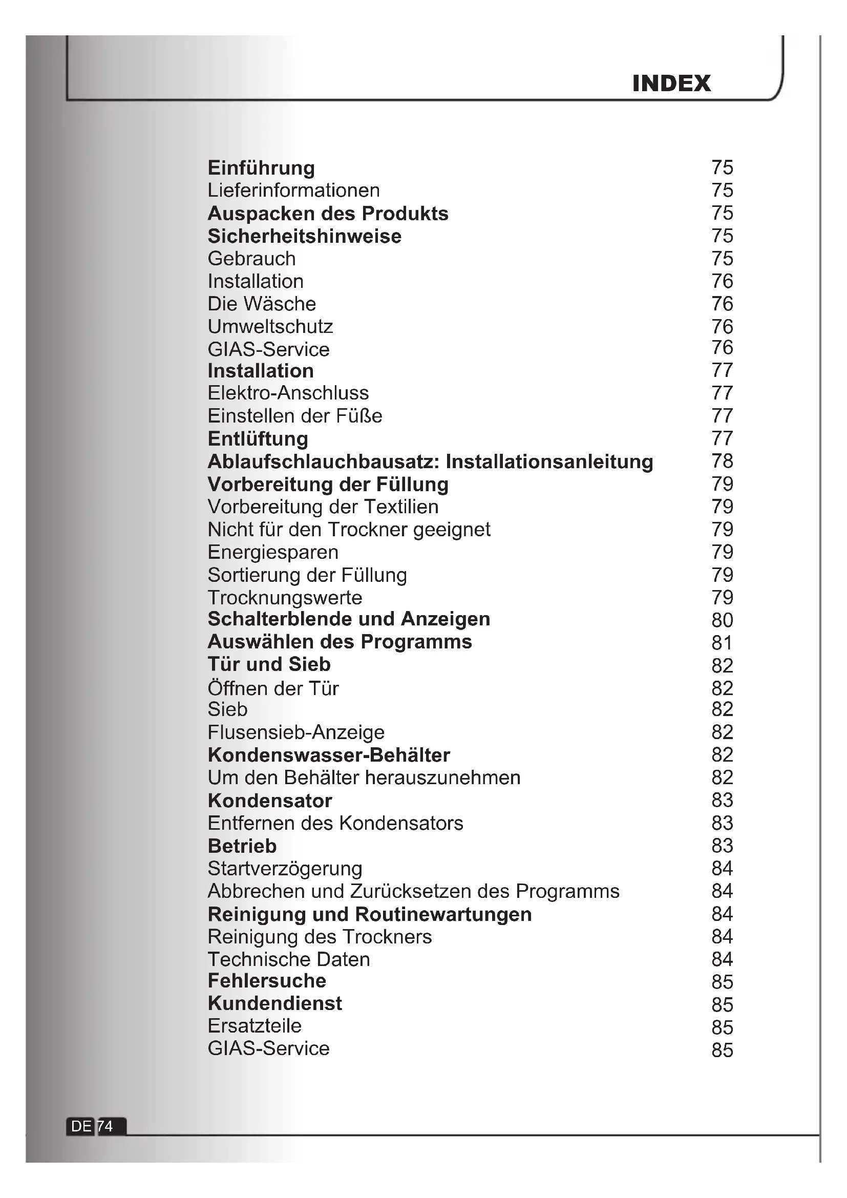 Ricambi Servizio GIAS IT 73INDEX Einführung Lieferinformationen Auspacken des Produkts Sicherheitshinweise Gebrauch Installation Die Wäsche Umweltschutz GIAS-Service Installation Elektro-Anschluss Einstellen der Füße Entlüftung Ablaufschlauchbausatz: Installationsanleitung Vorbereitung der Füllung Vorbereitung der Textilien Nicht für den Trockner geeignet Energiesparen Sortierung der Füllung Trocknungswerte Schalterblende und Anzeigen Auswählen des Programms Tür und Sieb Öffnen der Tür Sieb Flusensieb-Anzeige Kondenswasser-Behälter Um den Behälter herauszunehmen Kondensator Entfernen des Kondensators Betrieb Startverzögerung Abbrechen und Zurücksetzen des Programms Reinigung und Routinewartungen Reinigung des Trockners Technische Daten Fehlersuche Kundendienst Ersatzteile GIAS-Service DE 74