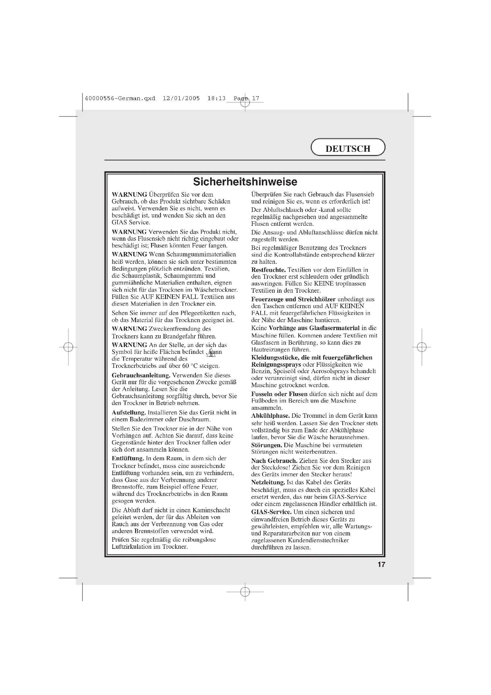 Sicherheitshinweise WARNUNG Überprüfen Sie vor dem Gebrauch, ob das Produkt sichtbare Schäden aufweist. Verwenden Sie es nicht, wenn es beschädigt ist, und wenden Sie sich an den GIAS Service. WARNUNG Verwenden Sie das Produkt nicht, wenn das Flusensieb nicht richtig eingebaut oder beschädigt ist; Flusen könnten Feuer fangen. WARNUNG Wenn Schaumgummimaterialien heiß werden, können sie sich unter bestimmten Bedingungen plötzlich entzünden. Textilien, die Schaumplastik, Schaumgummi und gummiähnliche Materialien enthalten, eignen sich nicht für das Trocknen im Wäschetrockner. Füllen Sie AUF KEINEN FALL Textilien aus diesen Materialien in den Trockner ein. Sehen Sie immer auf den Pflegeetiketten nach, ob das Material für das Trocknen geeignet ist. WARNUNG Zweckentfremdung des Trockners kann zu Brandgefahr führen. WARNUNG An der Stelle, an der sich das Symbol für heiße Flächen befindet , kann die Temperatur während des Trocknerbetriebs auf über 60 °C steigen. Gebrauchsanleitung. Verwenden Sie dieses Gerät nur für die vorgesehenen Zwecke gemäß der Anleitung. Lesen Sie die Gebrauchsanleitung sorgfältig durch, bevor Sie den Trockner in Betrieb nehmen. Aufstellung. Installieren Sie das Gerät nicht in einem Badezimmer oder Duschraum. Stellen Sie den Trockner nie in der Nähe von Vorhängen auf. Achten Sie darauf, dass keine Gegenstände hinter den Trockner fallen oder sich dort ansammeln können. Entlüftung. In dem Raum, in dem sich der Trockner befindet, muss eine ausreichende Entlüftung vorhanden sein, um zu verhindern, dass Gase aus der Verbrennung anderer Brennstoffe, zum Beispiel offene Feuer, während des Trocknerbetriebs in den Raum gesogen werden. Die Abluft darf nicht in einen Kaminschacht geleitet werden, der für das Ableiten von Rauch aus der Verbrennung von Gas oder anderen Brennstoffen verwendet wird. Prüfen Sie regelmäßig die reibungslose Luftzirkulation im Trockner. Überprüfen Sie nach Gebrauch das Flusensieb und reinigen Sie es, wenn es erforderlich ist! Der Abluftschlauch oder -kanal sollte regelmäßig nachgesehen und angesammelte Flusen entfernt werden. Die Ansaug- und Abluftanschlüsse dürfen nicht zugestellt werden. Bei regelmäßiger Benutzung des Trockners sind die Kontrollabstände entsprechend kürzer zu halten. Restfeuchte. Textilien vor dem Einfüllen in den Trockner erst schleudern oder gründlich auswringen. Füllen Sie KEINE tropfnassen Textilien in den Trockner. Feuerzeuge und Streichhölzer unbedingt aus den Taschen entfernen und AUF KEINEN FALL mit feuergefährlichen Flüssigkeiten in der Nähe der Maschine hantieren. Keine Vorhänge aus Glasfasermaterial in die Maschine füllen. Kommen andere Textilien mit Glasfasern in Berührung, so kann dies zu Hautreizungen führen. Kleidungsstücke, die mit feuergefährlichen Reinigungssprays oder Flüssigkeiten wie Benzin, Speiseöl oder Aerosolsprays behandelt oder verunreinigt sind, dürfen nicht in dieser Maschine getrocknet werden. Fusseln oder Flusen dürfen sich nicht auf dem Fußboden im Bereich um die Maschine ansammeln. Abkühlphase. Die Trommel in dem Gerät kann sehr heiß werden. Lassen Sie den Trockner stets vollständig bis zum Ende der Abkühlphase laufen, bevor Sie die Wäsche herausnehmen. Störungen. Die Maschine bei vermuteten Störungen nicht weiterbenutzen. Nach Gebrauch. Ziehen Sie den Stecker aus der Steckdose! Ziehen Sie vor dem Reinigen des Geräts immer den Stecker heraus! Netzleitung. Ist das Kabel des Geräts beschädigt, muss es durch ein spezielles Kabel ersetzt werden, das nur beim GIAS-Service oder einem zugelassenen Händler erhältlich ist. GIAS-Service. Um einen sicheren und einwandfreien Betrieb dieses Geräts zu gewährleisten, empfehlen wir, alle Wartungs- und Reparaturarbeiten nur von einem zugelassenen Kundendiensttechniker durchführen zu lassen. 40000556-German.qxd 12/01/2005 18:13 Page 17Sicherheitshinweise 17 Elektro-Anschluss 18 Installation 19 Vorbereitung der Füllung 19 Vorbereitung der Textilien 19 Maximales Fassungsvermögen (Trockengewicht) 19 Sortierung der Füllung 19-20 Nicht für den Trockner geeignet 20 Energiesparen 20 Öffnen der Tür 20 Sieb 20 Kondenswasser-Behälter 21 Kondensator 21 Trocknungswerte 22 Schalter & Anzeigen 23 Betrieb 24-25 Reinigung des Trockners 26 Technische Daten 26 Europäische Vorschrift 2002/96/EC 26 Bei Betriebsstörungen 27 Bevor Sie den Trockner das erste Mal benutzen: ● lesen Sie die Gebrauchsanleitung bitte sorgfältig durch! ● entfernen Sie alle in der Trommel befindlichen Gegenstände! ● wischen Sie die Innenseiten der Trommel und Tür mit einem feuchten Tuch aus, um den beim Transport eventuell dort angesammelten Staub zu entfernen. WICHTIG: Dieser Trockner darf nur für die Trocknung von Haushaltstextilien und Kleidungsstücken benutzt werden, die vorher in Wasser gewaschen worden sind. AUF KEINEN FALL Stoffe in der Maschine trocknen, die mit chemischen Reinigungsmitteln behandelt wurden. Elektro-Anschluss Das Gerät ist mit einem geschweißten Stecker ausgestattet. Der Stecker ist so anzubringen, dass er nach der Installation des Geräts leicht aus der Steckdose zu ziehen ist. WICHTIG: Die Drähte im Netzanschlusskabel sind farblich gemäß folgendem Code unterschieden: Blau - NEUTRAL Braun - STROMFÜHREND Grün-Gelb - ERDE Ist das Kabel des Gerätes beschädigt, muss es durch ein spezielles Kabel ersetzt werden, das nur beim GIAS-Service oder einem zugelassenen Händler erhältlich ist.