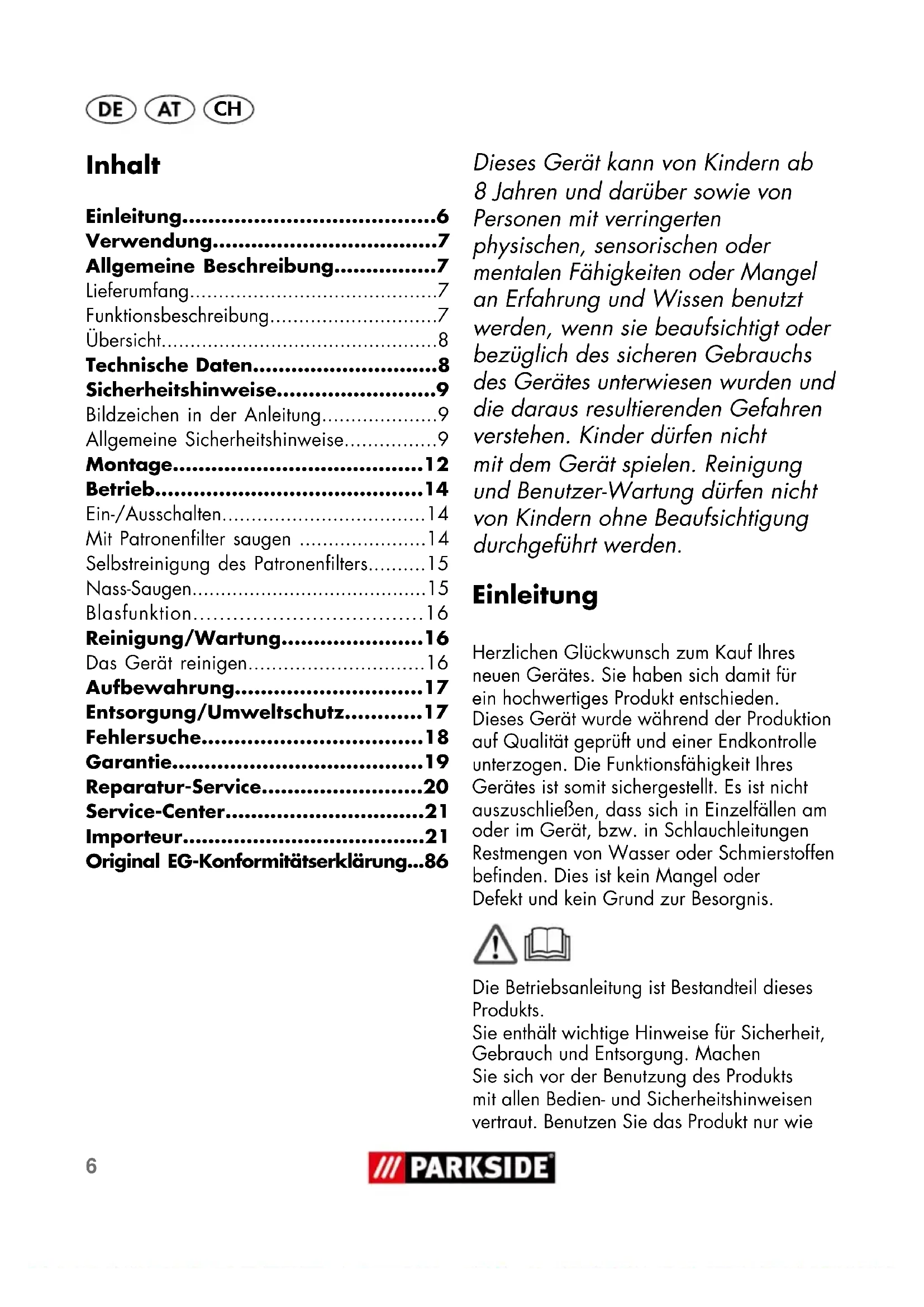 - Original EG-Konformitätserklärung Dieses Gerät kann von Kindern ab 8 Jahren und darüber sowie von Personen mit verringerten physischen, sensorischen oder mentalen Fähigkeiten oder Mangel an Erfahrung und Wissen benutzt werden, wenn sie beaufsichtigt oder bezüglich des sicheren Gebrauchs des Gerätes unterwiesen wurden und die daraus resultierenden Gefahren verstehen. Kinder dürfen nicht mit dem Gerät spielen. Reinigung und Benutzer-Wartung dürfen nicht von Kindern ohne Beaufsichtigung durchgeführt werden. Einleitung Herzlichen Glückwunsch zum Kauf Ihres neuen Gerätes. Sie haben sich damit für ein hochwertiges Produkt entschieden. Dieses Gerät wurde während der Produktion auf Qualität geprüft und einer Endkontrolle unterzogen. Die Funktionsfähigkeit Ihres Gerätes ist somit sichergestellt. Es ist nicht auszuschließen, dass sich in Einzelfällen am oder im Gerät, bzw. in Schlauchleitungen Restmengen von Wasser oder Schmierstoffen befinden. Dies ist kein Mangel oder Defekt und kein Grund zur Besorgnis. Die Betriebsanleitung ist Bestandteil dieses Produkts. Sie enthält wichtige Hinweise für Sicherheit, Gebrauch und Entsorgung. Machen Sie sich vor der Benutzung des Produkts mit allen Bedien- und Sicherheitshinweisen vertraut. Benutzen Sie das Produkt nur wie7 p. 86