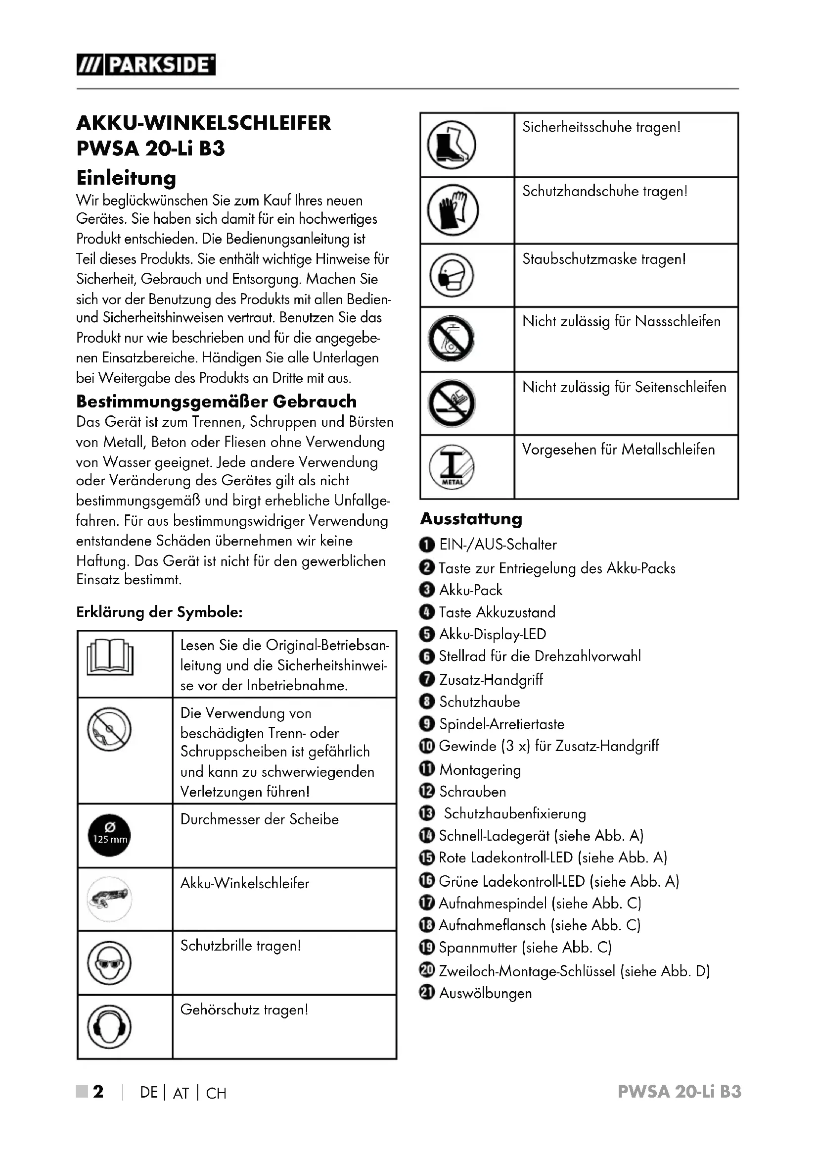 Wenn die Scheibe nach dem Wechsel unruhig läuft oder schwingt, muss diese Scheibe sofort wieder ausgewechselt werden. ♦ Lassen Sie das Gerät nach einem Scheiben- wechsel sicherheitshalber 60 Sekunden auf Höchstdrehzahl laufen. Achten Sie auf unge- wöhnliche Geräusche und Funkenentwicklung. ♦ Überprüfen Sie, ob alle Befestigungsteile korrekt angebracht sind. ♦ Achten Sie darauf, dass der Drehrichtungspfeil (falls vorhanden) auf den Trenn-, oder Schrupp- scheiben (auch Diamant-Trennscheiben) und die Drehrichtung des Gerätes (Drehrichtungspfeil auf dem Gerätekopf) übereinstimmen. Inbetriebnahme Ein- / ausschalten Überprüfen Sie das eingesetzte Werkzeug vor Gebrauch, ob alle Befestigungsteile korrekt ange- bracht sind. HINWEIS ► Schalten Sie den Winkelschleifer immer vor Materialkontakt ein und führen Sie das Gerät erst dann auf das Werkstück. Einschalten: ♦ Drücken Sie den EIN- /AUS-Schalter erst nach rechts, um ihn dann nach vorne zu schieben. Ausschalten: ♦ Lassen Sie den EIN- /AUS-Schalter wieder los. Dauerbetrieb einschalten: ♦ Drücken Sie den EIN- /AUS-Schalter erst nach rechts, um ihn dann nach vorne zu schie- ben. Drücken Sie den EIN- /AUS-Schalter dann zusätzlich vorne herunter, bis er einrastet. Dauerbetrieb ausschalten: ♦ Drücken Sie den EIN- /AUS-Schalter hinten herunter und lassen ihn dann los. Drehzahl einstellen Mit dem Stellrad für die Drehzahlvorwahl können Sie die Drehzahl vorwählen: (1 = geringere Drehzahl, 6 = größere Drehzahl). Wir empfehlen Ihnen, sie durch praktische Tests zu ermitteln. Die Drehzahl kann auch während des Betriebs verändert werden. Wartung und Reinigung WARNUNG! VERLETZUNGSGEFAHR! Schalten Sie vor allen Arbeiten am Gerät das Gerät aus und entnehmen Sie den Akku. Der Akku-Winkelschleifer ist wartungsfrei. ■ Verwenden Sie keine scharfen Gegenstände zur Reinigung des Gerätes. Es dürfen keine Flüssigkeiten in das Innere des Gerätes ge- langen. Andernfalls kann das Gerät beschädigt werden. ■ Reinigen Sie das Gerät regelmäßig, am besten immer direkt nach Abschluss der Arbeit. ■ Reinigen Sie das Gehäuse mit einem trockenen Tuch – verwenden Sie auf keinen Fall Benzin, Lö- sungsmittel oder Reiniger, die Kunststoff angreifen. ■ Zur gründlichen Reinigung des Gerätes wird ein Staubsauger benötigt. ■ Lüftungsöffnungen müssen immer frei sein. ■ Entfernen Sie anhaftenden Schleifstaub mit einem Pinsel. HINWEIS ► Nicht aufgeführte Ersatzteile (wie z. B. Kohlebürsten, Schalter) können Sie über unsere Service - Hotline bestellen. WARNUNG! ■ Verwenden Sie kein Zubehör welches nicht von PARKSIDE empfohlen wurde. Dies kann zu elektrischem Schlag und Feuer führen.PWSA 20-Li B3