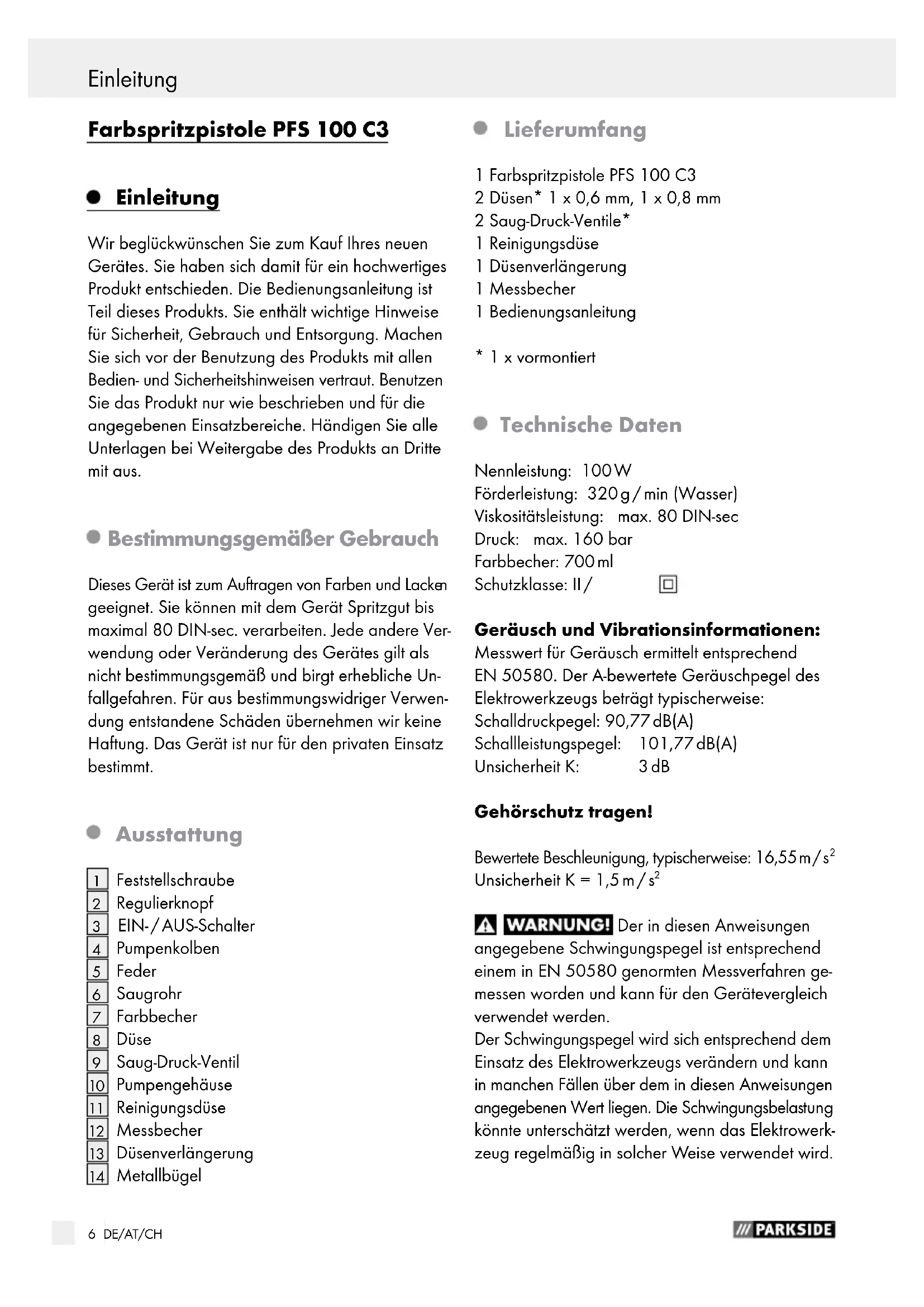 145 DE/AT/CH Einleitung Bestimmungsgemäßer Gebrauch .......................................................................................................Seite 6 Ausstattung ..........................................................................................................................................Seite 6 Lieferumfang ........................................................................................................................................ Seite 6 Technische Daten ................................................................................................................................Seite 6 Allgemeine Sicherheitshinweise für Elektrowerkzeuge 1. Arbeitsplatz-Sicherheit .................................................................................................................... Seite 7 2. Elektrische Sicherheit ......................................................................................................................Seite 7 3. Sicherheit von Personen .................................................................................................................Seite 7 4. Verwendung und Behandlung des Elektrowerkzeugs ..................................................................Seite 8 5. Service .............................................................................................................................................Seite 9 Ergänzende Sicherheitshinweise für Farbspritzpistolen .................................................................... Seite 9 Arbeitshinweise DIN-Sec / Viskosität .............................................................................................................................Seite 9 Spritzgut vorbereiten ...........................................................................................................................Seite 9 Spritzfläche vorbereiten ......................................................................................................................Seite 10 Inbetriebnahme Düse wählen ........................................................................................................................................Seite 10 Ein- / Ausschalten.................................................................................................................................Seite 10 Spritzvorgang ......................................................................................................................................Seite 10 Wartung und Reinigung .....................................................................................................Seite 11 Service ...............................................................................................................................................Seite 11 Garantie ........................................................................................................................................... Seite 11 Entsorgung .....................................................................................................................................Seite 12 Original-EG-Konformitätserklärung / Hersteller ............................................Seite 13 Inhaltsverzeichnis6 DE/AT/CH Einleitung / Allgemeine Sicherheitshinweise für ElektrowerkzeugeEinleitung Farbspritzpistole PFS 100 C3 Einleitung Wir beglückwünschen Sie zum Kauf Ihres neuen Gerätes. Sie haben sich damit für ein hochwertiges Produkt entschieden. Die Bedienungsanleitung ist Teil dieses Produkts. Sie enthält wichtige Hinweise für Sicherheit, Gebrauch und Entsorgung. Machen Sie sich vor der Benutzung des Produkts mit allen Bedien- und Sicherheitshinweisen vertraut. Benutzen Sie das Produkt nur wie beschrieben und für die angegebenen Einsatzbereiche. Händigen Sie alle Unterlagen bei Weitergabe des Produkts an Dritte mit aus. Bestimmungsgemäßer Gebrauch Dieses Gerät ist zum Auftragen von Farben und Lacke