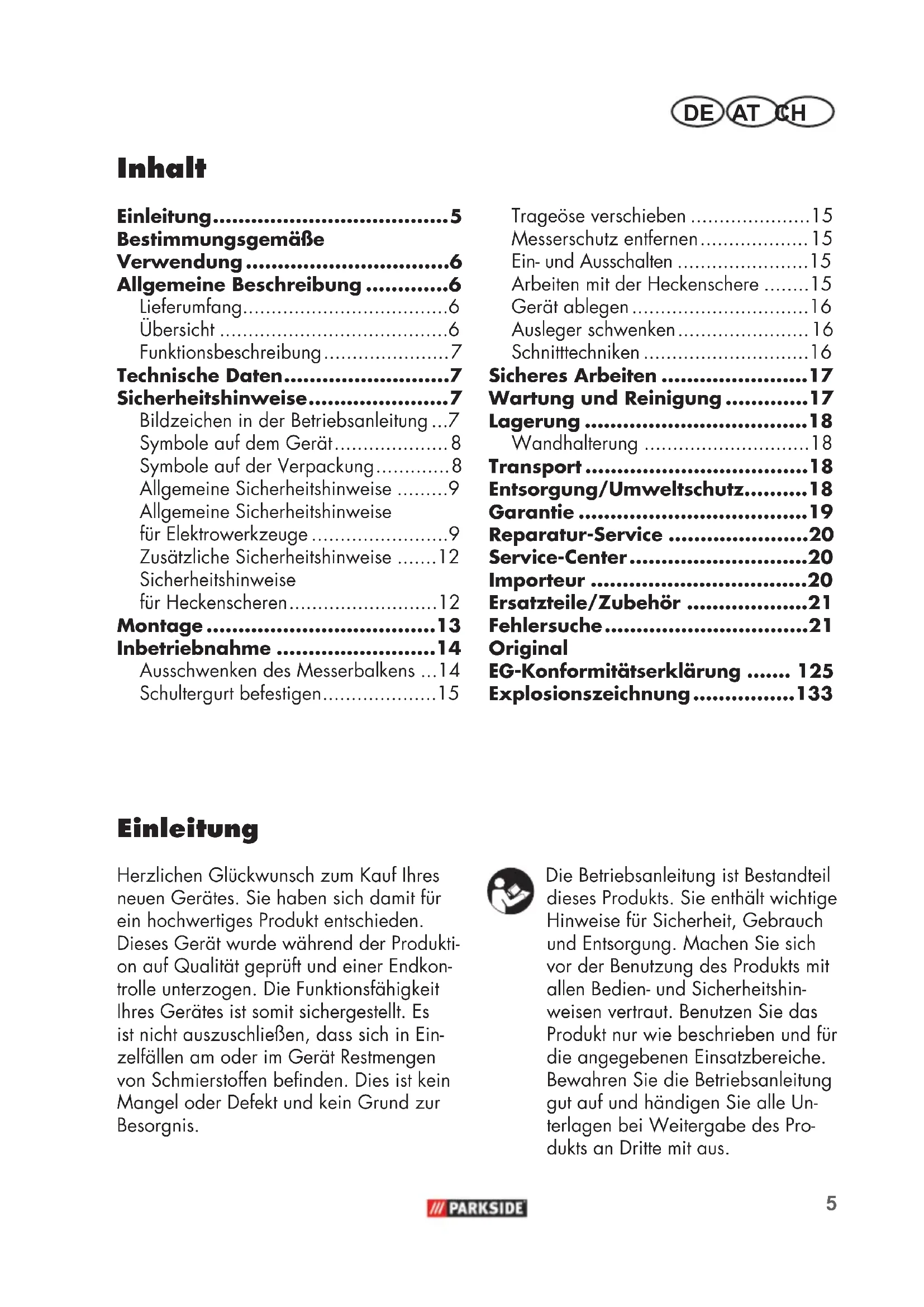 - ►45 DE AT CH Einleitung Herzlichen Glückwunsch zum Kauf Ihres neuen Gerätes. Sie haben sich damit für ein hochwertiges Produkt entschieden. Dieses Gerät wurde während der Produkti- on auf Qualität geprüft und einer Endkon- trolle unterzogen. Die Funktionsfähigkeit Ihres Gerätes ist somit sichergestellt. Es ist nicht auszuschließen, dass sich in Ein- zelfällen am oder im Gerät Restmengen von Schmierstoffen benden. Dies ist kein Mangel oder Defekt und kein Grund zur Besorgnis. Inhalt Einleitung p. 5