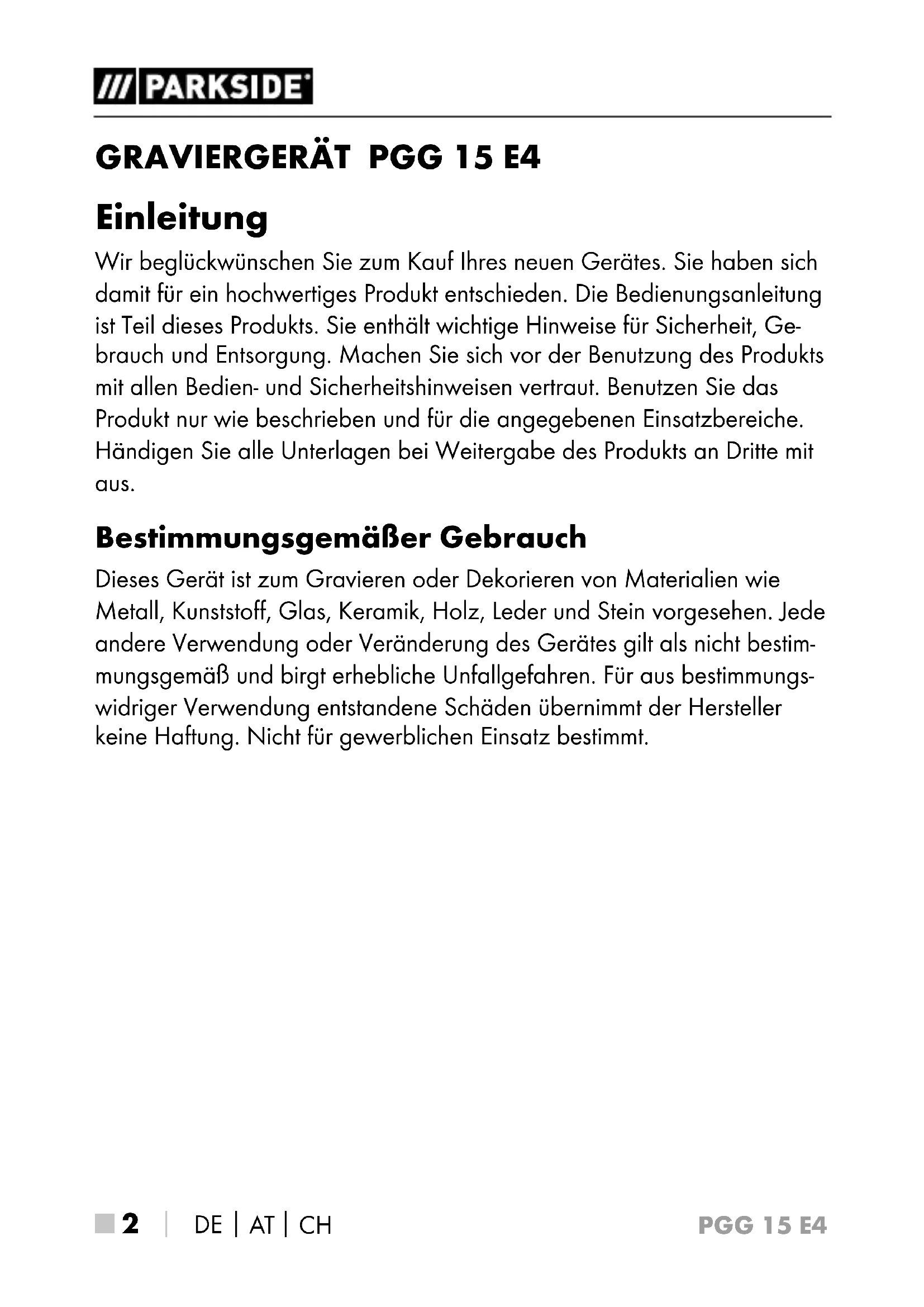 Einleitung Wir beglückwünschen Sie zum Kauf Ihres neuen Gerätes. Sie haben sich damit für ein hochwertiges Produkt entschieden. Die Bedienungsanleitung ist Teil dieses Produkts. Sie enthält wichtige Hinweise für Sicherheit, Ge- brauch und Entsorgung. Machen Sie sich vor der Benutzung des Produkts mit allen Bedien- und Sicherheitshinweisen vertraut. Benutzen Sie das Produkt nur wie beschrieben und für die angegebenen Einsatzbereiche. Händigen Sie alle Unterlagen bei Weitergabe des Produkts an Dritte mit aus. Bestimmungsgemäßer Gebrauch Dieses Gerät ist zum Gravieren oder Dekorieren von Materialien wie Metall, Kunststoff, Glas, Keramik, Holz, Leder und Stein vorgesehen. Jede andere Verwendung oder Veränderung des Gerätes gilt als nicht bestim- mungsgemäß und birgt erhebliche Unfallgefahren. Für aus bestimmungs- widriger Verwendung entstandene Schäden übernimmt der Hersteller keine Haftung. Nicht für gewerblichen Einsatz bestimmt.PGG 15 E4
