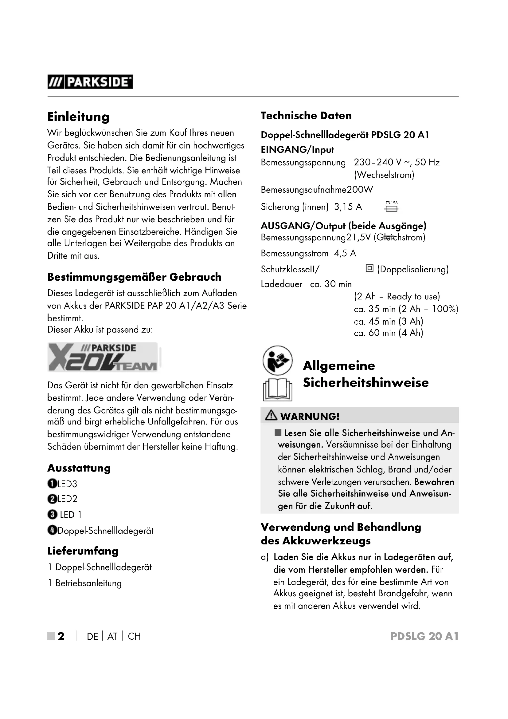 Einleitung Wir beglückwünschen Sie zum Kauf Ihres neuen Gerätes. Sie haben sich damit für ein hochwertiges Produkt entschieden. Die Bedienungsanleitung ist Teil dieses Produkts. Sie enthält wichtige Hinweise für Sicherheit, Gebrauch und Entsorgung. Machen Sie sich vor der Benutzung des Produkts mit allen Bedien- und Sicherheitshinweisen vertraut. Benut- zen Sie das Produkt nur wie beschrieben und für die angegebenen Einsatzbereiche. Händigen Sie alle Unterlagen bei Weitergabe des Produkts an Dritte mit aus. Bestimmungsgemäßer Gebrauch Dieses Ladegerät ist ausschließlich zum Aufladen von Akkus der PARKSIDE PAP 20 A1/A2/A3 Serie bestimmt. Dieser Akku ist passend zu: Das Gerät ist nicht für den gewerblichen Einsatz bestimmt. Jede andere Verwendung oder Verän- derung des Gerätes gilt als nicht bestimmungsge- mäß und birgt erhebliche Unfallgefahren. Für aus bestimmungswidriger Verwendung entstandene Schäden übernimmt der Hersteller keine Haftung. Ausstattung LED 3 LED 2 LED 1 Doppel-Schnellladegerät Lieferumfang 1 Doppel-Schnellladegerät 1 Betriebsanleitung Technische Daten Doppel-Schnellladegerät PDSLG 20 A1 EINGANG/Input Bemessungsspannung 230–240 V ∼, 50 Hz (Wechselstrom) Bemessungsaufnahme 200 W Sicherung (innen) 3,15 A T3.15A AUSGANG/Output (beide Ausgänge) Bemessungsspannung 21,5 V (Gleichstrom) Bemessungsstrom 4,5 A Schutzklasse II / (Doppelisolierung) Ladedauer ca. 30 min (2 Ah – Ready to use) ca. 35 min (2 Ah – 100%) ca. 45 min (3 Ah) ca. 60 min (4 Ah) Allgemeine Sicherheitshinweise WARNUNG! ■ Lesen Sie alle Sicherheitshinweise und An- weisungen. Versäumnisse bei der Einhaltung der Sicherheitshinweise und Anweisungen können elektrischen Schlag, Brand und/oder schwere Verletzungen verursachen. Bewahren Sie alle Sicherheitshinweise und Anweisun- gen für die Zukunft auf. Verwendung und Behandlung desAkkuwerkzeugs a) Laden Sie die Akkus nur in Ladegeräten auf, die vom Hersteller empfohlen werden. Für ein Ladegerät, das für eine bestimmte Art von Akkus geeignet ist, besteht Brandgefahr, wenn es mit anderen Akkus verwendet wird.PDSLG 20 A1