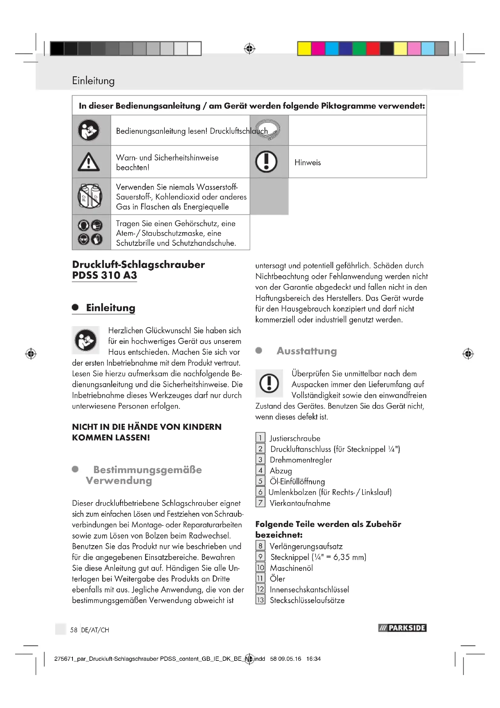 St. Ingbert, 15.05.2017 i.o. Marc Uhle 275671_par_Druckluft-Schlagschrauber PDSS_content_GB_IE_DK_BE_NL.indd 55 09.05.16 16:34 Documentatiegelastigde56 Inhaltsverzeichnis 275671_par_Druckluft-Schlagschrauber PDSS_content_GB_IE_DK_BE_NL.indd 56 09.05.16 16:3457 DE/AT/CH Einleitung ......................................................................................................................................... Seite 58 Bestimmungsgemäße Verwendung ....................................................................................................Seite 58 Ausstattung ..........................................................................................................................................Seite 58 Technische Daten ................................................................................................................................Seite 59 Sicherheitshinweise für Druckluftwerkzeuge ..................................................Seite 59 Gefährdungen durch herausgeschleuderte Teile .............................................................................. Seite 61 Gefährdungen durch Erfassen / Aufwickeln ...................................................................................... Seite 61 Gefährdungen im Betrieb ................................................................................................................... Seite 62 Gefährdungen durch wiederholte Bewegungen ..............................................................................Seite 62 Gefährdungen durch Zubehörteile ....................................................................................................Seite 62 Gefährdungen am Arbeitsplatz .........................................................................................................Seite 63 Gefährdungen durch Staub und Dämpfe ..........................................................................................Seite 63 Gefährdungen durch Lärm .................................................................................................................Seite 63 Gefährdungen durch Schwingungen.................................................................................................Seite 64 Zusätzliche Sicherheitsan weisungen für pneumatische Maschinen .................................................Seite 64 Inbetriebnahme ......................................................................................................................... Seite 64 Steckschlüsselaufsätze oder Bit einsetzen .........................................................................................Seite 64 Anschlüsse vornehmen ........................................................................................................................Seite 65 Druckluft einstellen ..............................................................................................................................Seite 65 Drehmoment einstellen ........................................................................................................................Seite 65 In Betrieb nehmen ...............................................................................................................................Seite 65 Drehrichtung ändern ...........................................................................................................................Seite 66 Gerät richtig halten .............................................................................................................................Seite 66 Nach der Inbetriebnahme ................................................................................................Seite 66 Wartung ...........................................................................................................................................Seite 66 Reinigung und Pflege ............................................................................................................Seite 67 Fehlerbehebung ........................................................................................................................Seite 67 Hinweise zu Garantie und Serviceabwicklung ..............................................Seite 68 Garantiebedingungen ........................................................................................................................Seite 68 Garantieumfang .................................................................................................................................. Seite 68 Abwicklung im Garantiefall ................................................................................................................Seite 68 Umwelthinweise und Entsorgungsangaben ..................................................... Seite 69 EG-Konformitätserklärung ............................................................................................... Seite 69 Inhaltsverzeichnis 275671_par_Druckluft-Schlagschrauber PDSS_content_GB_IE_DK_BE_NL.indd 57 09.05.16 16:3458 DE/AT/CH Druckluft-Schlagschrauber PDSS 310 A3 Einleitung Herzlichen Glückwunsch! Sie haben sich für ein hochwertiges Gerät aus unserem Haus entschieden. Machen Sie sich vor der ersten Inbetriebnahme mit dem Produkt vertraut. Lesen Sie hierzu aufmerksam die nachfolgende Be- dienungsanleitung und die Sicherheitshinweise. Die Inbetriebnahme dieses Werkzeuges darf nur durch unterwiesene Personen erfolgen. NICHT IN DIE HÄNDE VON KINDERN KOMMEN LASSEN! Bestimmungsgemäße Verwendung Dieser druckluftbetriebene Schlagschrauber eignet sich zum einfachen Lösen und Festziehen von Schraub- verbindungen bei Montage- oder Reparaturarbeiten sowie zum Lösen von Bolzen beim Radwechsel. Benutzen Sie das Produkt nur wie beschrieben und für die angegebenen Einsatzbereiche. Bewahren Sie diese Anleitung gut auf. Händigen Sie alle Un- terlagen bei Weitergabe des Produkts an Dritte ebenfalls mit aus. Jegliche Anwendung, die von der bestimmungsgemäßen Verwendung 