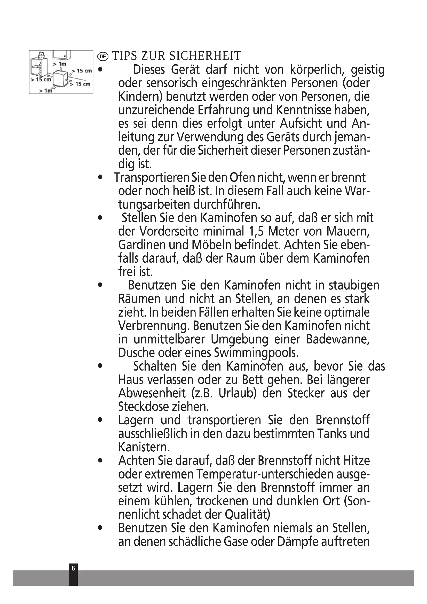 - Stellen Sie den Kaminofen so auf, daß er sich mit der Vorderseite minimal 1,5 Meter von Mauern, Gardinen und Möbeln befindet. Achten Sie eben- falls darauf, daß der Raum über dem Kaminofen frei ist.