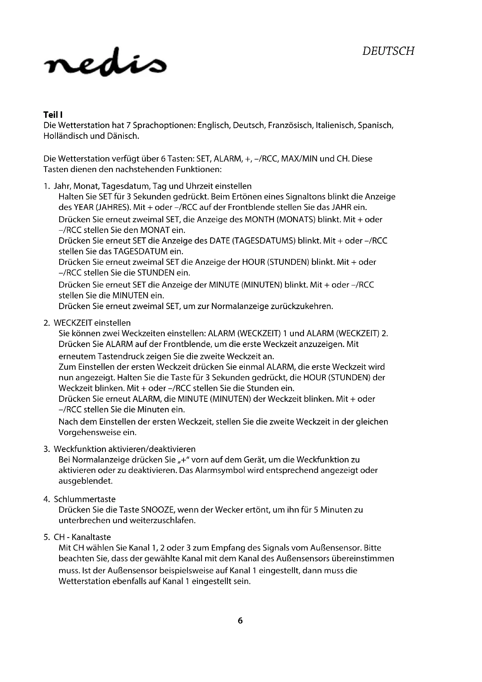 VORSICHT STROMSCHLAGGEFAHR NICHT ÖFFNEN Sicherheitsvorkehrungen: Um das Risiko eines elektrischen Schlags zu verringern, sollte dieses Produkt AUSSCHLIESSLICH von einem autorisierten Techniker geönet werden. Trennen Sie das Produkt von anderen Geräten, wenn ein Problem auftreten sollte. Setzen Sie das Gerät nicht Wasser oder Feuchtigkeit aus. Wartung: Nur mit einem trockenen Tuch säubern. Keine Reinigungs- oder Scheuermittel verwenden. Garantie: Es kann keine Garantie oder Haftung für irgendwelche Änderungen oder Modikationen des Produkts oder für Schäden übernommen werden, die aufgrund einer nicht ordnungsgemäßen Anwendung des Produkts entstanden sind. Allgemeines: Design und technische Daten unterliegen unangekündigten Änderungen. Alle Logos, Marken und Produktnamen sind Marken oder eingetragene Marken ihrer jeweiligen Eigentümer und werden hiermit als solche anerkannt. Bitte bewahren Sie Bedienungsanleitung und Verpackung für spätere Verwendung auf. Achtung: Dieses Produkt ist mit diesem Symbol gekennzeichnet. Es bedeutet, dass die ausgedienten elektrischen und elektronischen Produkte nicht mit dem allgemeinen Haushaltsmüll entsorgt werden dürfen. Für diese Produkte stehen gesonderte Sammelsysteme zur Verfügung. Dieses Produkt wurde hergestellt und geliefert in Übereinstimmung mit allen geltenden Vorschriften und Richtlinien, die für alle Mitgliedsstaaten der Europäischen Union gültig sind. Es entspricht allen geltenden Vorschriften und Bestimmungen im Land des Vertriebs. Eine formale Dokumentation ist auf Anfrage erhältlich. Diese beinhaltet unter anderem, jedoch nicht ausschließlich: Konformitätserklärung (und Produktidentität), Sicherheitsdatenblatt, Testreport des Produkts. Wenden Sie sich bei Fragen bitte an unseren Kundendienst: per Internet: http://www.nedis.de/de-de/kontakt/kontaktformular.htm per E-Mail: service@nedis.com per Telefon: Niederlande +31 (0)73-5993965 (während der Geschäftszeiten) NEDIS B.V., De Tweeling 28, 5215 MC ’s-Hertogenbosch, NIEDERLANDE10 FRANÇAIS Partie I Cette station météo comprend 7 langues diérentes : Anglais, Allemand, Français, Italien, Espagnol, Hollandais et Danois. La station météorologique est munie de 6 boutons diérents : SET, ALARM, +, –/RCC, MAX/MIN. et CH. Voici les fonctions des diérentes touches :