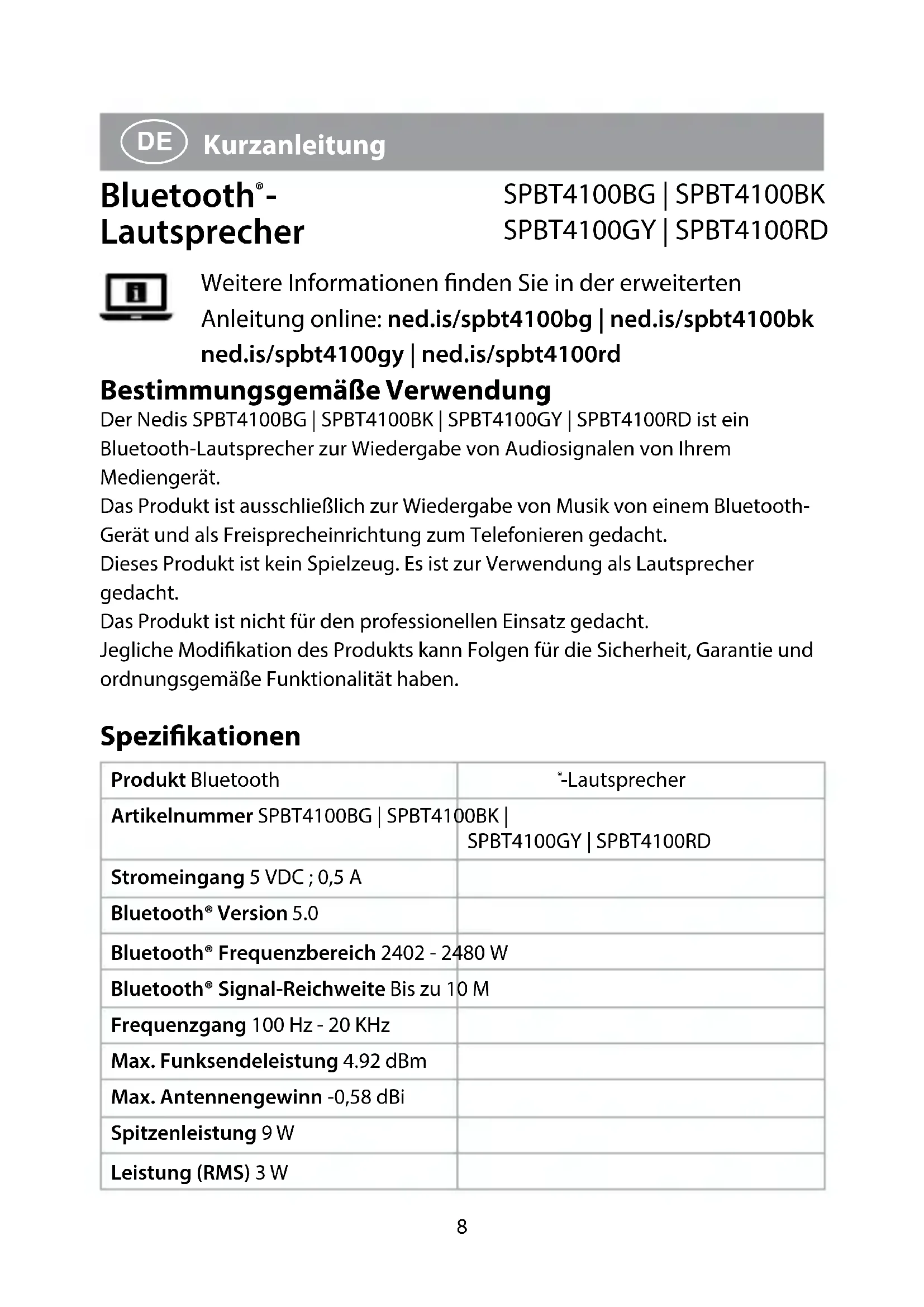 Weitere Informationen nden Sie in der erweiterten Anleitung online: ned.is/spbt4100bg | ned.is/spbt4100bk ned.is/spbt4100gy | ned.is/spbt4100rd Bestimmungsgemäße Verwendung Der Nedis SPBT4100BG | SPBT4100BK | SPBT4100GY | SPBT4100RD ist ein Bluetooth-Lautsprecher zur Wiedergabe von Audiosignalen von Ihrem Mediengerät. Das Produkt ist ausschließlich zur Wiedergabe von Musik von einem Bluetooth- Gerät und als Freisprecheinrichtung zum Telefonieren gedacht. Dieses Produkt ist kein Spielzeug. Es ist zur Verwendung als Lautsprecher gedacht. Das Produkt ist nicht für den professionellen Einsatz gedacht. Jegliche Modikation des Produkts kann Folgen für die Sicherheit, Garantie und ordnungsgemäße Funktionalität haben. Spezikationen Produkt Bluetooth