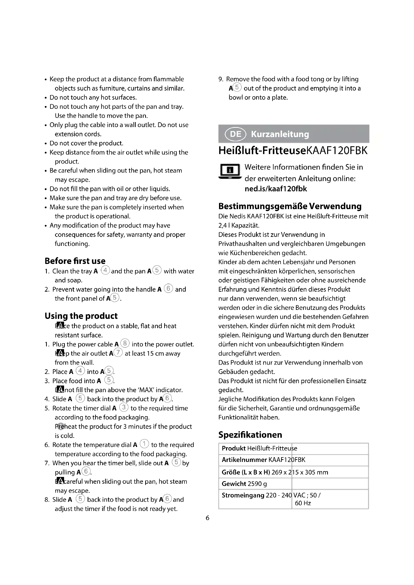 Kurzanleitung Heißluft-FritteuseKAAF120FBK Weitere Informationen nden Sie in der erweiterten Anleitung online: ned.is/kaaf120fbk Bestimmungsgemäße Verwendung Die Nedis KAAF120FBK ist eine Heißluft-Fritteuse mit 2,4l Kapazität.Dieses Produkt ist zur Verwendung in Privathaushalten und vergleichbaren Umgebungen wie Küchenbereichen gedacht.Kinder ab dem achten Lebensjahr und Personen mit eingeschränkten körperlichen, sensorischen oder geistigen Fähigkeiten oder ohne ausreichende Erfahrung und Kenntnis dürfen dieses Produkt nur dann verwenden, wenn sie beaufsichtigt werden oder in die sichere Benutzung des Produkts eingewiesen wurden und die bestehenden Gefahren verstehen. Kinder dürfen nicht mit dem Produkt spielen. Reinigung und Wartung durch den Benutzer dürfen nicht von unbeaufsichtigten Kindern durchgeführt werden.Das Produkt ist nur zur Verwendung innerhalb von Gebäuden gedacht.Das Produkt ist nicht für den professionellen Einsatz gedacht.Jegliche Modikation des Produkts kann Folgen für die Sicherheit, Garantie und ordnungsgemäße Funktionalität haben. Spezikationen Produkt Heißluft-FritteuseArtikelnummer KAAF120FBKGröße (L x B x H) 269 x 215 x 305 mmGewicht 2590 gStromeingang 220 - 240 VAC ; 50 / 60 Hz• Keep the product at a distance from ammable objects such as furniture, curtains and similar.• Do not touch any hot surfaces.• Do not touch any hot parts of the pan and tray. Use the handle to move the pan.• Only plug the cable into a wall outlet. Do not use extension cords.• Do not cover the product.• Keep distance from the air outlet while using the product.• Be careful when sliding out the pan, hot steam may escape.• Do not ll the pan with oil or other liquids.• Make sure the pan and tray are dry before use.• Make sure the pan is completely inserted when the product is operational.• Any modication of the product may have consequences for safety, warranty and proper functioning. Before rst use