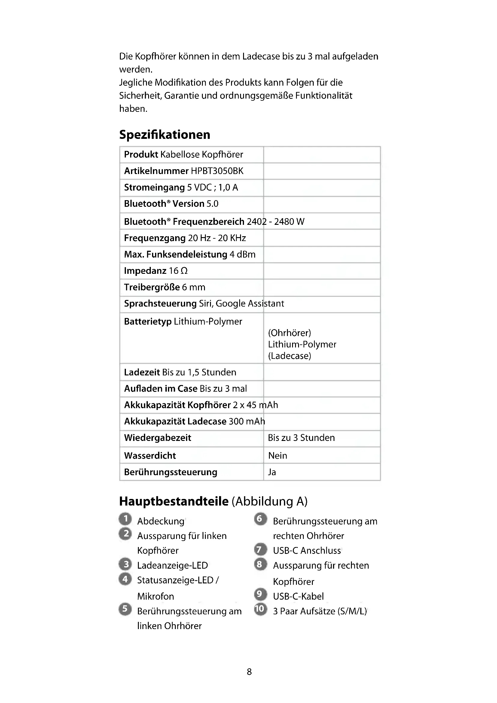 Kurzanleitung Kabellose Kopfhörer HPBT3050BK Weitere Informationen nden Sie in der erweiterten Anleitung online: ned.is/hpbt3050bk Bestimmungsgemäße Verwendung Das Nedis HPBT3050BK ist ein vollständig kabelloses Kopfhörerset.Das Produkt kann mit jedem Bluetooth-fähigen Audio-/Videogerät gekoppelt werden.8 Die Kopfhörer können in dem Ladecase bis zu 3 mal aufgeladen werden. Jegliche Modikation des Produkts kann Folgen für die Sicherheit, Garantie und ordnungsgemäße Funktionalität haben. Spezikationen Produkt Kabellose Kopfhörer Artikelnummer HPBT3050BK Stromeingang 5 VDC ; 1,0 A Bluetooth® Version 5.0 Bluetooth® Frequenzbereich 2402 - 2480 W Frequenzgang 20 Hz - 20 KHz Max. Funksendeleistung 4 dBm Impedanz 16 Ω Treibergröße 6 mm Sprachsteuerung Siri, Google Assistant Batterietyp Lithium-Polymer (Ohrhörer) Lithium-Polymer (Ladecase) Ladezeit Bis zu 1,5 Stunden Auaden im Case Bis zu 3 mal Akkukapazität Kopfhörer 2 x 45 mAh Akkukapazität Ladecase 300 mAh Wiedergabezeit Bis zu 3 Stunden Wasserdicht Nein Berührungssteuerung Ja Hauptbestandteile (Abbildung A)