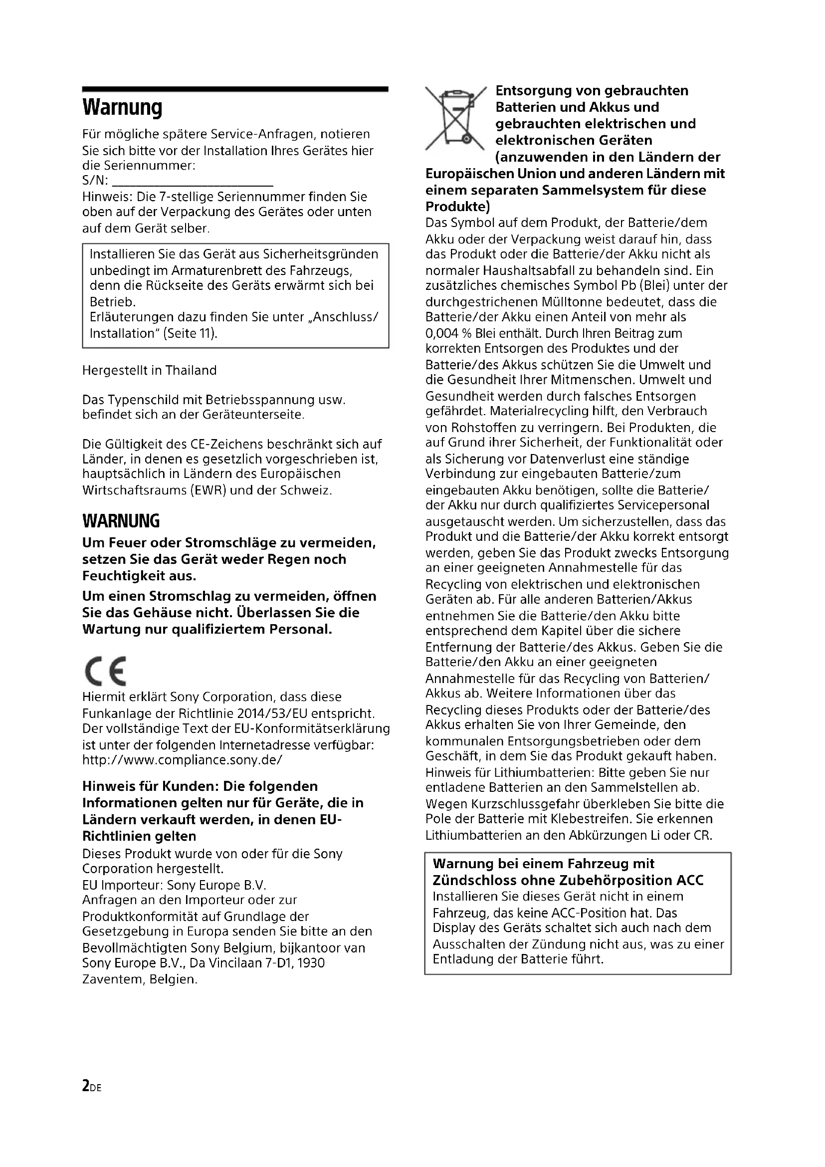 Vers tableau de bord/console centralePièces fournies avec votre véhicule SupportSupport15FR Lorsque vous remplacez le fusible, veillez à utiliser un fusible dont l’intensité nominale correspond à la valeur indiquée sur le fusible usagé. Si le fusible saute, vérifiez le branchement de l’alimentation et remplacez-le. Si le nouveau fusible saute également, il est possible que l’appareil soit défectueux. Dans ce cas, consultez votre revendeur Sony le plus proche. Remplacement du fusible Fusible (10 A)2DE Warnung Für mögliche spätere Service-Anfragen, notieren Sie sich bitte vor der Installation Ihres Gerätes hier die Seriennummer: S/N: ___________________________ Hinweis: Die 7-stellige Seriennummer finden Sie oben auf der Verpackung des Gerätes oder unten auf dem Gerät selber. Hergestellt in Thailand Das Typenschild mit Betriebsspannung usw. befindet sich an der Geräteunterseite. Die Gültigkeit des CE-Zeichens beschränkt sich auf Länder, in denen es gesetzlich vorgeschrieben ist, hauptsächlich in Ländern des Europäischen Wirtschaftsraums (EWR) und der Schweiz. WARNUNG Um Feuer oder Stromschläge zu vermeiden, setzen Sie das Gerät weder Regen noch Feuchtigkeit aus. Um einen Stromschlag zu vermeiden, öffnen Sie das Gehäuse nicht. Überlassen Sie die Wartung nur qualifiziertem Personal. Hiermit erklärt Sony Corporation, dass diese Funkanlage der Richtlinie 2014/53/EU entspricht. Der vollständige Text der EU-Konformitätserklärung ist unter der folgenden Internetadresse verfügbar: http://www.compliance.sony.de/ Hinweis für Kunden: Die folgenden Informationen gelten nur für Geräte, die in Ländern verkauft werden, in denen EU- Richtlinien gelten Dieses Produkt wurde von oder für die Sony Corporation hergestellt. EU Importeur: Sony Europe B.V. Anfragen an den Importeur oder zur Produktkonformität auf Grundlage der Gesetzgebung in Europa senden Sie bitte an den Bevollmächtigten Sony Belgium, bijkantoor van Sony Europe B.V., Da Vincilaan 7-D1, 1930 Zaventem, Belgien. Entsorgung von gebrauchten Batterien und Akkus und gebrauchten elektrischen und elektronischen Geräten (anzuwenden in den Ländern der Europäischen Union und anderen Ländern mit einem separaten Sammelsystem für diese Produkte) Das Symbol auf dem Produkt, der Batterie/dem Akku oder der Verpackung weist darauf hin, dass das Produkt oder die Batterie/der Akku nicht als normaler Haushaltsabfall zu behandeln sind. Ein zusätzliches chemisches Symbol Pb (Blei) unter der durchgestrichenen Mülltonne bedeutet, dass die Batterie/der Akku einen Anteil von mehr als 0,004 % Blei enthält. Durch Ihren Beitrag zum korrekten Entsorgen des Produktes und der Batterie/des Akkus schützen Sie die Umwelt und die Gesundheit Ihrer Mitmenschen. Umwelt und Gesundheit werden durch falsches Entsorgen gefährdet. Materialrecycling hilft, den Verbrauch von Rohstoffen zu verringern. Bei Produkten, die auf Grund ihrer Sicherheit, der Funktionalität oder als Sicherung vor Datenverlust eine ständige Verbindung zur eingebauten Batterie/zum eingebauten Akku benötigen, sollte die Batterie/ der Akku nur durch qualifiziertes Servicepersonal ausgetauscht werden. Um sicherzustellen, dass das Produkt und die Batterie/der Akku korrekt entsorgt werden, geben Sie das Produkt zwecks Entsorgung an einer geeigneten Annahmestelle für das Recycling von elektrischen und elektronischen Geräten ab. Für alle anderen Batterien/Akkus entnehmen Sie die Batterie/den Akku bitte entsprechend dem Kapitel über die sichere Entfernung der Batterie/des Akkus. Geben Sie die Batterie/den Akku an einer geeigneten Annahmestelle für das Recycling von Batterien/ Akkus ab. Weitere Informationen über das Recycling dieses Produkts oder der Batterie/des Akkus erhalten Sie von Ihrer Gemeinde, den kommunalen Entsorgungsbetrieben oder dem Geschäft, in dem Sie das Produkt gekauft haben. Hinweis für Lithiumbatterien: Bitte geben Sie nur entladene Batterien an den Sammelstellen ab. Wegen Kurzschlussgefahr überkleben Sie bitte die Pole der Batterie mit Klebestreifen. Sie erkennen Lithiumbatterien an den Abkürzungen Li oder CR. Installieren Sie das Gerät aus Sicherheitsgründen unbedingt im Armaturenbrett des Fahrzeugs, denn die Rückseite des Geräts erwärmt sich bei Betrieb. Erläuterungen dazu finden Sie unter „Anschluss/ Installation“ (Seite 11). Warnung bei einem Fahrzeug mit Zündschloss ohne Zubehörposition ACC Installieren Sie dieses Gerät nicht in einem Fahrzeug, das keine ACC-Position hat. Das Display des Geräts schaltet sich auch nach dem Ausschalten der Zündung nicht aus, was zu einer Entladung der Batterie führt.3DE Haftungsausschluss für von Dritten angebotene Dienste Von Dritten angebotene Dienste können ohne vorherige Ankündigung geändert, ausgesetzt oder eingestellt werden. Sony übernimmt in diesen Fällen keine Haftung. Vorsicht UNTER KEINEN UMSTÄNDEN ÜBERNIMMT SONY DIE HAFTUNG FÜR INDIREKTE, NEBEN-, FOLGE- ODER