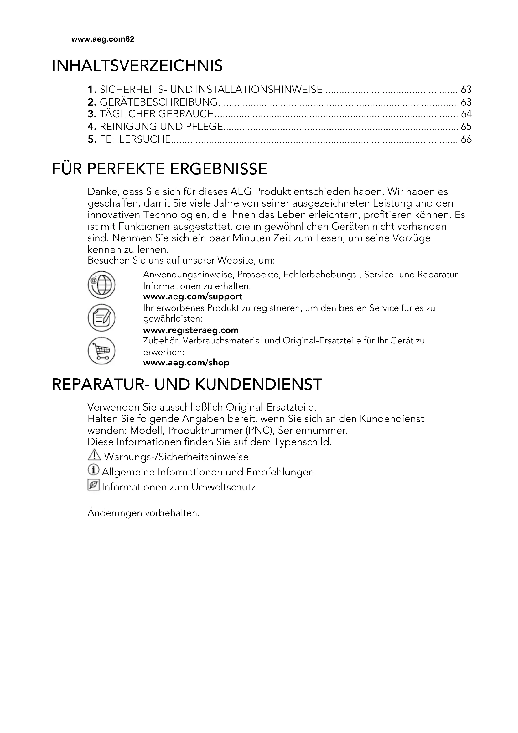 Danke, dass Sie sich für dieses AEG Produkt entschieden haben. Wir haben es geschaffen, damit Sie viele Jahre von seiner ausgezeichneten Leistung und den innovativen Technologien, die Ihnen das Leben erleichtern, profitieren können. Es ist mit Funktionen ausgestattet, die in gewöhnlichen Geräten nicht vorhanden sind. Nehmen Sie sich ein paar Minuten Zeit zum Lesen, um seine Vorzüge kennen zu lernen. Besuchen Sie uns auf unserer Website, um: Anwendungshinweise, Prospekte, Fehlerbehebungs-, Service- und Reparatur- Informationen zu erhalten: www.aeg.com/support Ihr erworbenes Produkt zu registrieren, um den besten Service für es zu gewährleisten: www.registeraeg.com Zubehör, Verbrauchsmaterial und Original-Ersatzteile für Ihr Gerät zu erwerben: www.aeg.com/shop