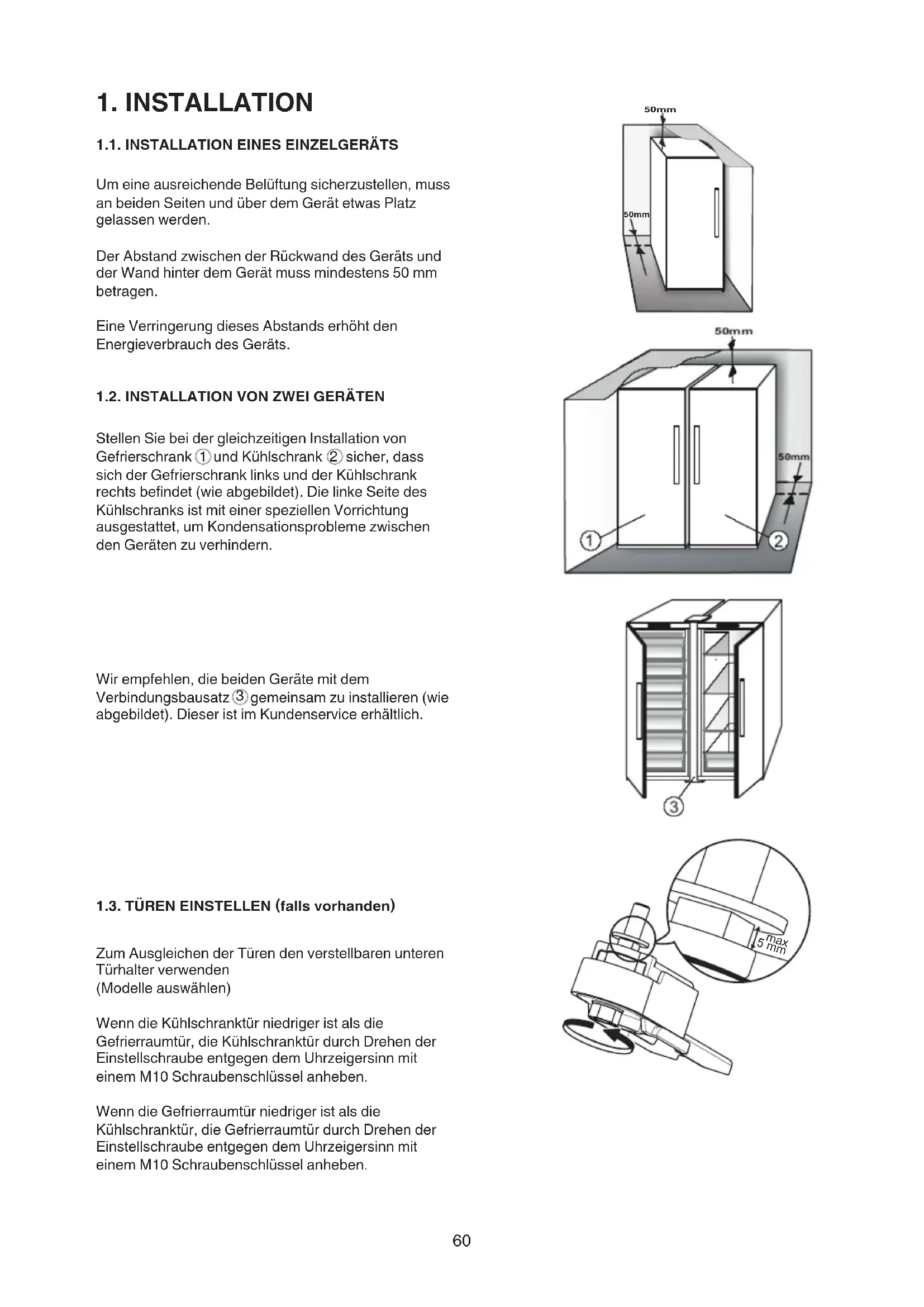 gemeinsam zu installieren (wie abgebildet). Dieser ist im Kundenservice erhältlich. 1.3. TÜREN EINSTELLEN (falls vorhanden) Zum Ausgleichen der Türen den verstellbaren unteren Türhalter verwenden (Modelle auswählen) Wenn die Kühlschranktür niedriger ist als die Gefrierraumtür, die Kühlschranktür durch Drehen der Einstellschraube entgegen dem Uhrzeigersinn mit einem M10 Schraubenschlüssel anheben. Wenn die Gefrierraumtür niedriger ist als die Kühlschranktür, die Gefrierraumtür durch Drehen der Einstellschraube entgegen dem Uhrzeigersinn mit einem M10 Schraubenschlüssel anheben. 50mm 50mm 5 mm max61
