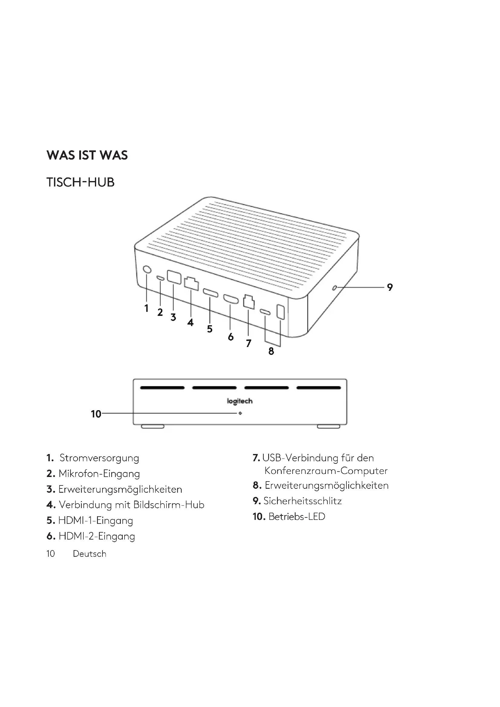 Hub und Kamera abgeschlossen ist, hört die LED auf zu blinken. Wenn das Pairing fehlschlägt, blinkendieLEDs 2Minuten lang weiter und gehen dann aus. Beginnen Sie erneut mit Schritt2 undwiederholenSie den Vorgang. KAMERAEINSTELLUNGS-APP Dieses Programm dient zur Steuerung der Schwenk-, Neige- und Zoom- Funktionen der Kamera sowie zum Anpassen der Bildqualität (wie zum Beispiel Helligkeit und Kontrast) von einem Computer aus. Die Software ist zum Download verfügbar unter www.logitech.com/support/Rally.16 Deutsch ERWEITERUNGS-