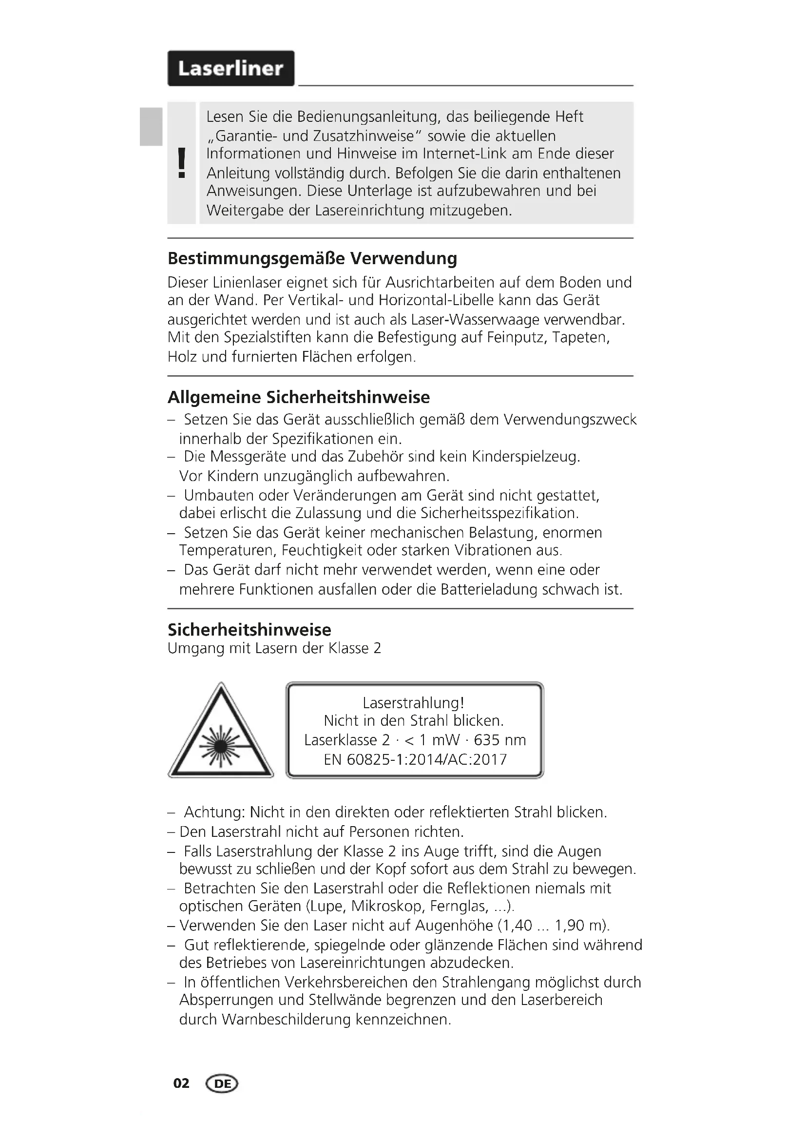 Lesen Sie die Bedienungsanleitung, das beiliegende Heft „Garantie- und Zusatzhinweise“ sowie die aktuellen Informationen und Hinweise im Internet-Link am Ende dieser Anleitung vollständig durch. Befolgen Sie die darin enthaltenen Anweisungen. Diese Unterlage ist aufzubewahren und bei Weitergabe der Lasereinrichtung mitzugeben.
