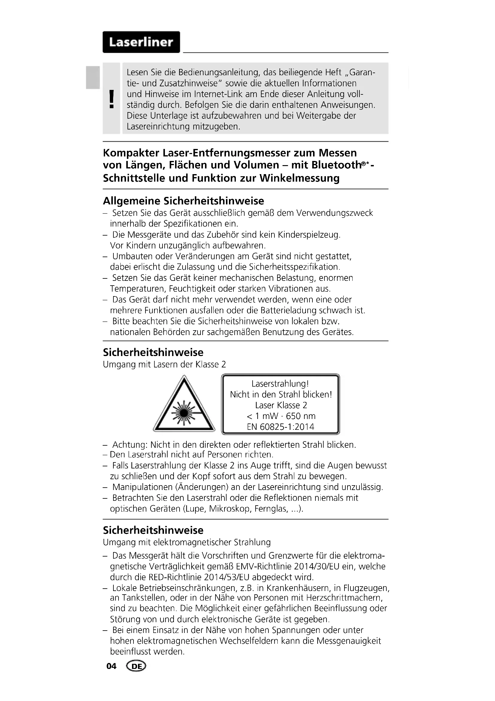 Allgemeine Sicherheitshinweise – Setzen Sie das Gerät ausschließlich gemäß dem Verwendungszweck innerhalb der Spezikationen ein. – Die Messgeräte und das Zubehör sind kein Kinderspielzeug. Vor Kindern unzugänglich aufbewahren. – Umbauten oder Veränderungen am Gerät sind nicht gestattet, dabei erlischt die Zulassung und die Sicherheitsspezikation. – Setzen Sie das Gerät keiner mechanischen Belastung, enormen Temperaturen, Feuchtigkeit oder starken Vibrationen aus. – Das Gerät darf nicht mehr verwendet werden, wenn eine oder mehrere Funktionen ausfallen oder die Batterieladung schwach ist. – Bitte beachten Sie die Sicherheitshinweise von lokalen bzw. nationalen Behörden zur sachgemäßen Benutzung des Gerätes. – Achtung: Nicht in den direkten oder reektierten Strahl blicken. – Den Laserstrahl nicht auf Personen richten. – Falls Laserstrahlung der Klasse 2 ins Auge trifft, sind die Augen bewusst zu schließen und der Kopf sofort aus dem Strahl zu bewegen. – Manipulationen (Änderungen) an der Lasereinrichtung sind unzulässig. – Betrachten Sie den Laserstrahl oder die Reektionen niemals mit optischen Geräten (Lupe, Mikroskop, Fernglas, ...). Sicherheitshinweise Umgang mit Lasern der Klasse 2 Laserstrahlung! Nicht in den Strahl blicken! Laser Klasse 2 < 1 mW · 650 nm EN 60825-1:2014 Sicherheitshinweise Umgang mit elektromagnetischer Strahlung – Das Messgerät hält die Vorschriften und Grenzwerte für die elektroma- gnetische Verträglichkeit gemäß EMV-Richtlinie 2014/30/EU ein, welche durch die RED-Richtlinie 2014/53/EU abgedeckt wird. – Lokale Betriebseinschränkungen, z.B. in Krankenhäusern, in Flugzeugen, an Tankstellen, oder in der Nähe von Personen mit Herzschrittmachern, sind zu beachten. Die Möglichkeit einer gefährlichen Beeinussung oder Störung von und durch elektronische Geräte ist gegeben. – Bei einem Einsatz in der Nähe von hohen Spannungen oder unter hohen elektromagnetischen Wechselfeldern kann die Messgenauigkeit beeinusst werden.LaserRange-Master T4 Pro