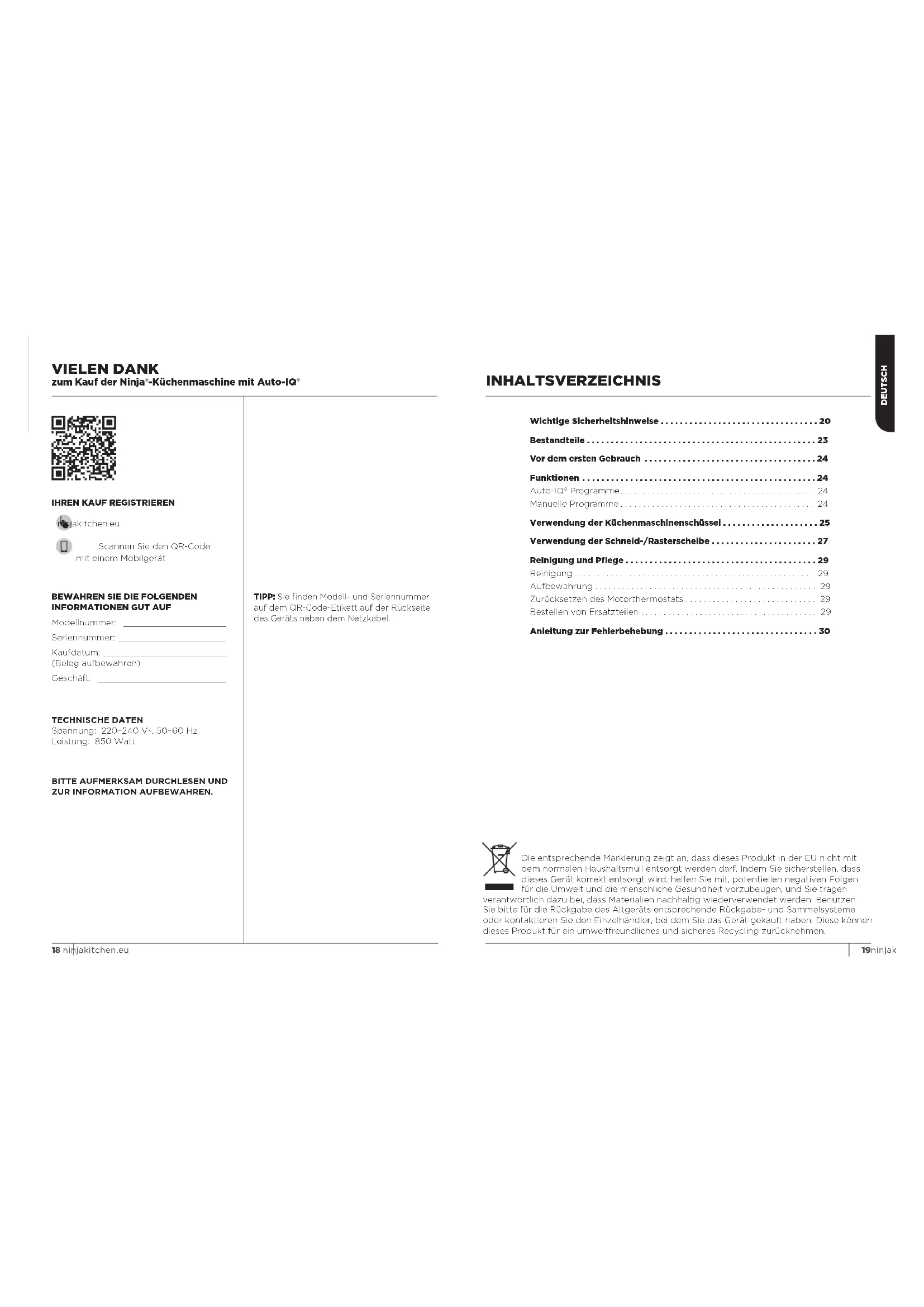 - Wenn Reparaturen oder Änderungen, die nicht von Ninja und seinen Handelsvertretern oder Vertragshändlern, sondern von Dritten durchgeführt wurden, es sei denn, Sie können nachweisen, dass die Reparaturen oder Änderungen, die von anderen durchgeführt wurden, nicht mit dem Mangel zusammenhängen, für den Sie die erweiterte Garantie ausüben. Was geschieht, wenn meine Garantie ausläuft? Ninja stellt keine Geräte her, die nur für eine begrenzte Zeit funktionieren. Wir wissen es zu schätzen, wenn Kunden ihr Küchengerät auch nach Ablauf der Garantiefrist reparieren lassen möchten. Bitte kontaktieren Sie in diesem Falle unsere Kundendienst-Hotline unter der Rufnummer 0800 000 9063 und fragen Sie nach unserem Kundenprogramm für abgelaufene Garantien. Wo kann ich Originalersatzteile und Originalzubehör von Ninja kaufen? Ersatzteile und Zubehör von Ninja werden von denselben Ingenieuren entwickelt, die auch IhrNinja-Küchengerät entwickelt haben. Die vollständige Palette der Ersatz- und Zubehörteile vonNinja für alle Ninja-Geräte fi nden Sie unter www.ninjakitchen.eu. Bitte beachten Sie, dass Ihre Garantie erlischt, wenn Sie keine Originalersatzteile von Ninja verwenden. Ihre gesetzlichen Rechte sind davon unberührt. NOTIZEN 33ninjakitchen.eu35ninjakitchen.eu 34 ninjakitchen.eu ENGLISH CONTENTS THANK YOU for purchasing the Ninja® Food Processor with Auto-iQ® Important Safety Instructions 4 Parts 7 Before First Use 8 Features 8 Auto-iQ® Programs for the Food Processor Bowl ....................8 Manual Programs ................................................8 Using the Food Processor Bowl 9 Using the Slicing/Grating Disc 11 Care & Maintenance 13 Cleaning . . . . . . . . . . . . . . . . . . . . . . . . . . . . . . . . . . . . . . . . . . . . . . . . . . . . . . . 13 Storing . . . . . . . . . . . . . . . . . . . . . . . . . . . . . . . . . . . . . . . . . . . . . . . . . . . . . . . . . 13 Resetting the Motor Thermostat . . . . . . . . . . . . . . . . . . . . . . . . . . . . . . . . . . 13 Ordering Replacement Parts . . . . . . . . . . . . . . . . . . . . . . . . . . . . . . . . . . . . . 13 Troubleshooting Guide 14