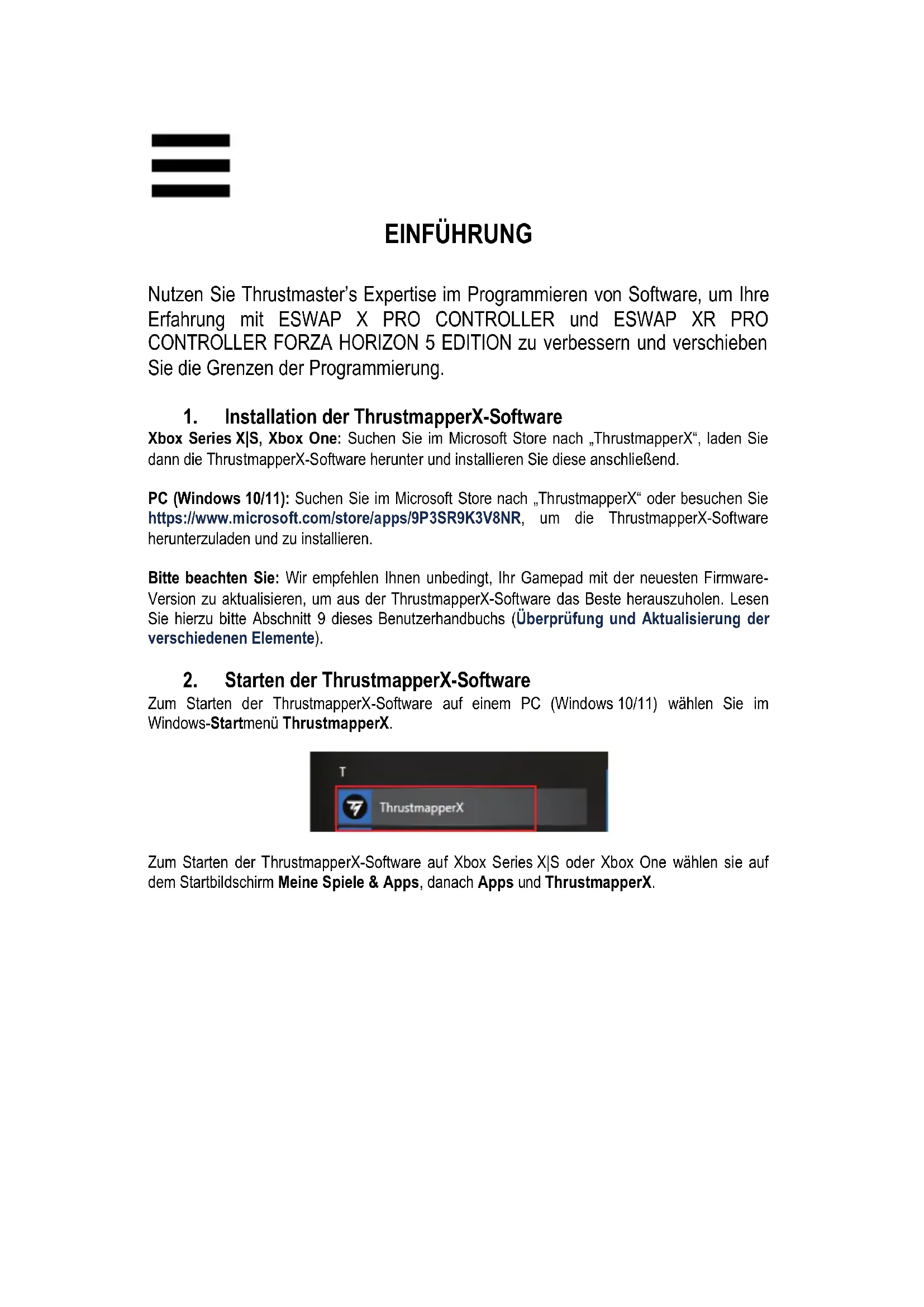 Xbox Series X|S, Xbox One: Suchen Sie im Microsoft Store nach „ThrustmapperX“, laden Sie dann die ThrustmapperX-Software herunter und installieren Sie diese anschließend. PC (Windows 10/11): Suchen Sie im Microsoft Store nach „ThrustmapperX“ oder besuchen Sie https://www.microsoft.com/store/apps/9P3SR9K3V8NR, um die ThrustmapperX-Software herunterzuladen und zu installieren. Bitte beachten Sie: Wir empfehlen Ihnen unbedingt, Ihr Gamepad mit der neuesten Firmware- Version zu aktualisieren, um aus der ThrustmapperX-Software das Beste herauszuholen. Lesen Sie hierzu bitte Abschnitt 9 dieses Benutzerhandbuchs (Überprüfung und Aktualisierung der verschiedenen Elemente).