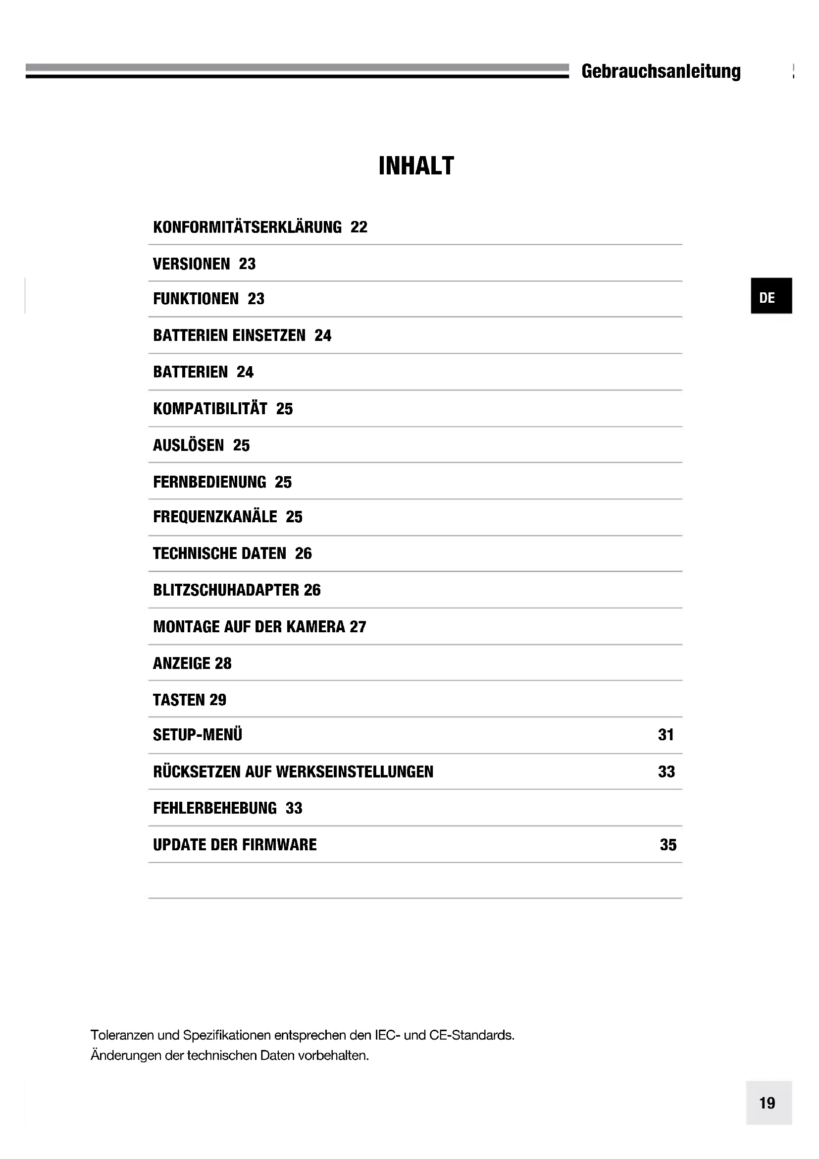 VERSIONEN 23 FUNKTIONEN 23 BATTERIEN EINSETZEN 24 BATTERIEN 24 KOMPATIBILITÄT 25 AUSLÖSEN 25 FERNBEDIENUNG 25 FREQUENZKANÄLE 25 TECHNISCHE DATEN 26 BLITZSCHUHADAPTER 26