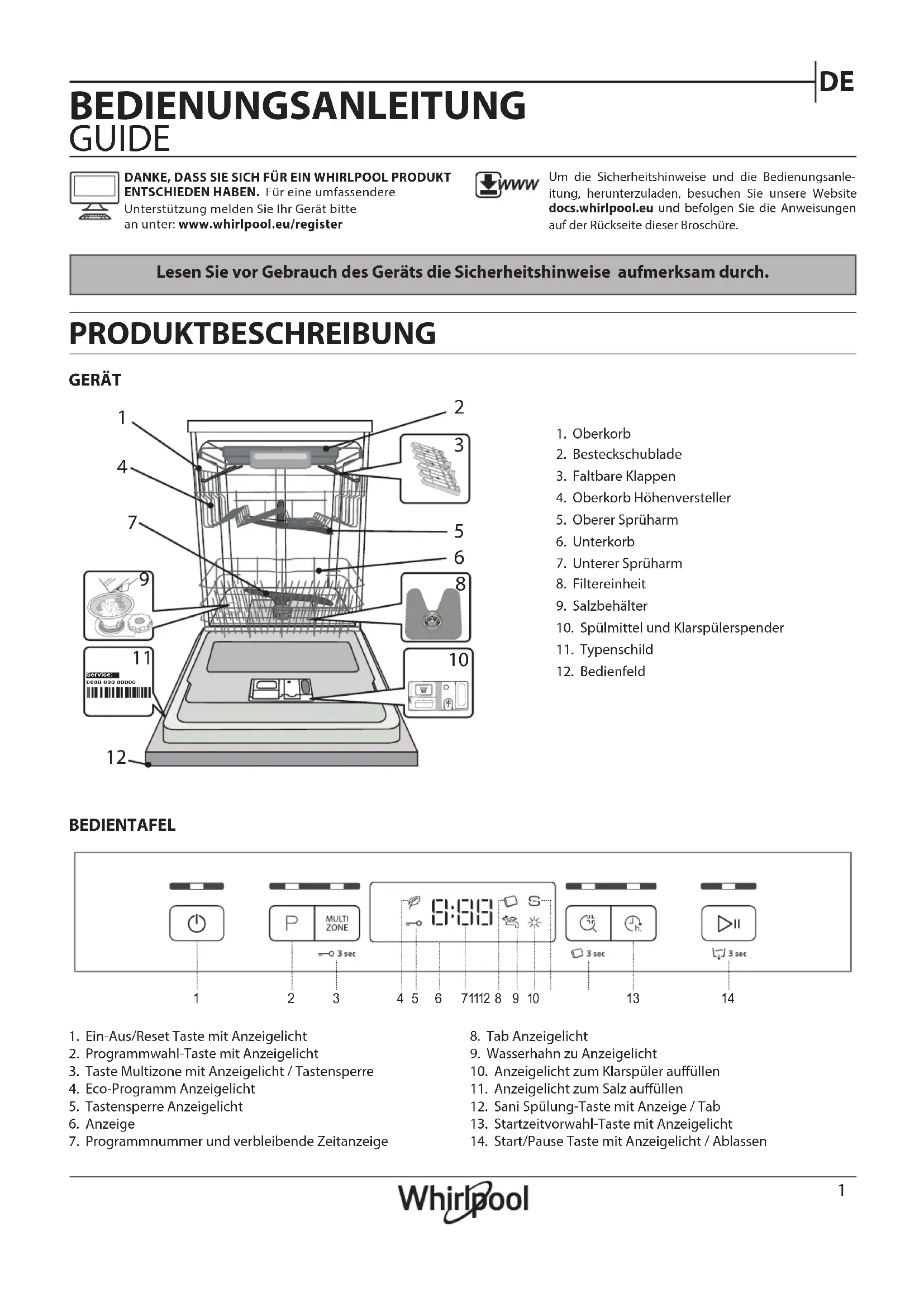 1. Ein-Aus/Reset Taste mit Anzeigelicht2. Programmwahl-Taste mit Anzeigelicht3. Taste Multizone mit Anzeigelicht / Tastensperre4. Eco-Programm Anzeigelicht5. Tastensperre Anzeigelicht6. Anzeige7. Programmnummer und verbleibende Zeitanzeige8. Tab Anzeigelicht9. Wasserhahn zu Anzeigelicht10. Anzeigelicht zum Klarspüler auüllen11. Anzeigelicht zum Salz auüllen12. Sani Spülung-Taste mit Anzeige / Tab13. Startzeitvorwahl-Taste mit Anzeigelicht14. Start/Pause Taste mit Anzeigelicht / Ablassen BEDIENTAFEL Lesen Sie vor Gebrauch des Geräts die Sicherheitshinweise aufmerksam durch. GERÄT PRODUKTBESCHREIBUNG BEDIENUNGSANLEITUNG GUIDE DANKE, DASS SIE SICH FÜR EIN WHIRLPOOL PRODUKT ENTSCHIEDEN HABEN. Für eine umfassendere Unterstützung melden Sie Ihr Gerät bittean unter: www.whirlpool.eu/registerUm die Sicherheitshinweise und die Bedienungsanle-itung, herunterzuladen, besuchen Sie unsere Website docs.whirlpool.eu und befolgen Sie die Anweisungen auf der Rückseite dieser Broschüre.1. Oberkorb2. Besteckschublade3. Faltbare Klappen4. Oberkorb Höhenversteller5. Oberer Sprüharm6. Unterkorb7. Unterer Sprüharm8. Filtereinheit9. Salzbehälter10. Spülmittel und Klarspülerspender11. Typenschild12. Bedienfeld