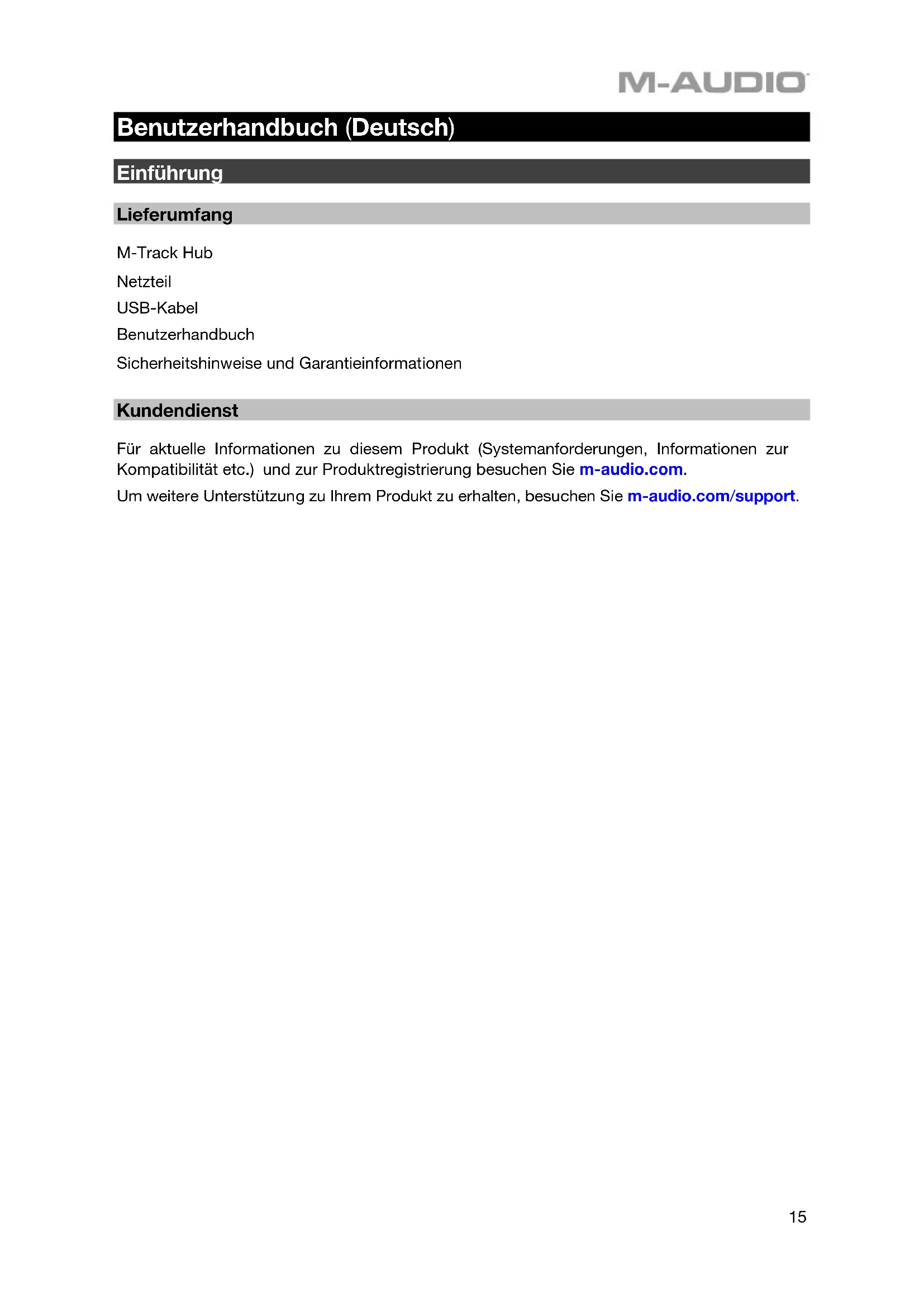 Benutzerhandbuch (Deutsch) Einführung Lieferumfang M-Track Hub Netzteil USB-Kabel Benutzerhandbuch Sicherheitshinweise und Garantieinformationen Kundendienst Für aktuelle Informationen zu diesem Produkt (Systemanforderungen, Informationen zur Kompatibilität etc.) und zur Produktregistrierung besuchen Sie m-audio.com. Um weitere Unterstützung zu Ihrem Produkt zu erhalten, besuchen Sie m-audio.com/support.16
