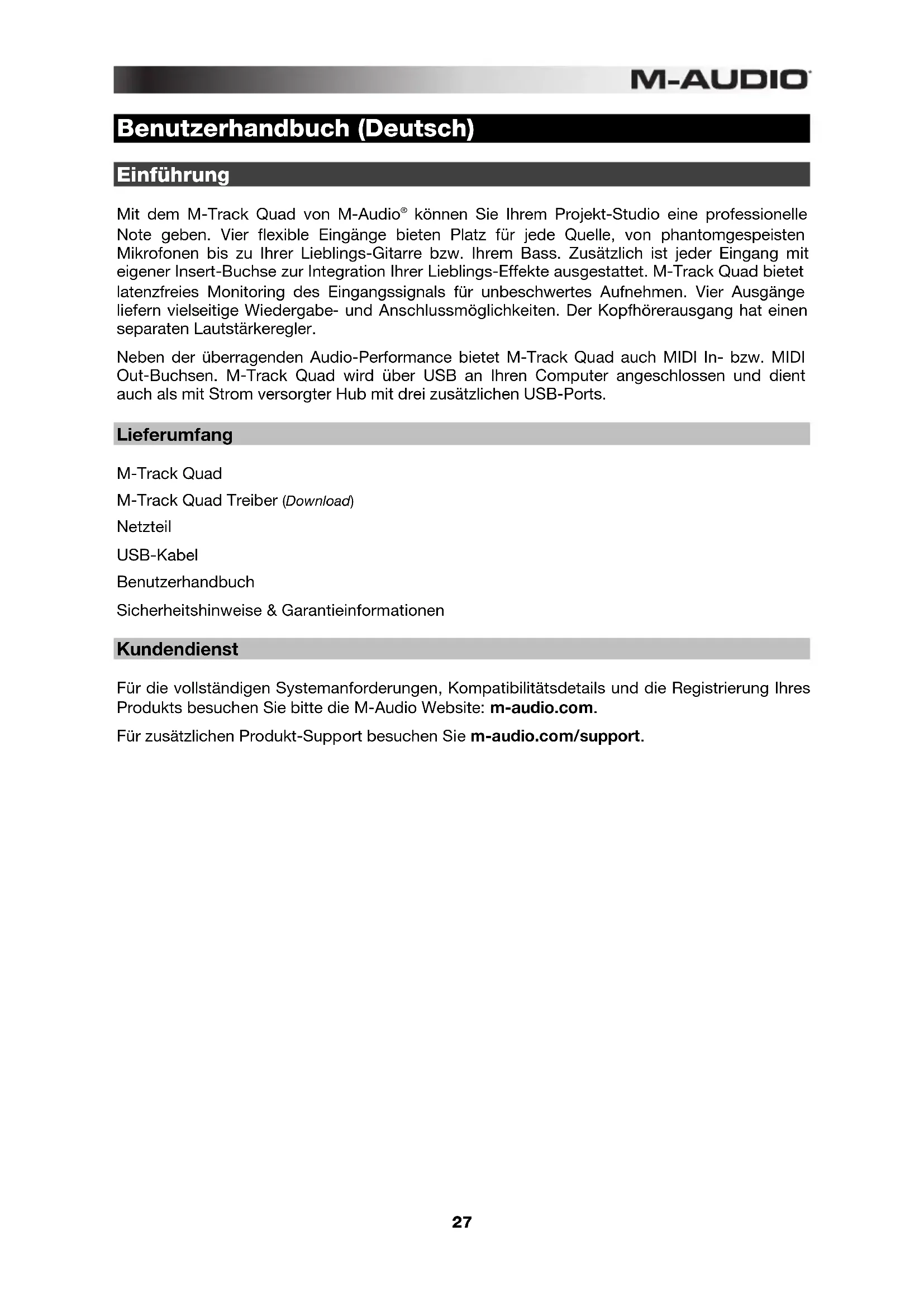 können Sie Ihrem Projekt-Studio eine professionelle Note geben. Vier flexible Eingänge bieten Platz für jede Quelle, von phantomgespeisten Mikrofonen bis zu Ihrer Lieblings-Gitarre bzw. Ihrem Bass. Zusätzlich ist jeder Eingang mit eigener Insert-Buchse zur Integration Ihrer Lieblings-Effekte ausgestattet. M-Track Quad bietet latenzfreies Monitoring des Eingangssignals für unbeschwertes Aufnehmen. Vier Ausgänge liefern vielseitige Wiedergabe- und Anschlussmöglichkeiten. Der Kopfhörerausgang hat einen separaten Lautstärkeregler. Neben der überragenden Audio-Performance bietet M-Track Quad auch MIDI In- bzw. MIDI Out-Buchsen. M-Track Quad wird über USB an Ihren Computer angeschlossen und dient auch als mit Strom versorgter Hub mit drei zusätzlichen USB-Ports. Lieferumfang M-Track Quad M-Track Quad Treiber (Download) Netzteil USB-Kabel Benutzerhandbuch Sicherheitshinweise & Garantieinformationen Kundendienst Für die vollständigen Systemanforderungen, Kompatibilitätsdetails und die Registrierung Ihres Produkts besuchen Sie bitte die M-Audio Website: m-audio.com. Für zusätzlichen Produkt-Support besuchen Sie m-audio.com/support.28