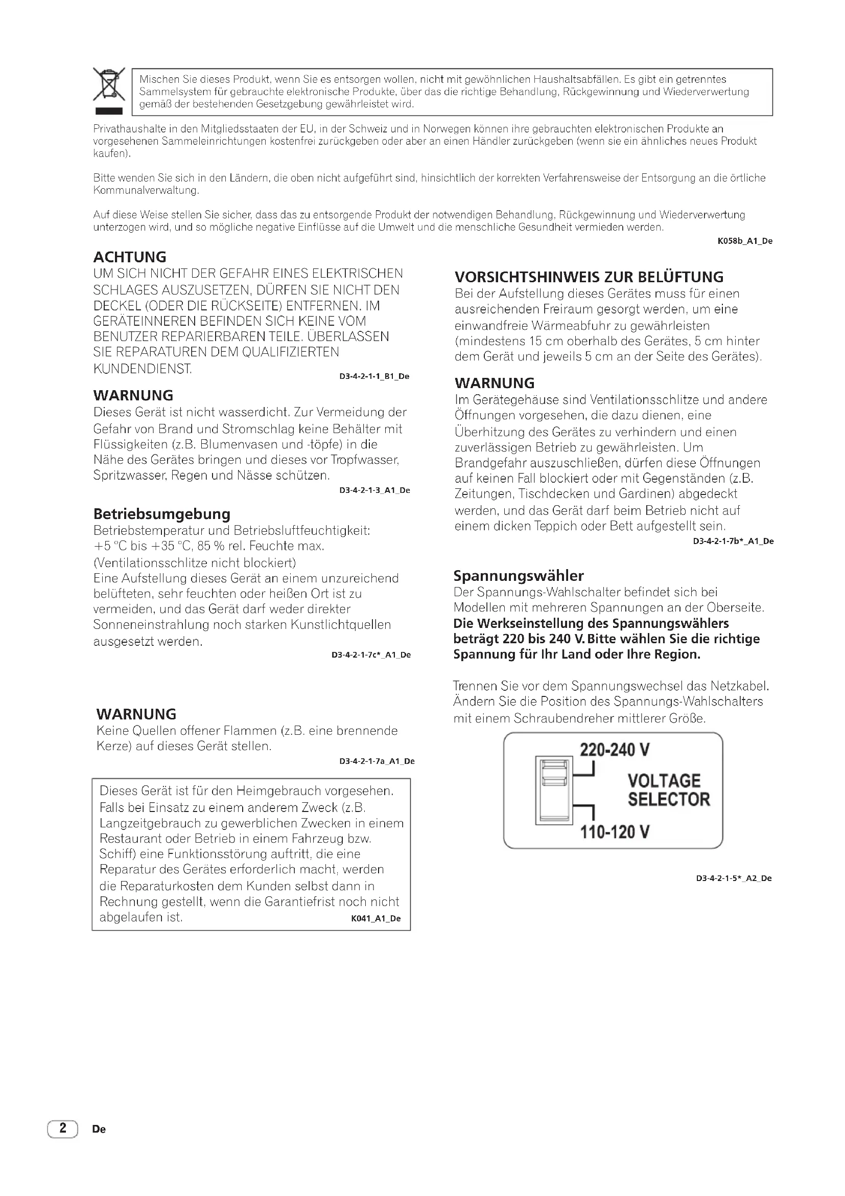 KUNDENDIENST. D3-4-2-1-1_B1_De WARNUNG Dieses Gerät ist nicht wasserdicht. Zur Vermeidung der Gefahr von Brand und Stromschlag keine Behälter mit Flüssigkeiten (z.B. Blumenvasen und -töpfe) in die Nähe des Gerätes bringen und dieses vor Tropfwasser, Spritzwasser, Regen und Nässe schützen. D3-4-2-1-3_A1_De WARNUNG Keine Quellen offener Flammen (z.B. eine brennende Kerze) auf dieses Gerät stellen. D3-4-2-1-7a_A1_De Betriebsumgebung Betriebstemperatur und Betriebsluftfeuchtigkeit: +5 °C bis +35 °C, 85 % rel. Feuchte max. (Ventilationsschlitze nicht blockiert) Eine Aufstellung dieses Gerät an einem unzureichend belüfteten, sehr feuchten oder heißen Ort ist zu vermeiden, und das Gerät darf weder direkter Sonneneinstrahlung noch starken Kunstlichtquellen ausgesetzt werden. D3-4-2-1-7c*_A1_De Dieses Gerät ist für den Heimgebrauch vorgesehen. Falls bei Einsatz zu einem anderem Zweck (z.B. Langzeitgebrauch zu gewerblichen Zwecken in einem Restaurant oder Betrieb in einem Fahrzeug bzw. Schiff) eine Funktionsstörung auftritt, die eine Reparatur des Gerätes erforderlich macht, werden die Reparaturkosten dem Kunden selbst dann in Rechnung gestellt, wenn die Garantiefrist noch nicht abgelaufen ist. K041_A1_De Mischen Sie dieses Produkt, wenn Sie es entsorgen wollen, nicht mit gewöhnlichen Haushaltsabfällen. Es gibt ein getrenntes Sammelsystem für gebrauchte elektronische Produkte, über das die richtige Behandlung, Rückgewinnung und Wiederverwertung gemäß der bestehenden Gesetzgebung gewährleistet wird. Privathaushalte in den Mitgliedsstaaten der EU, in der Schweiz und in Norwegen können ihre gebrauchten elektronischen Produkte an vorgesehenen Sammeleinrichtungen kostenfrei zurückgeben oder aber an einen Händler zurückgeben (wenn sie ein ähnliches neues Produkt kaufen). Bitte wenden Sie sich in den Ländern, die oben nicht aufgeführt sind, hinsichtlich der korrekten Verfahrensweise der Entsorgung an die örtliche Kommunalverwaltung. Auf diese Weise stellen Sie sicher, dass das zu entsorgende Produkt der notwendigen Behandlung, Rückgewinnung und Wiederverwertung unterzogen wird, und so mögliche negative Einflüsse auf die Umwelt und die menschliche Gesundheit vermieden werden. K058b_A1_De